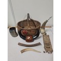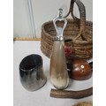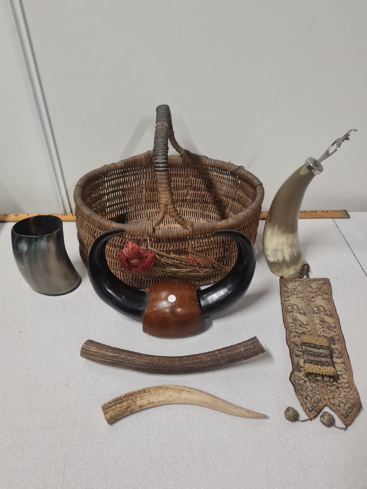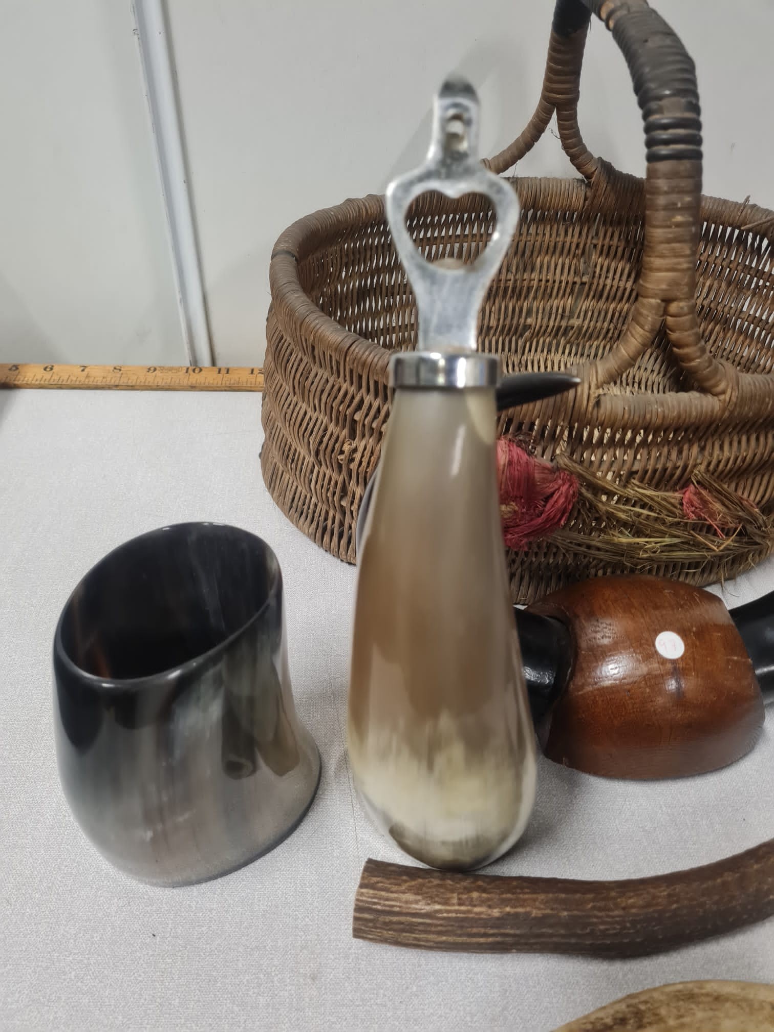 Vintage woven basket with assorted bone & horn items too include bottle opener etc.