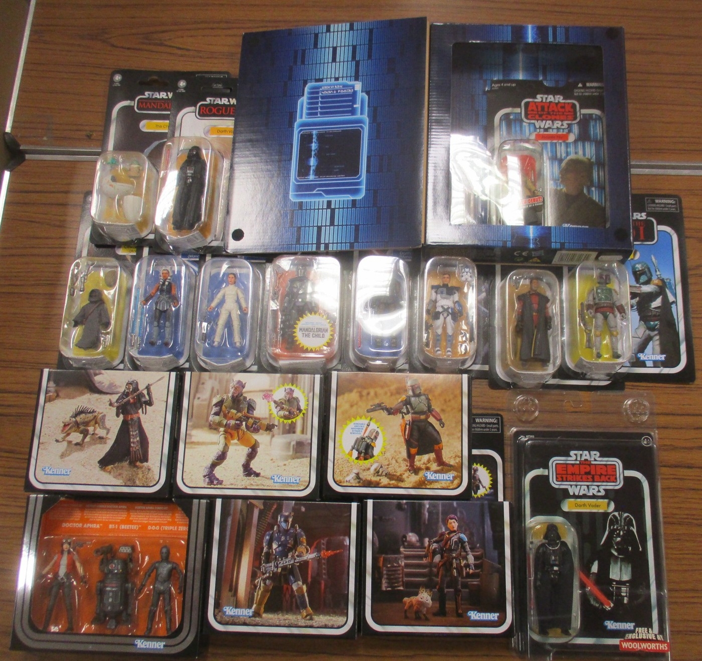 Star Wars. Hasbro. Collection of The Vintage Collection figures, generally mint in excellent to near mint bubble packs, includes Darth Vader in Woolworths plastic packaging, Jocasta Nu, plus ranges of The Mandalorian, Book of Boba Fett, etc. Qty 18 (B)