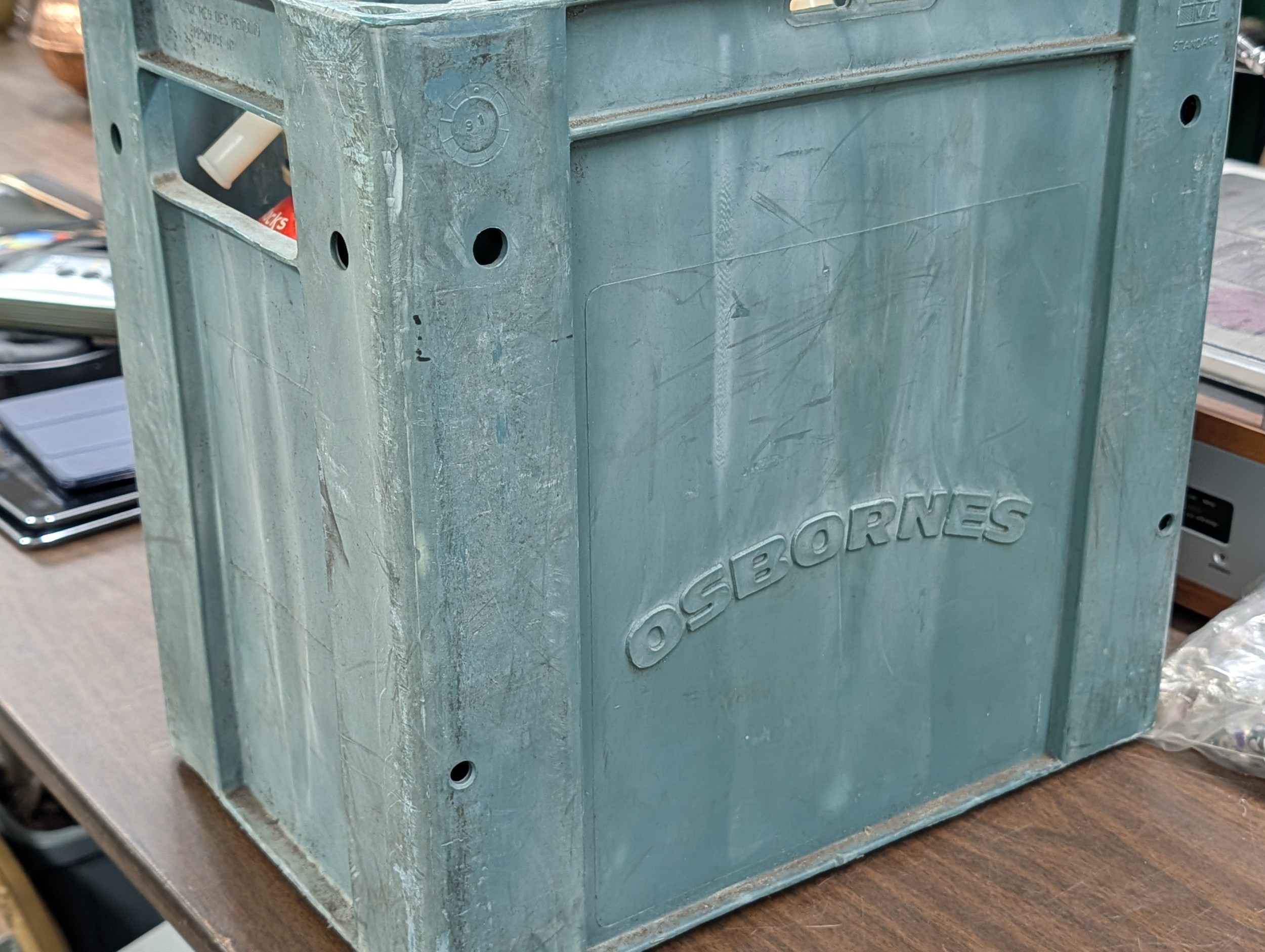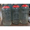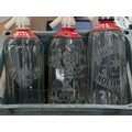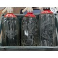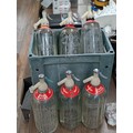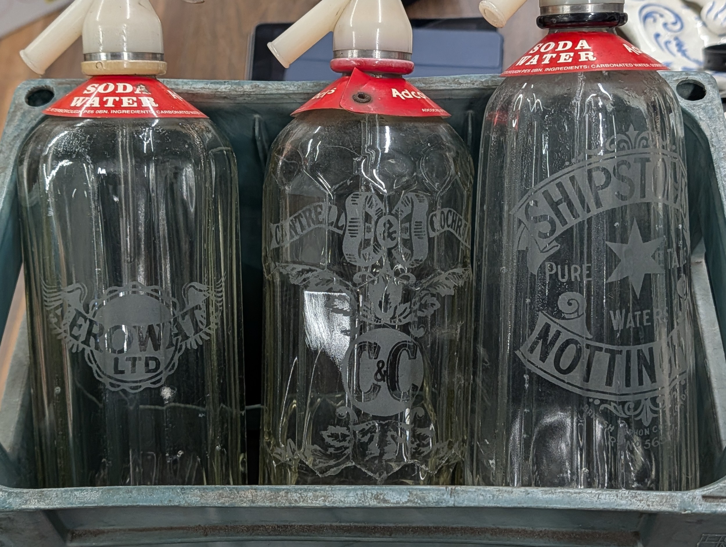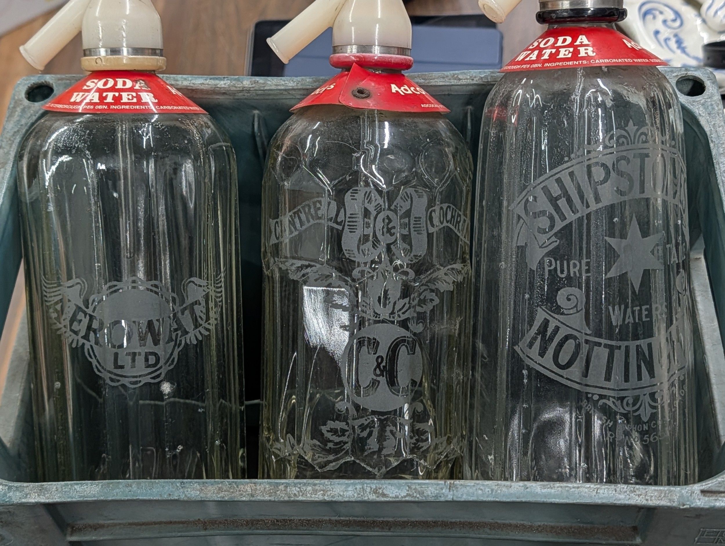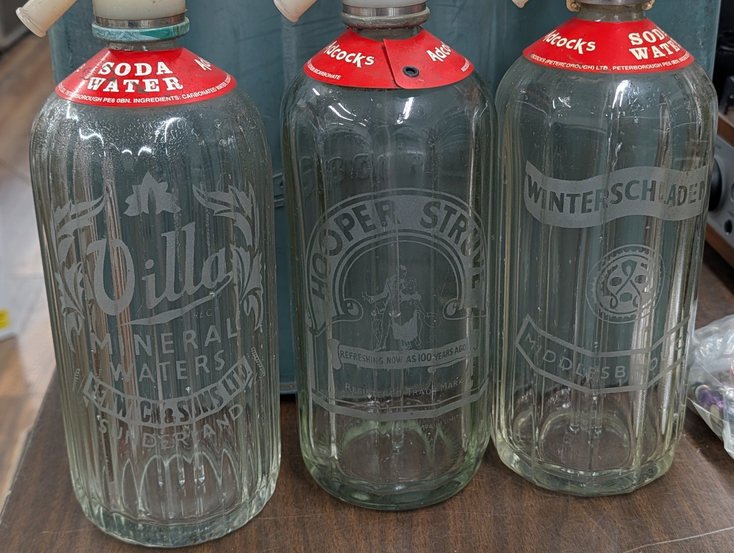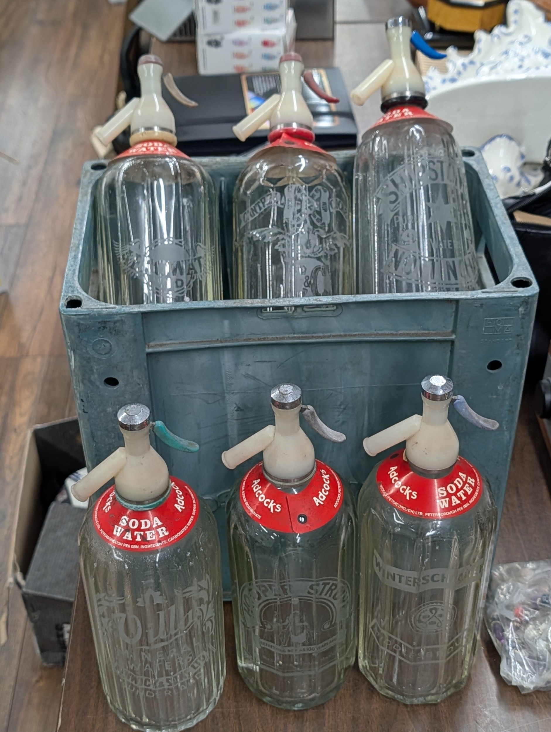 Collection of Six Vintage British Etched Glass Soda Siphons in a Plastic Crate