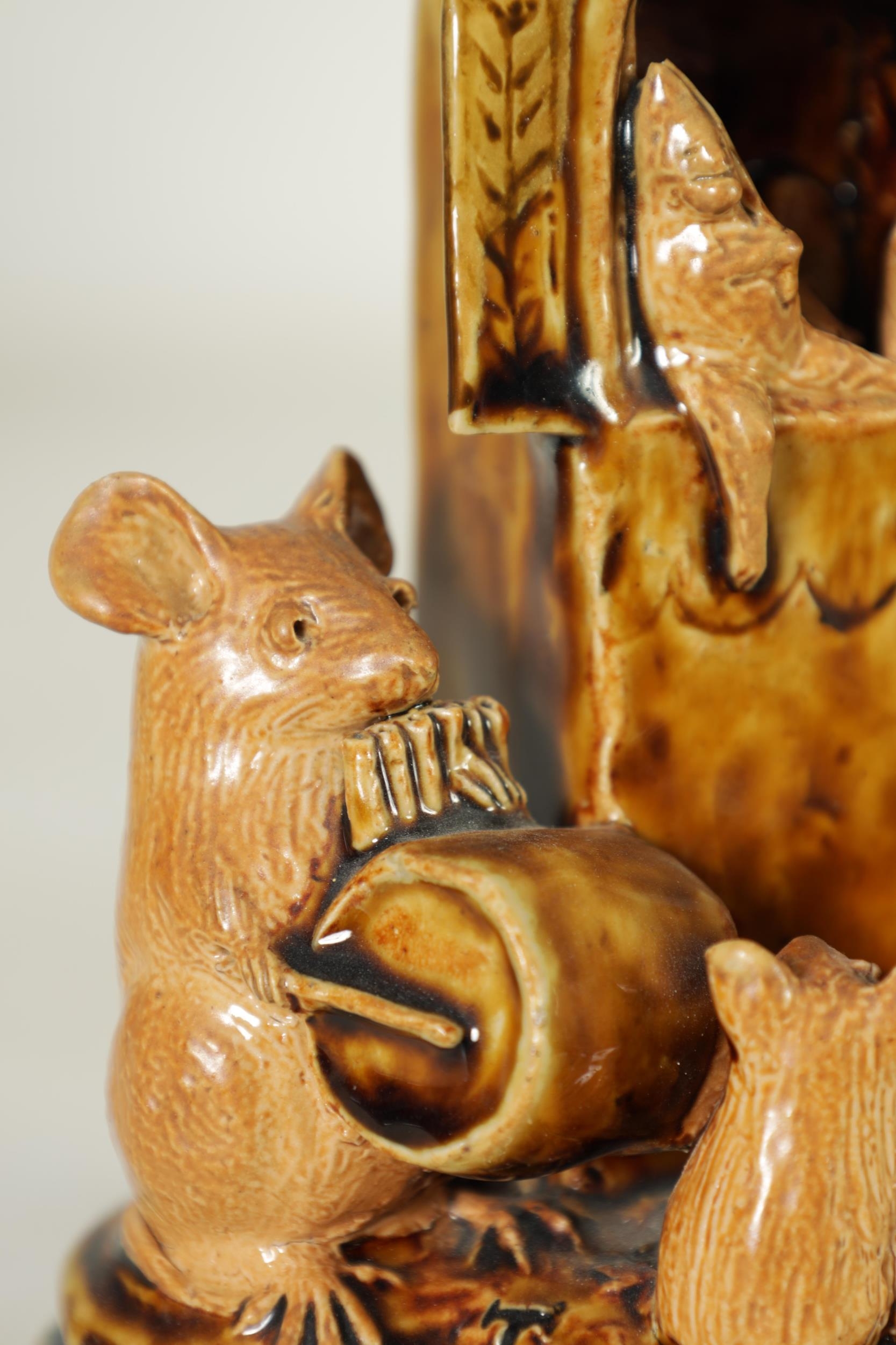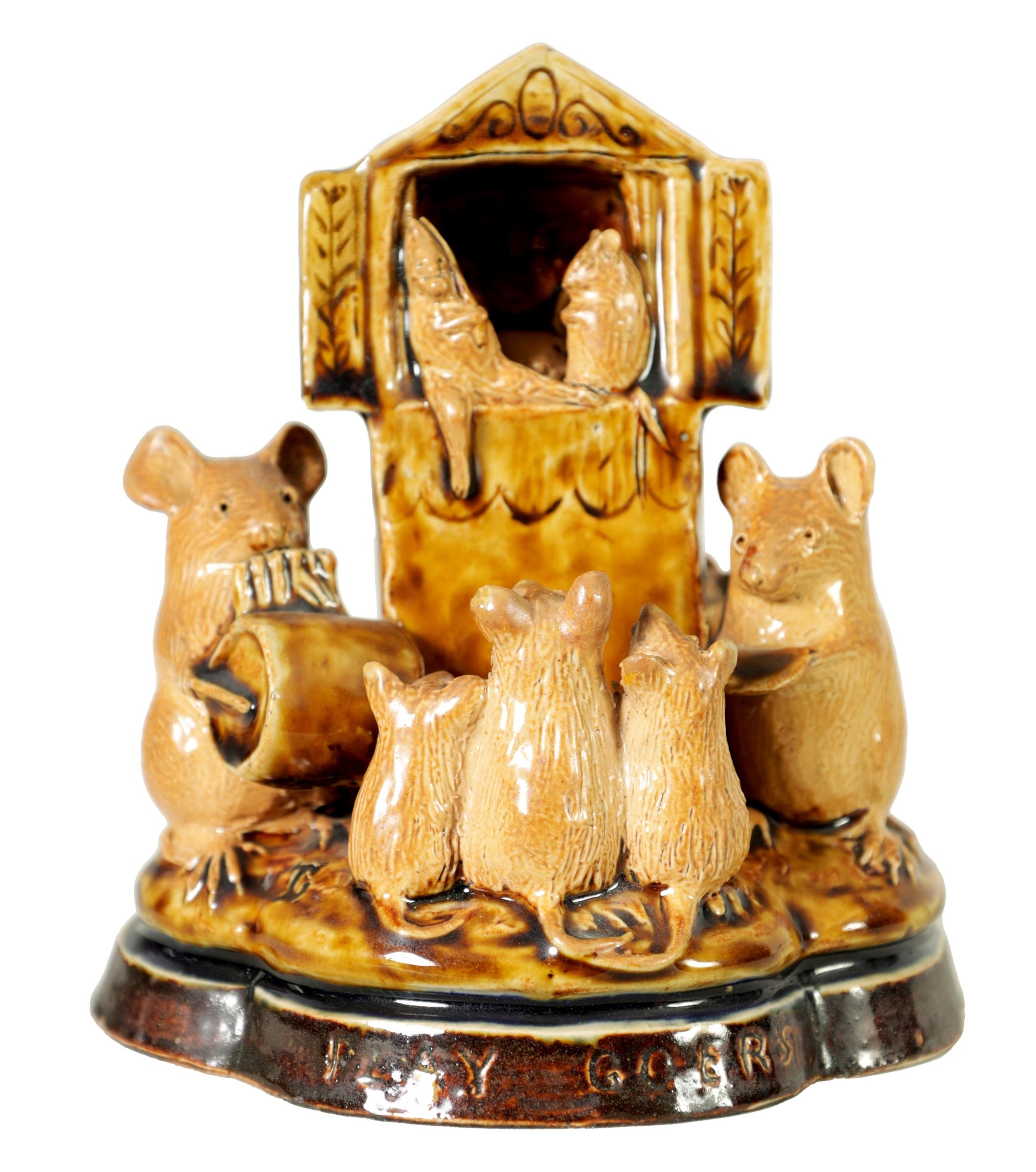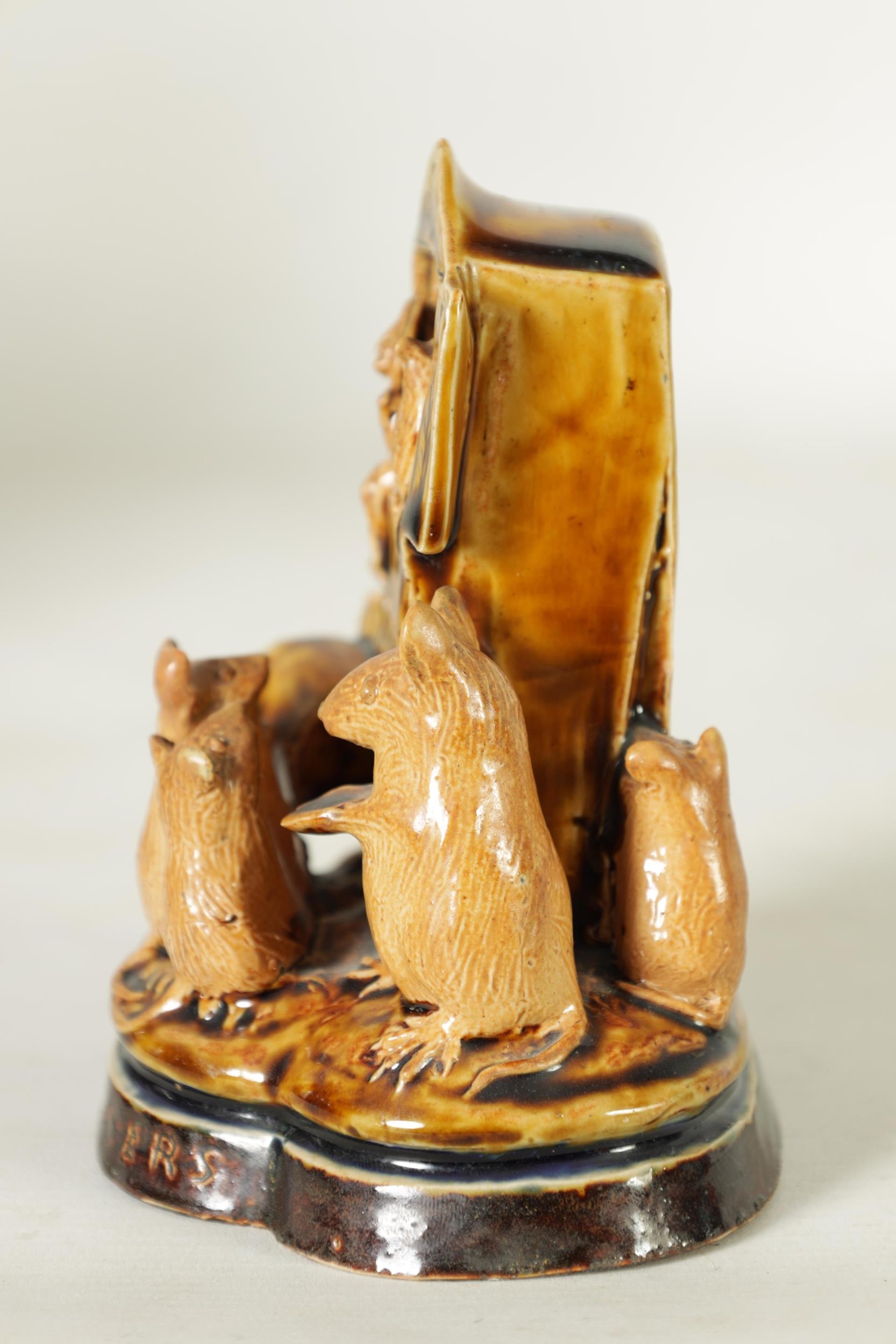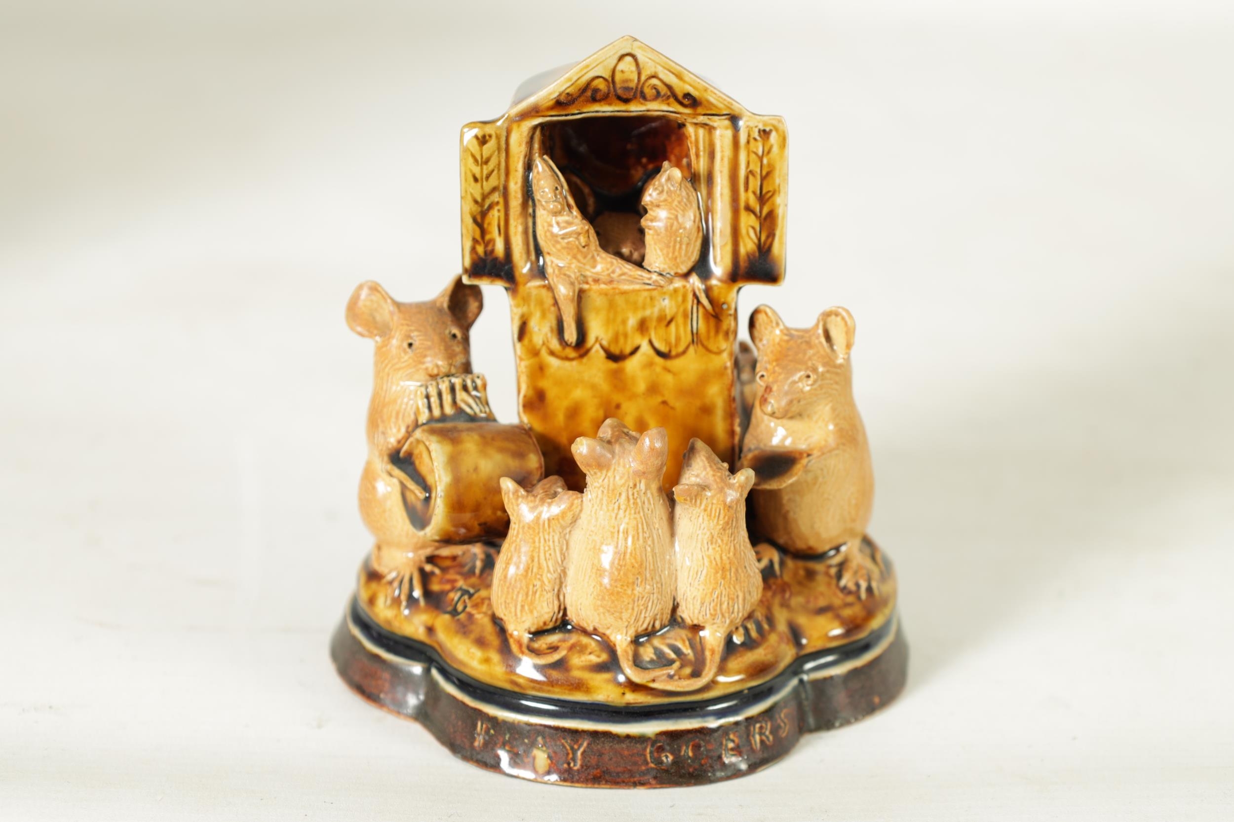 A DOULTON LAMBETH TWO-TONE SHADED BROWN SALT GLAZED 'PLAY GOERS' GROUP OF MICE BY GEORGE TINWORTH CIRCA 1880'S modelled as a centre column depicting 'Punch and Judy' above six mice to the base, one playing pipes and drum, on a shaped front brown incised moulded base - bears two incised monogram signatures. (14cm high)