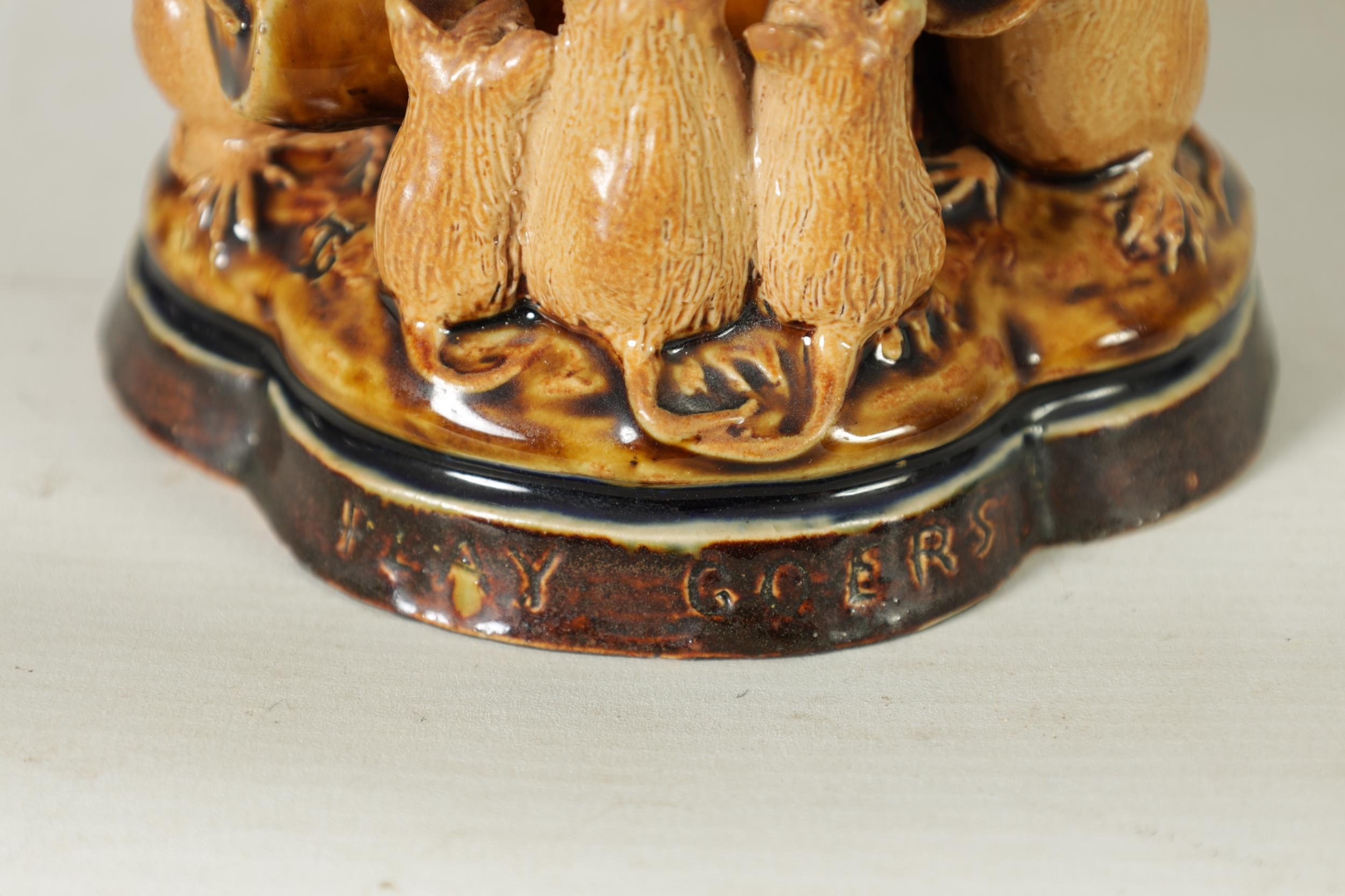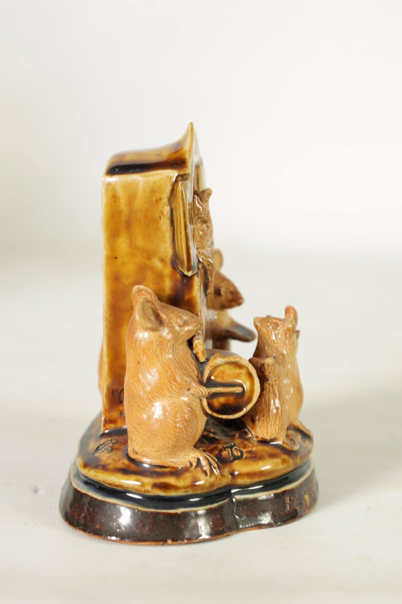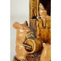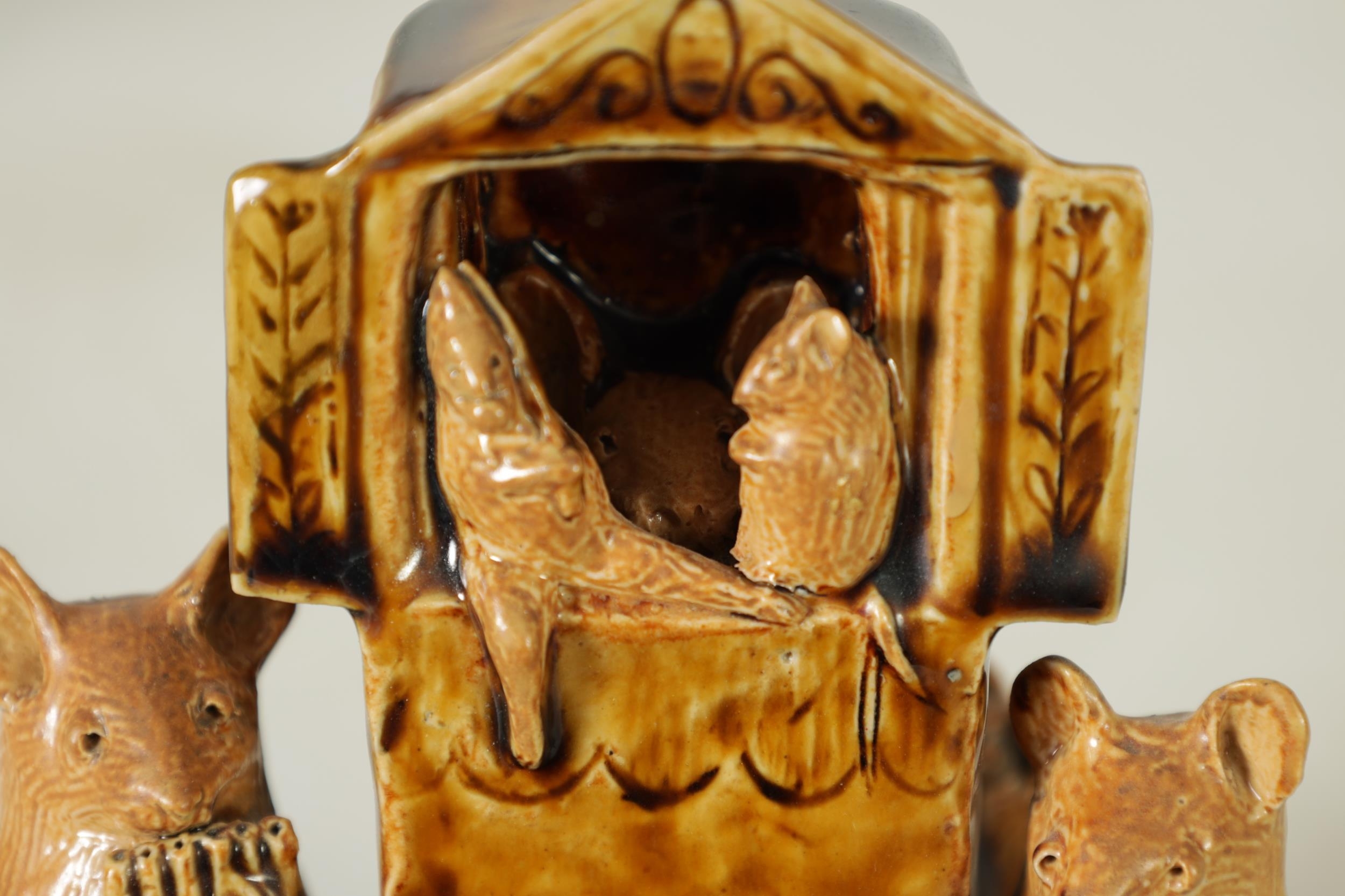 A DOULTON LAMBETH TWO-TONE SHADED BROWN SALT GLAZED 'PLAY GOERS' GROUP OF MICE BY GEORGE TINWORTH CIRCA 1880'S modelled as a centre column depicting 'Punch and Judy' above six mice to the base, one playing pipes and drum, on a shaped front brown incised moulded base - bears two incised monogram signatures. (14cm high)