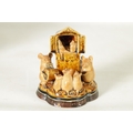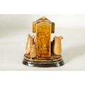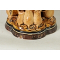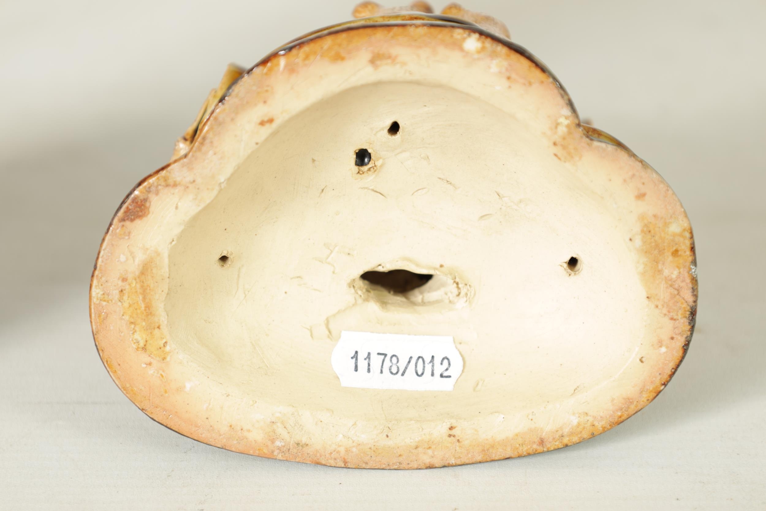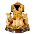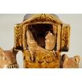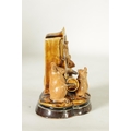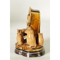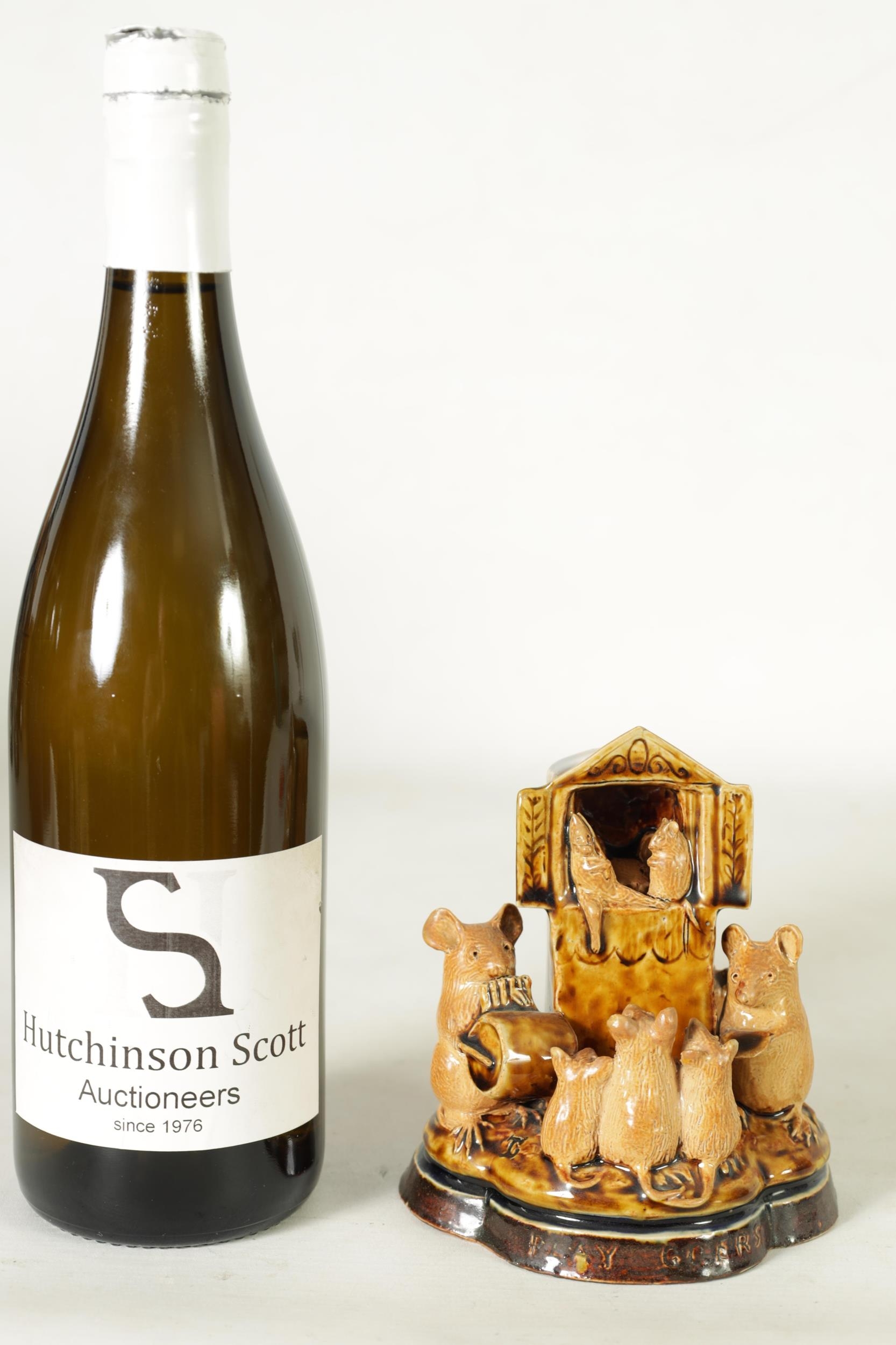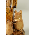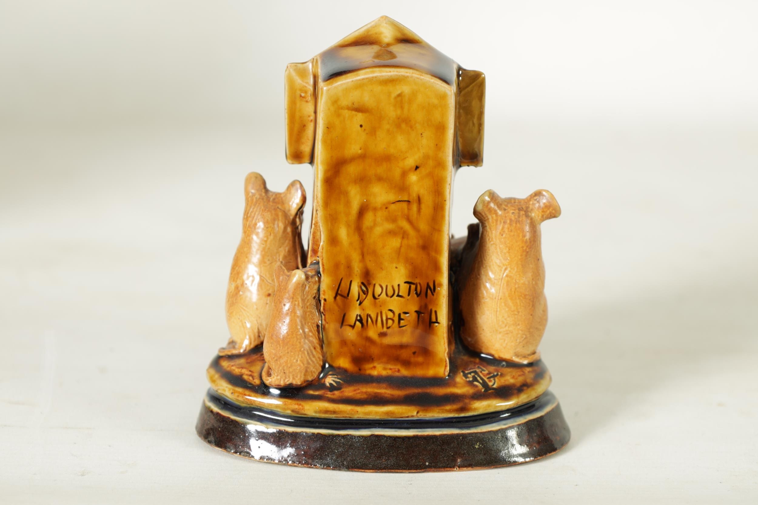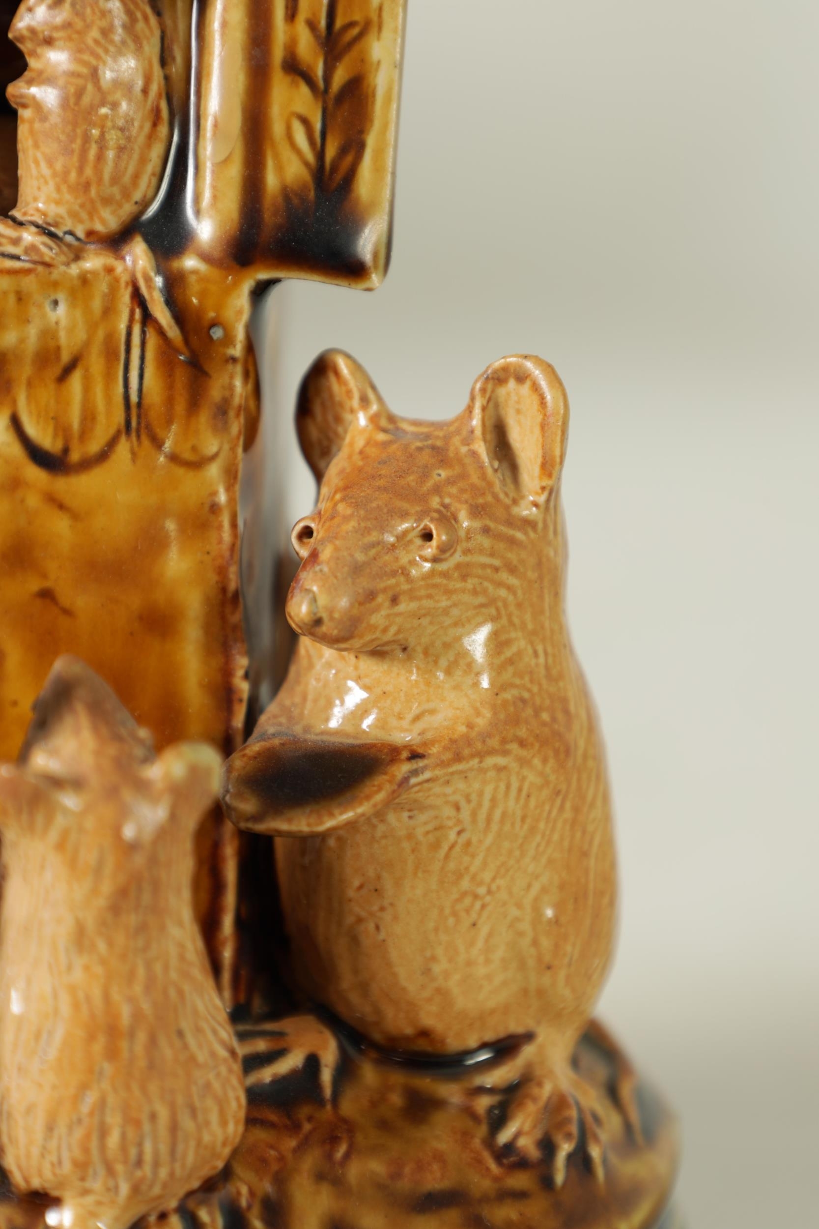 A DOULTON LAMBETH TWO-TONE SHADED BROWN SALT GLAZED 'PLAY GOERS' GROUP OF MICE BY GEORGE TINWORTH CIRCA 1880'S modelled as a centre column depicting 'Punch and Judy' above six mice to the base, one playing pipes and drum, on a shaped front brown incised moulded base - bears two incised monogram signatures. (14cm high)