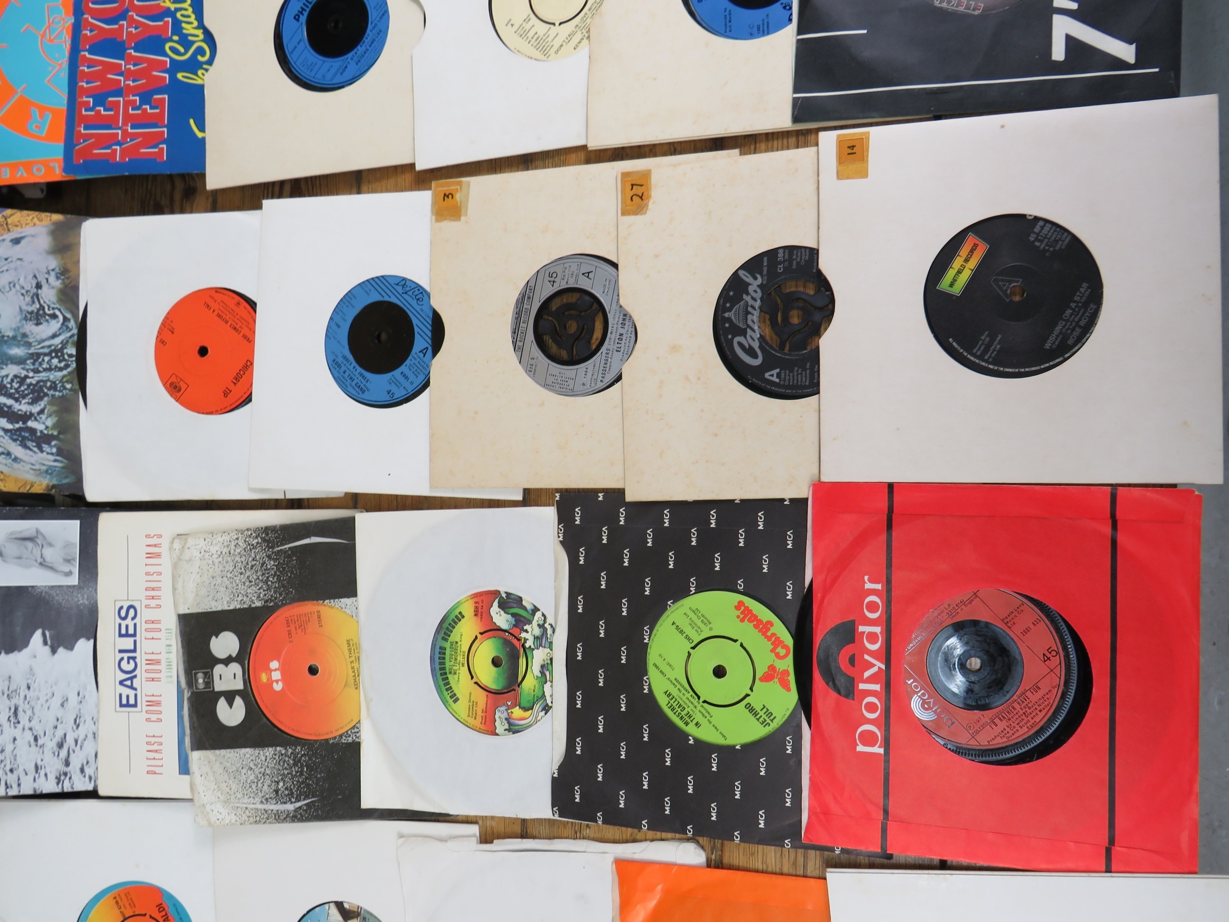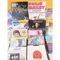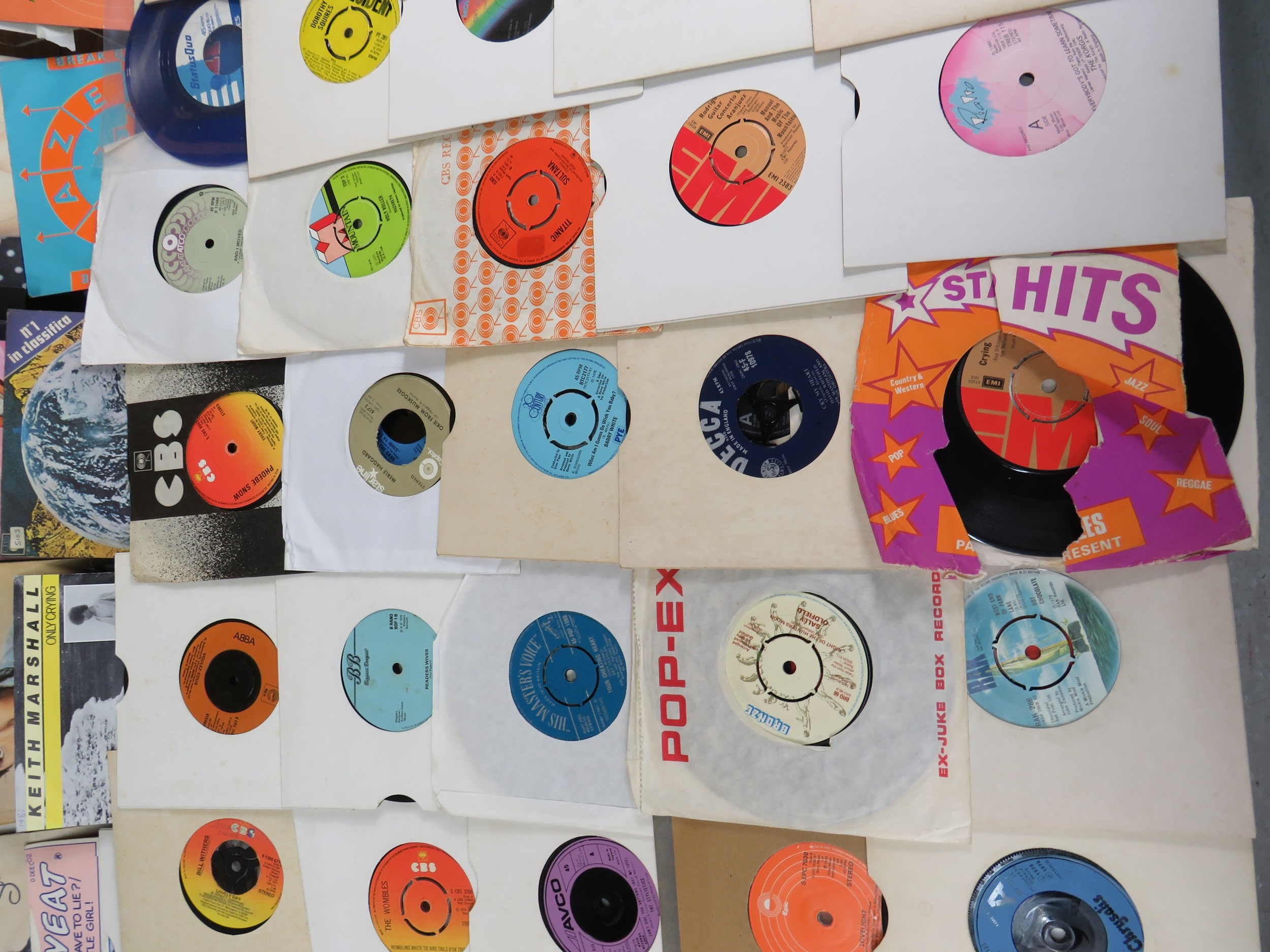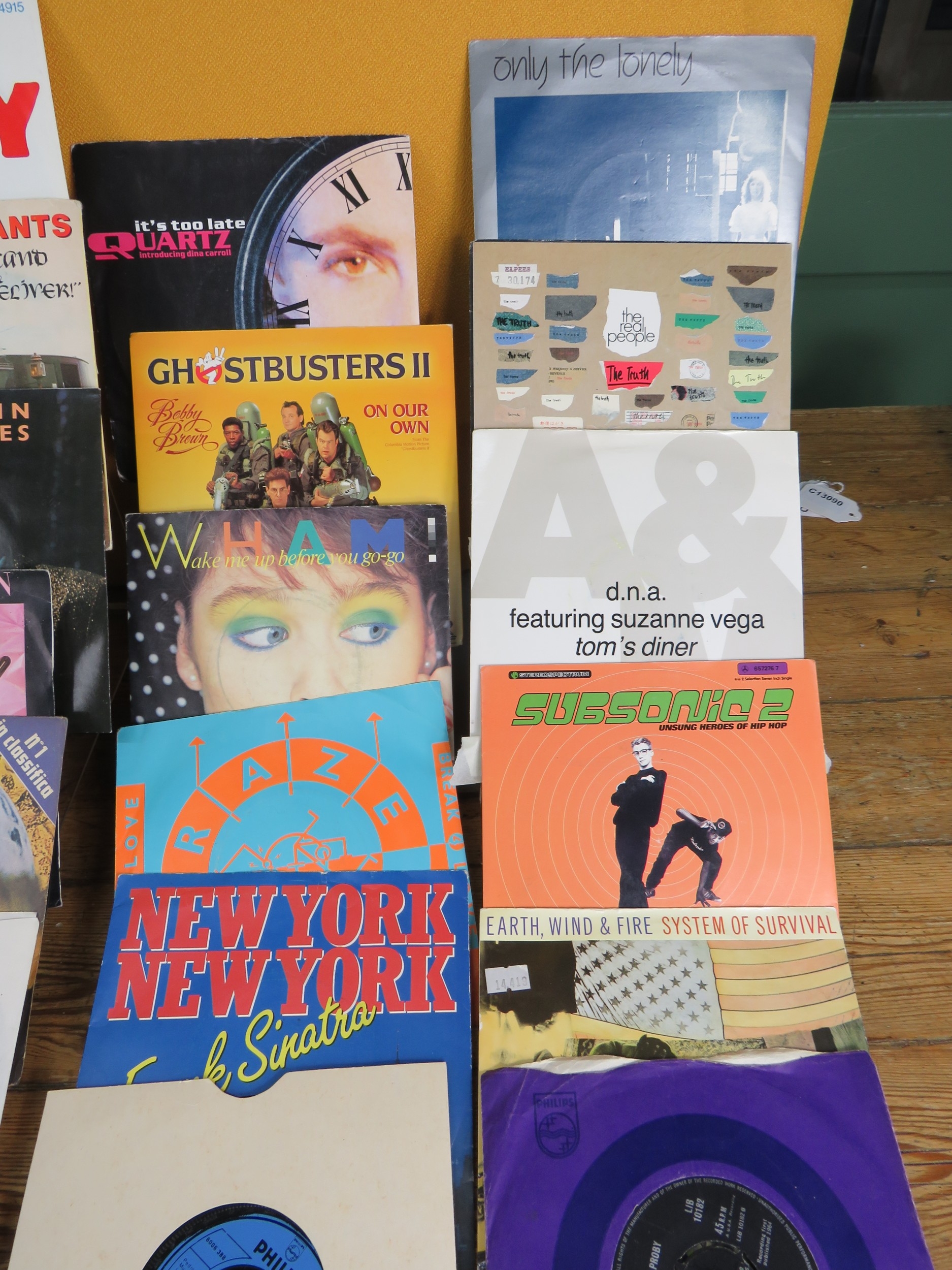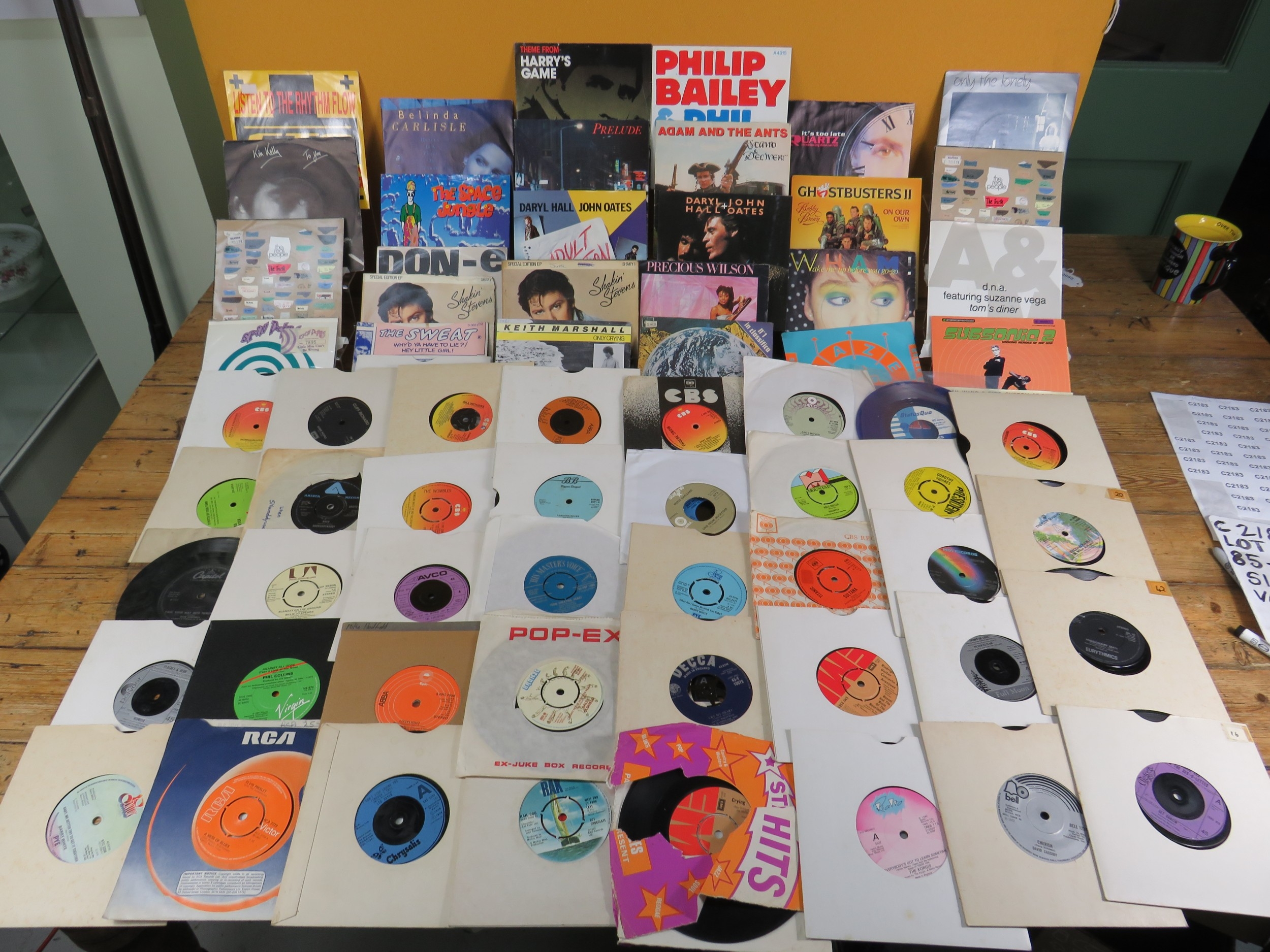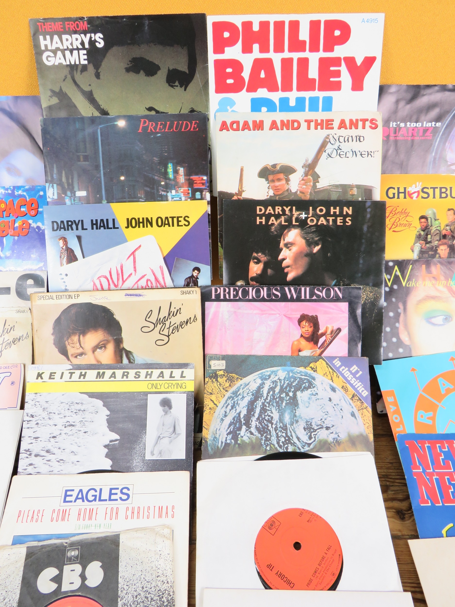 Large collection of 85+ vinyl 7-inch singles (45 RPM records) featuring various artists predominantly from the 1970s-1990s. Visible titles include Philip Bailey, Adam and the Ants, Harry's Game, Daryl Hall & John Oates, Belinda Carlisle, Ghostbusters II soundtrack, Naughty Naughty compilation, Prince, DNA featuring Suzanne Vega Tom's Diner, and numerous others. The collection spans pop, rock, soul, new wave, and synth-pop genres. Singles displayed in varied sleeves including picture sleeves and plain company sleeves showing wear, tears, and aging. Labels visible include RCA, Pop-Ex, Polydor, CBS, various compilation series, and many others. Vinyl condition varies and is unverified. A diverse bulk lot of 85+ singles suitable for collectors or resale.