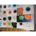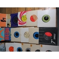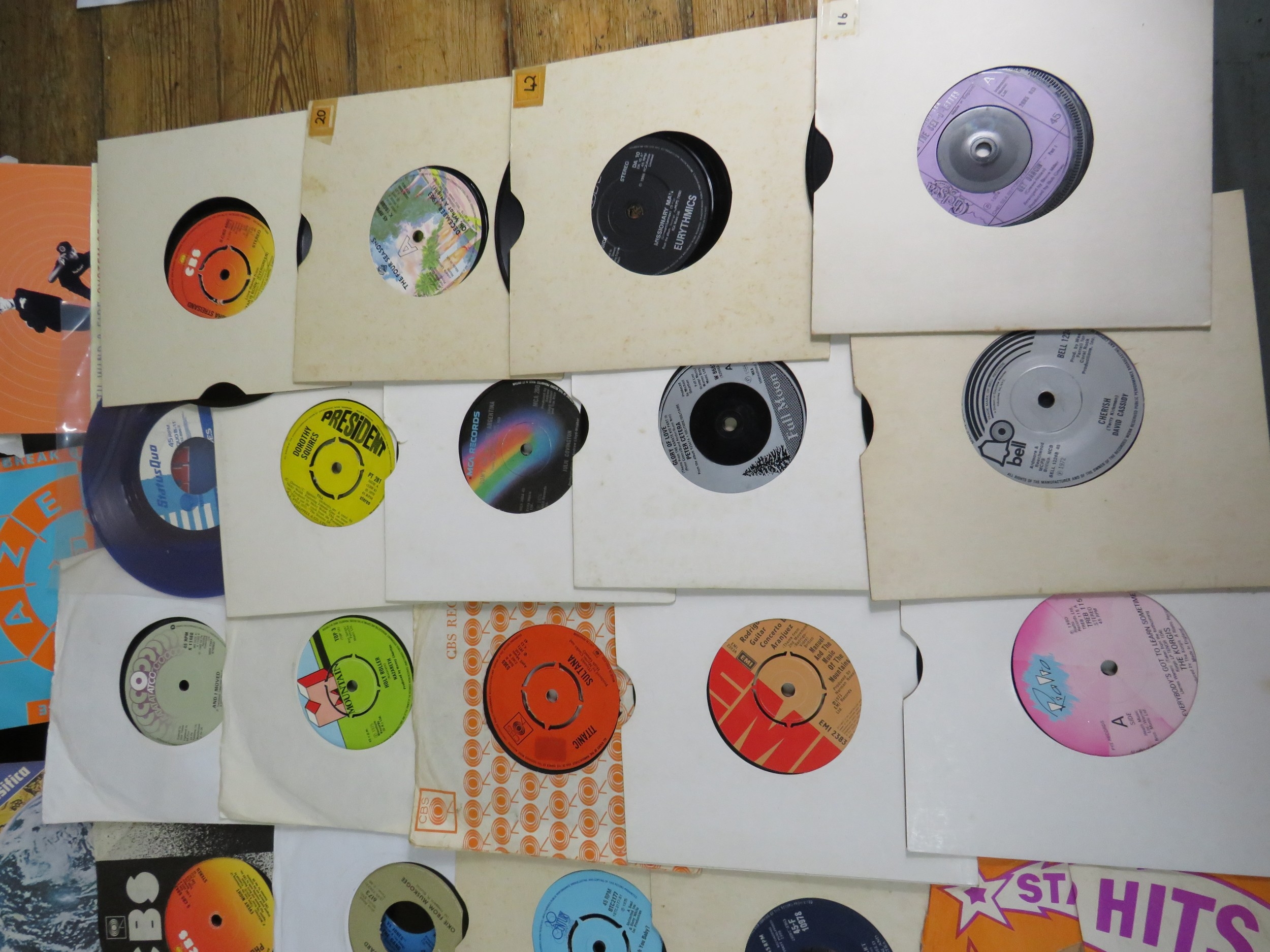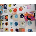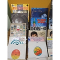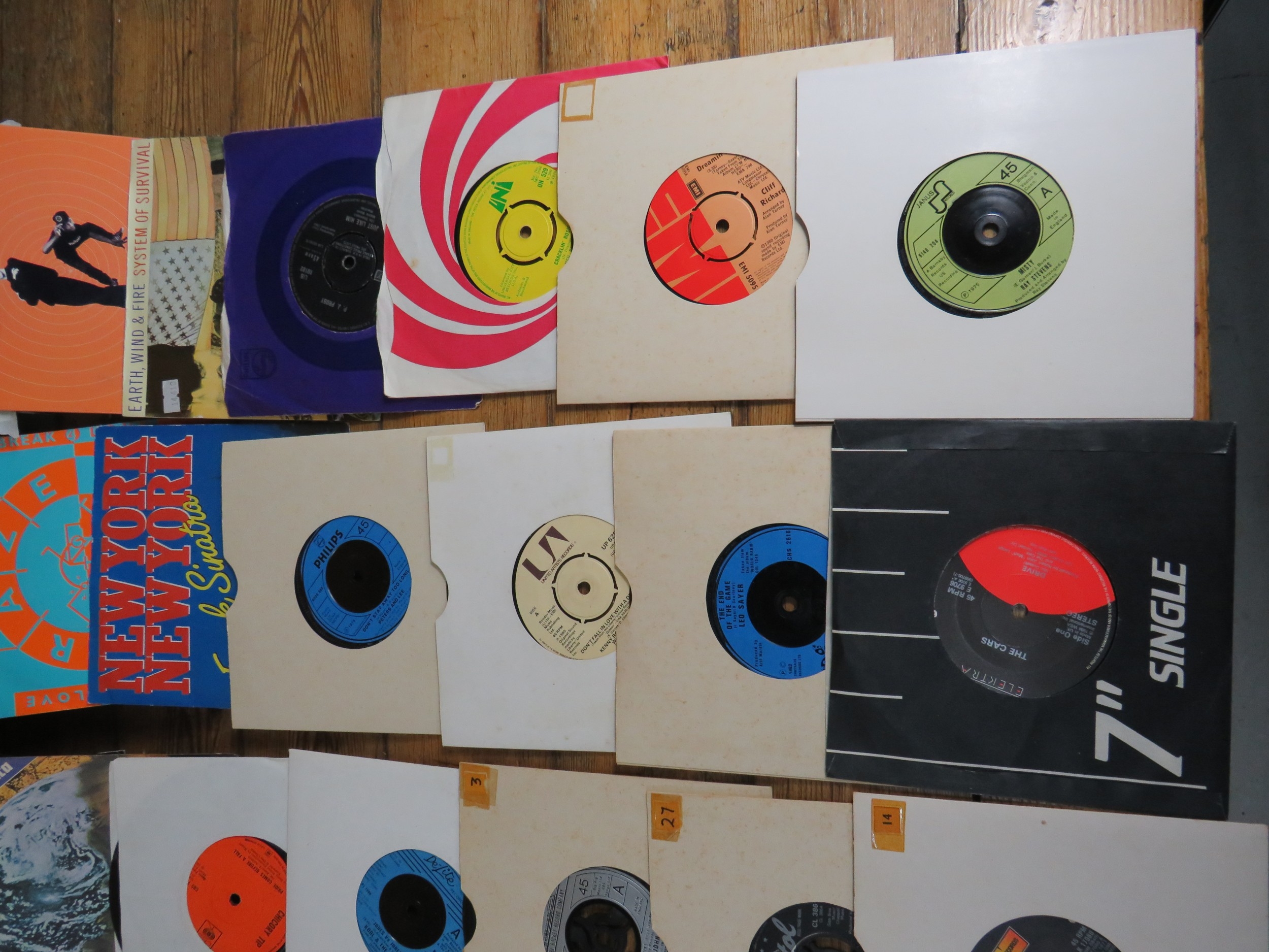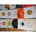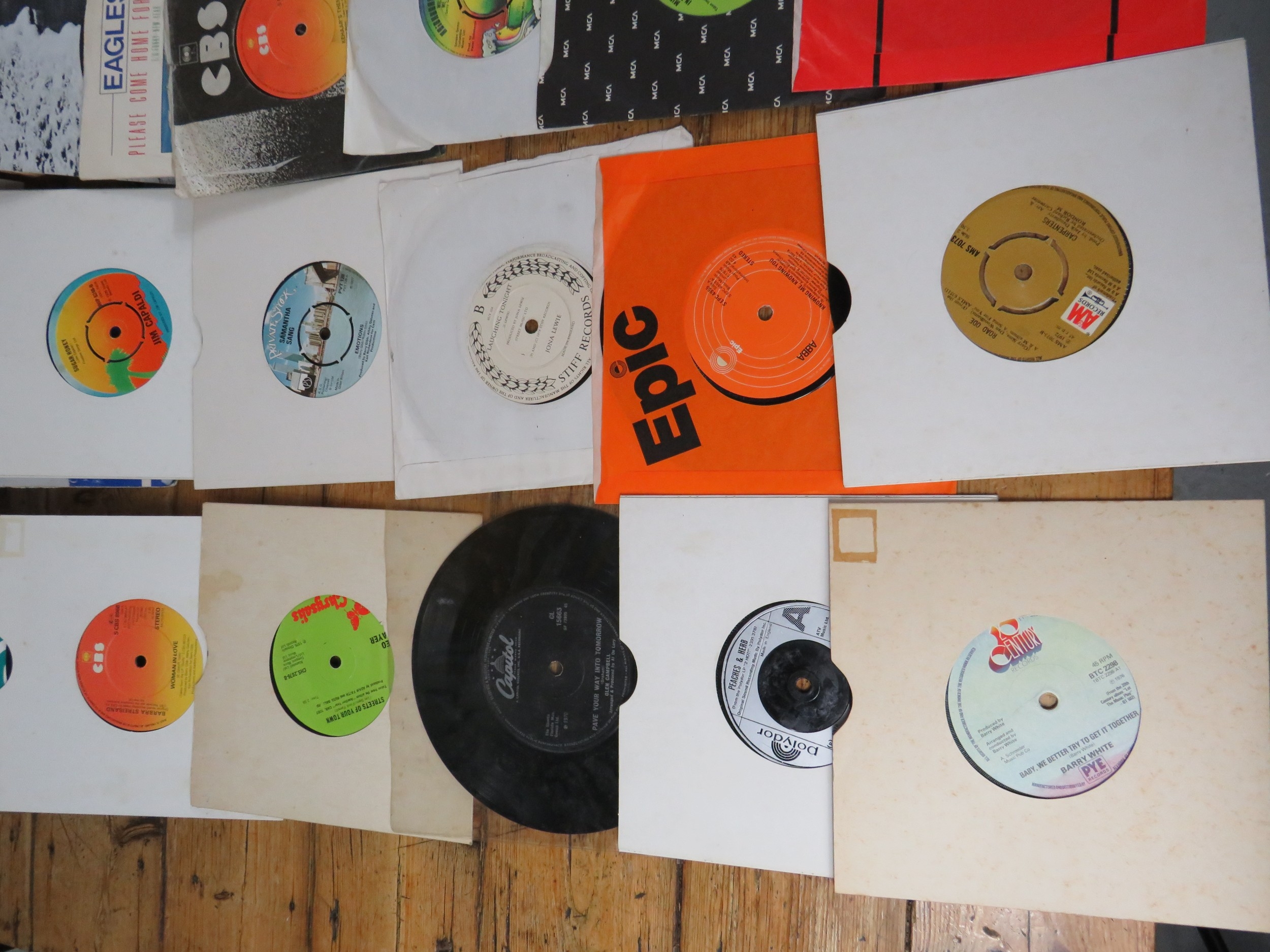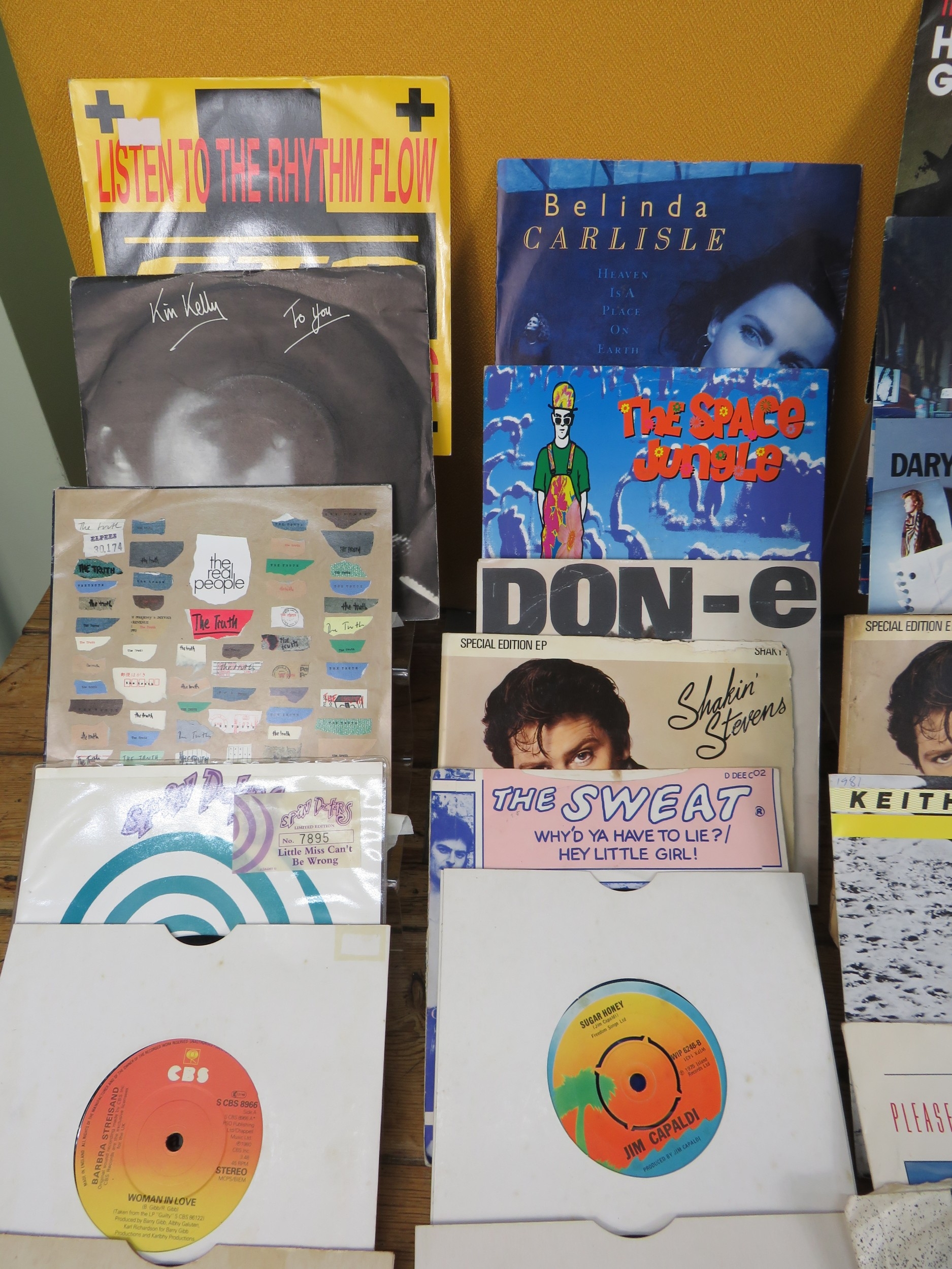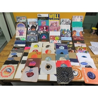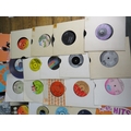 Large collection of 85+ vinyl 7-inch singles (45 RPM records) featuring various artists predominantly from the 1970s-1990s. Visible titles include Philip Bailey, Adam and the Ants, Harry's Game, Daryl Hall & John Oates, Belinda Carlisle, Ghostbusters II soundtrack, Naughty Naughty compilation, Prince, DNA featuring Suzanne Vega Tom's Diner, and numerous others. The collection spans pop, rock, soul, new wave, and synth-pop genres. Singles displayed in varied sleeves including picture sleeves and plain company sleeves showing wear, tears, and aging. Labels visible include RCA, Pop-Ex, Polydor, CBS, various compilation series, and many others. Vinyl condition varies and is unverified. A diverse bulk lot of 85+ singles suitable for collectors or resale.