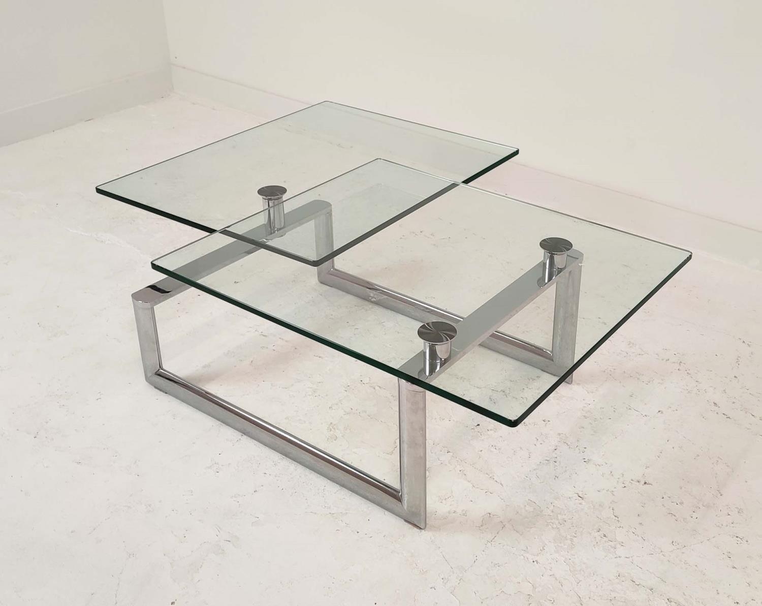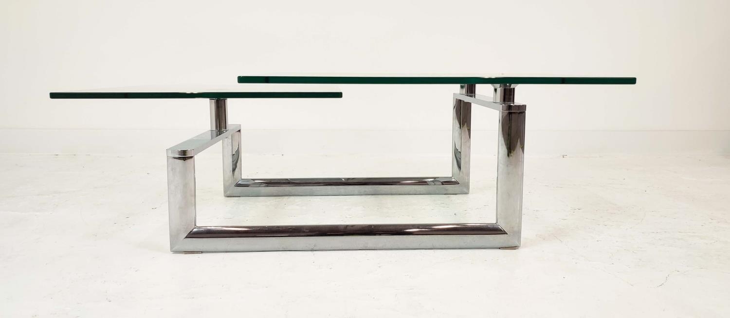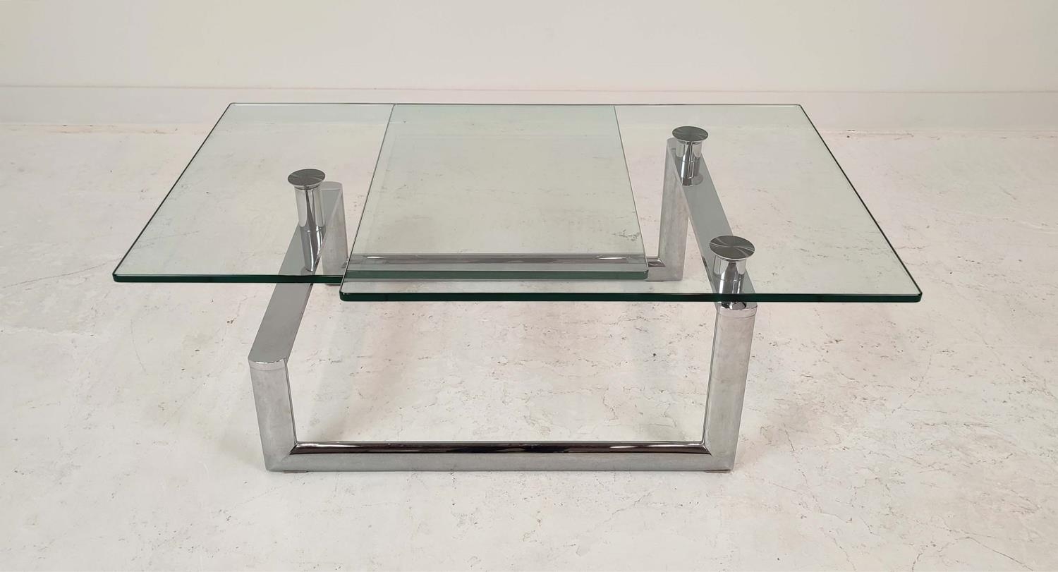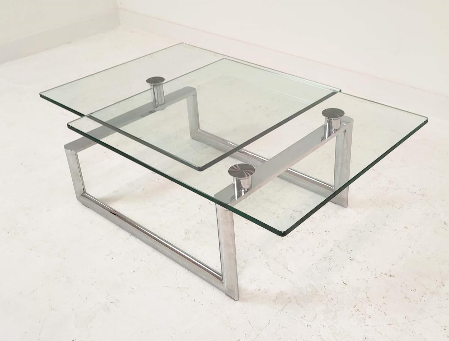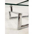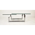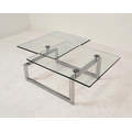 LOW TABLE, extendable twist out design, glass and polished metal, 161cm x 82cm x 40cm at largest.