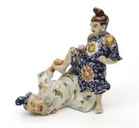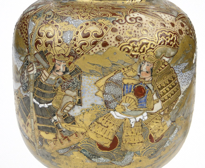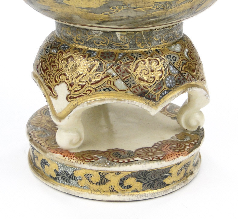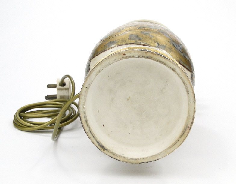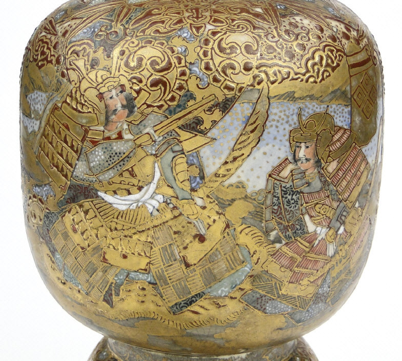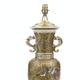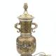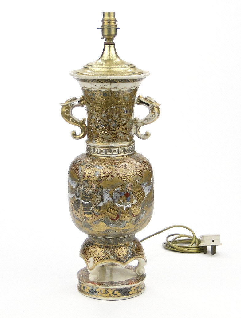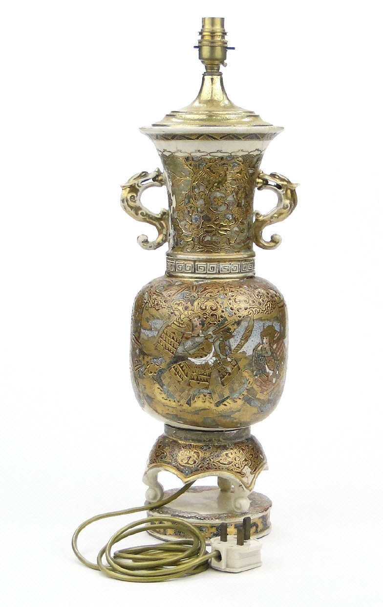 Japanese Satsuma Pottery two handled table lamp, the body profusely painted and gilded with warriors, 44cm high excluding the fitting