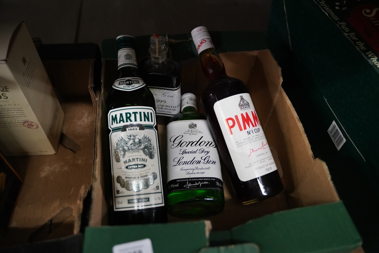 Gordon's Special Dry London Gin, Martini Extra Dry, Pimm's No1 Cup, Kirkbymoorside Sloe Gin 1999, various proofs, and contents, 4btls