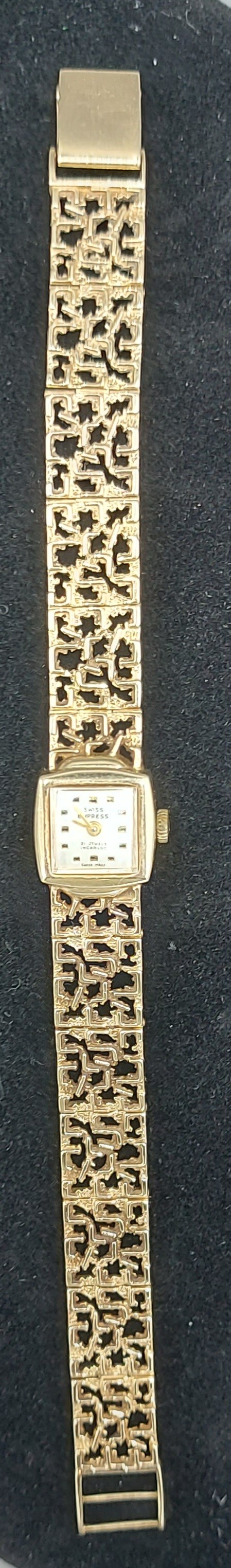 A 9ct gold cased ladies wristwatch by Swiss Express with 9ct gold linked bracelet, 15.8g excluding movement