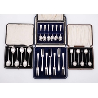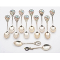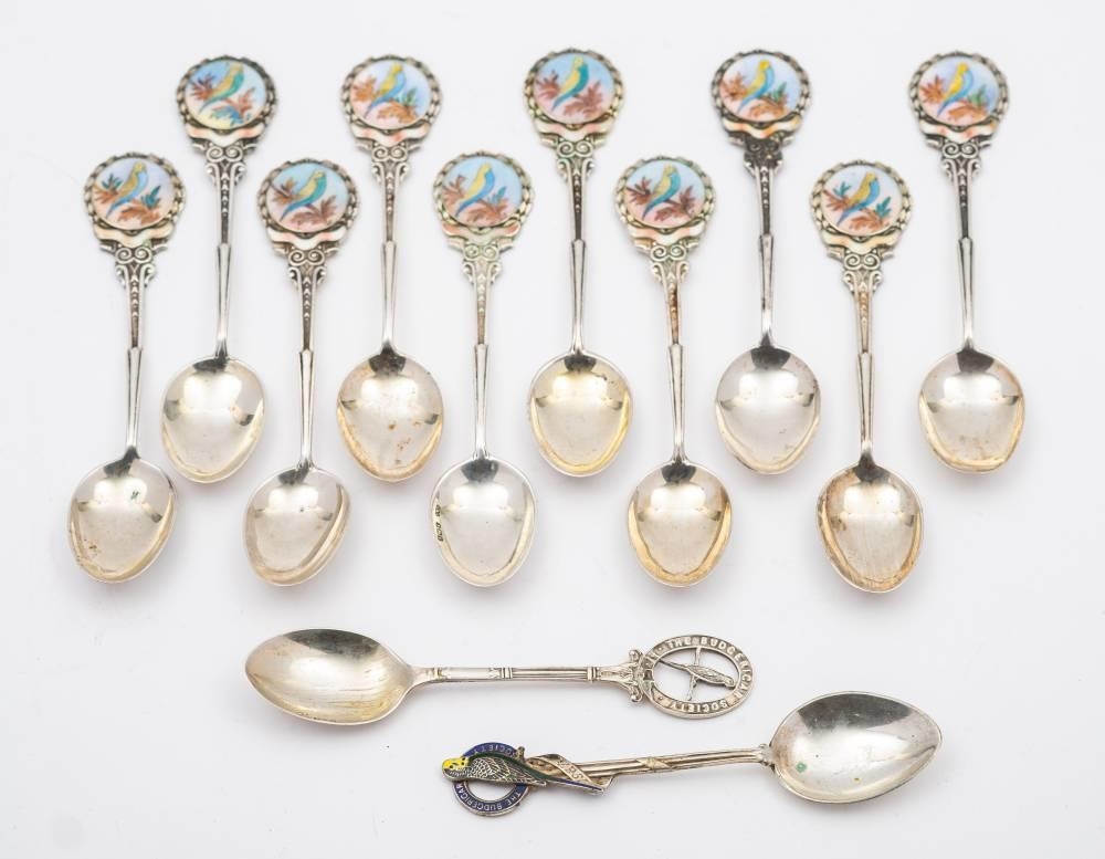 A matched set of ten silver and enamel teaspoons, various makers and dates: initialled, the terminals with budgerigar decoration, together with two other silver teaspoons, total weight of silver 226gms, 7.72ozs
