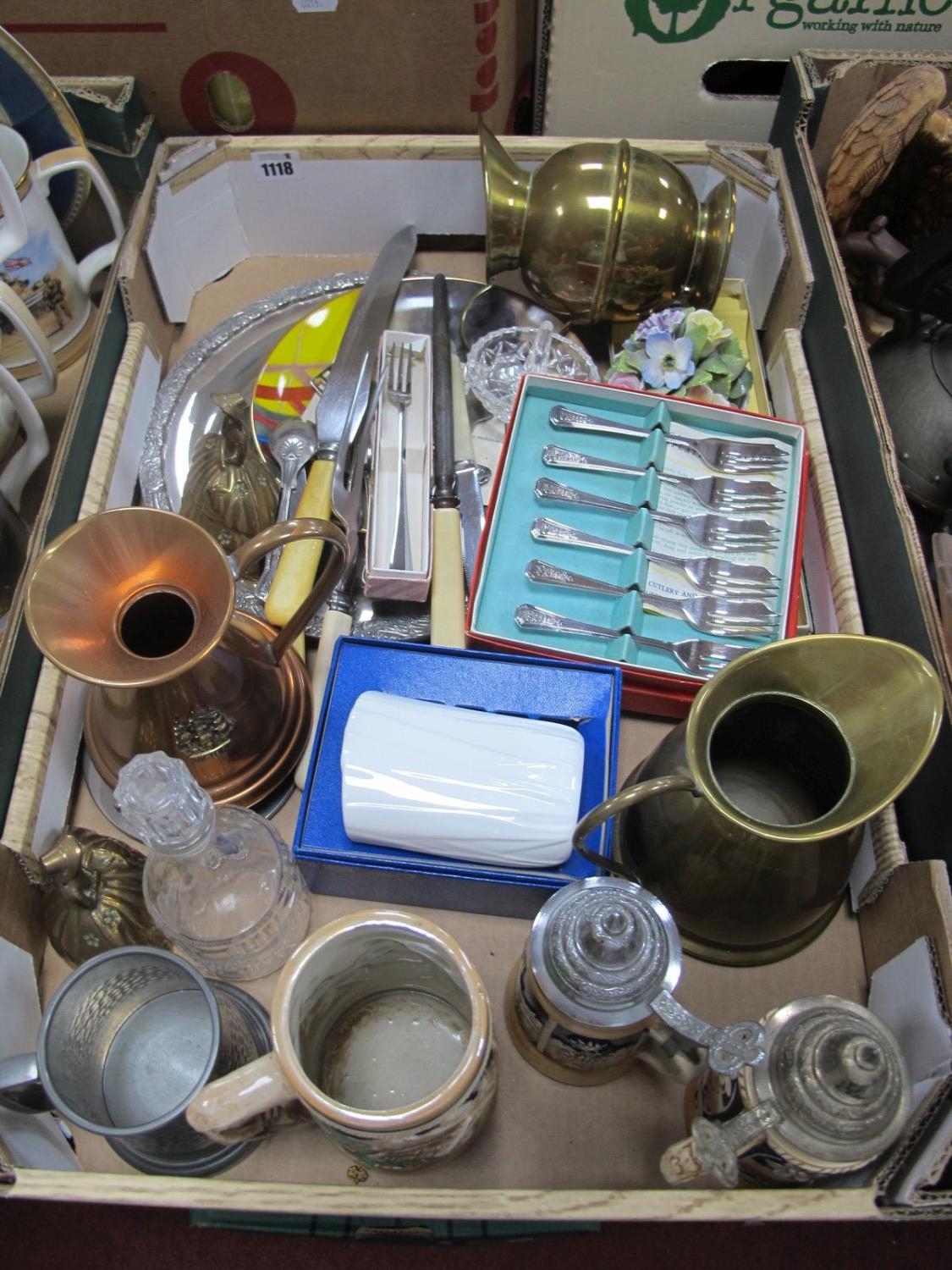 German Steins, pastry forks, copper jug etc:- One Box.