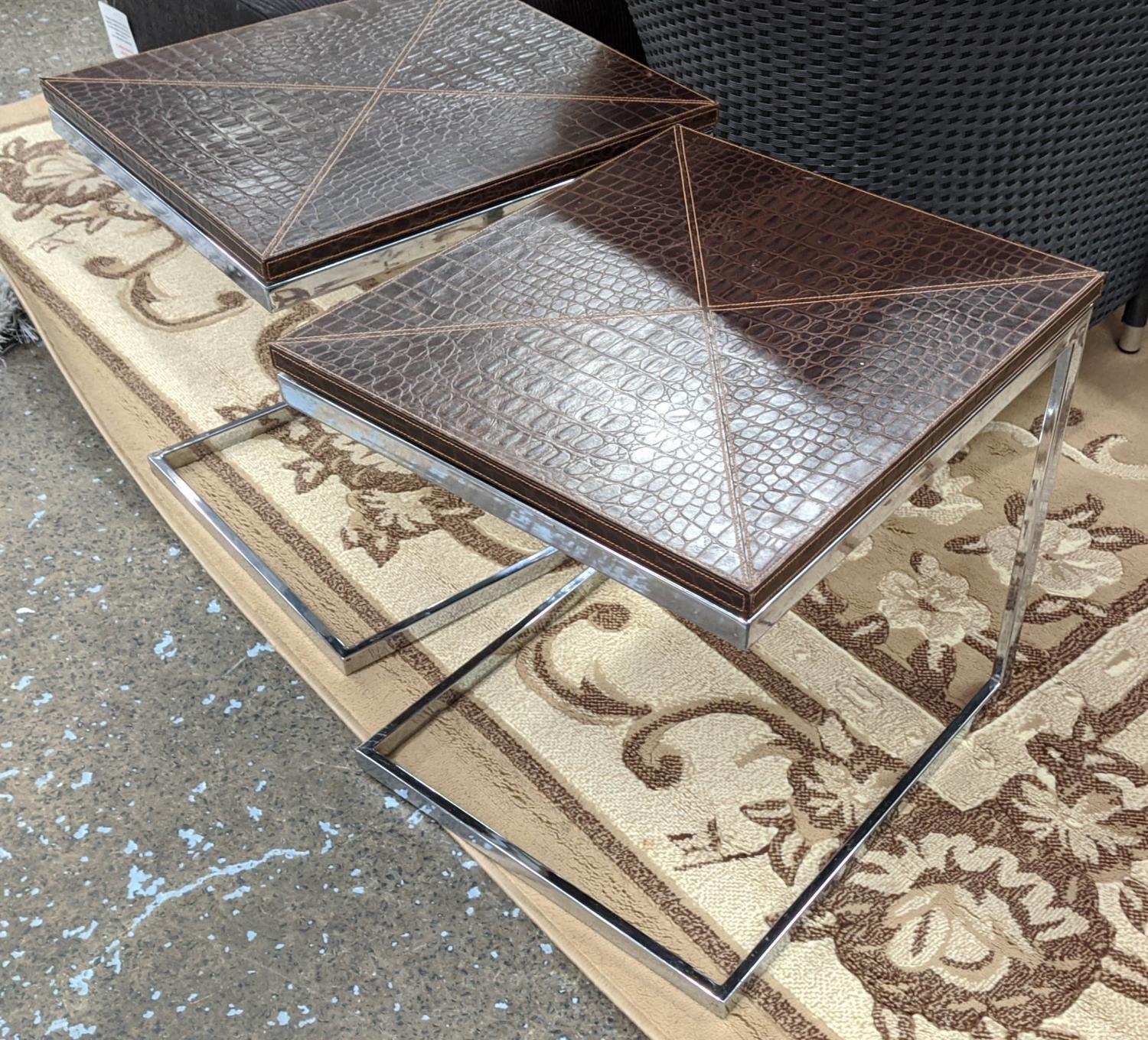 SIDE TABLES, a pair, 48cm x 44cm x 48cm, faux crocodile tops, polished metal frames. (2)