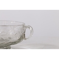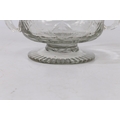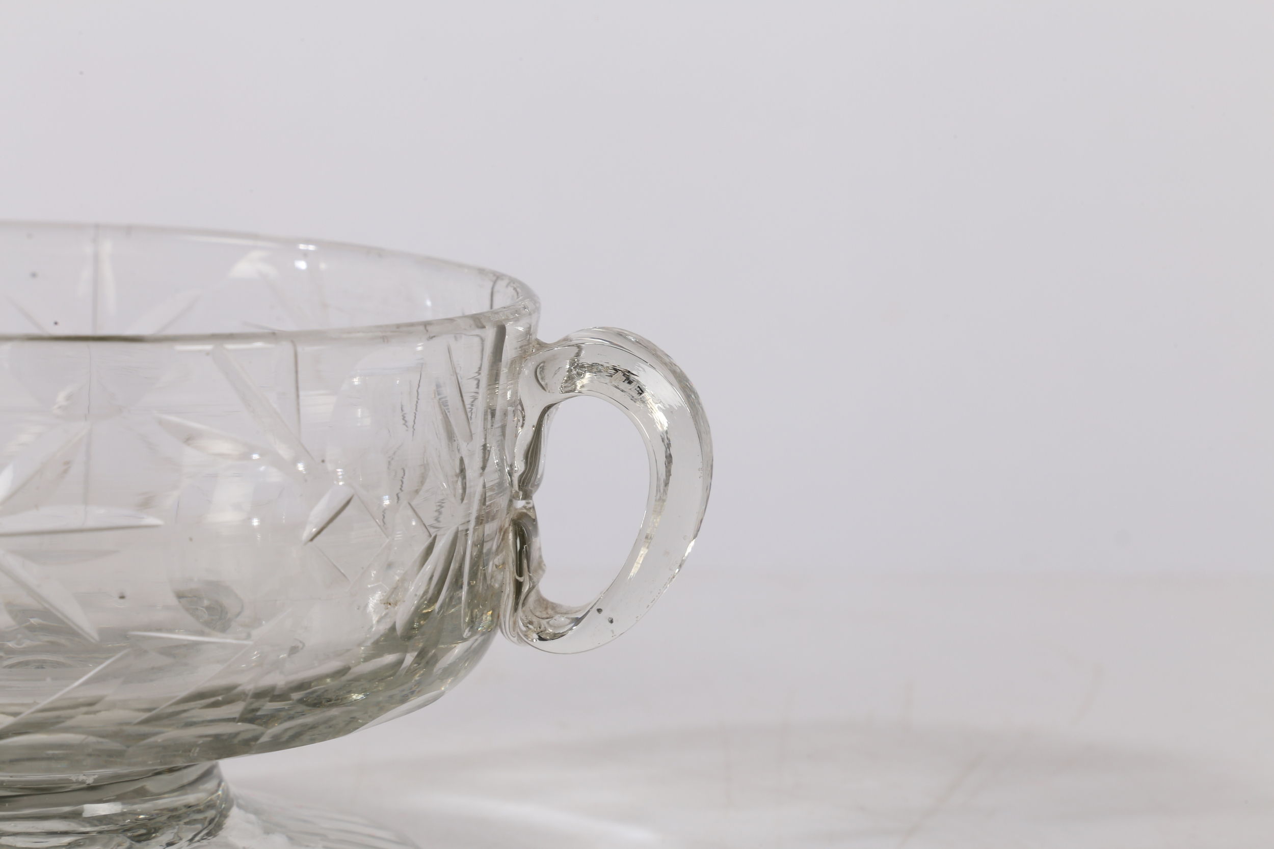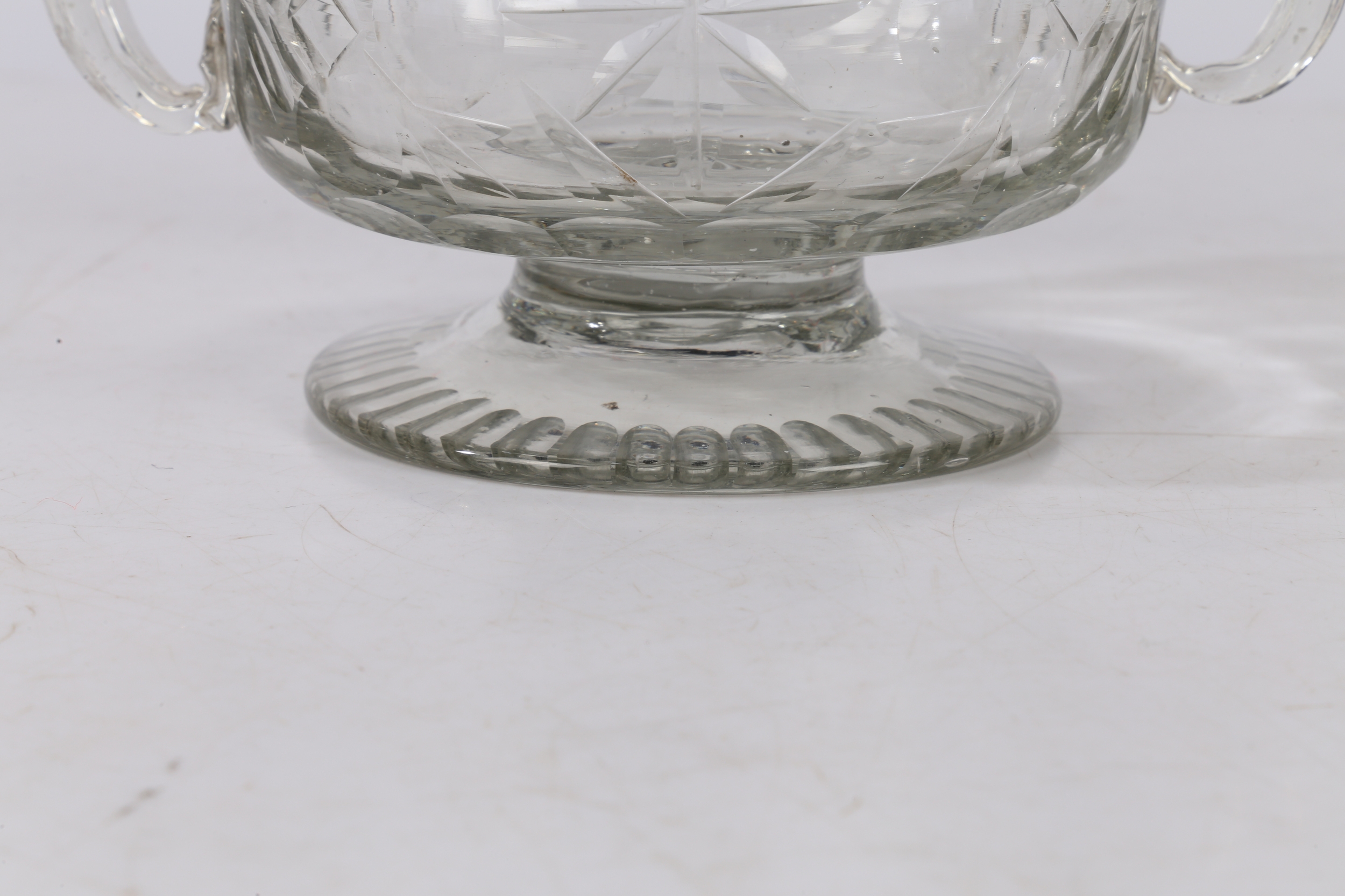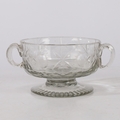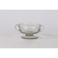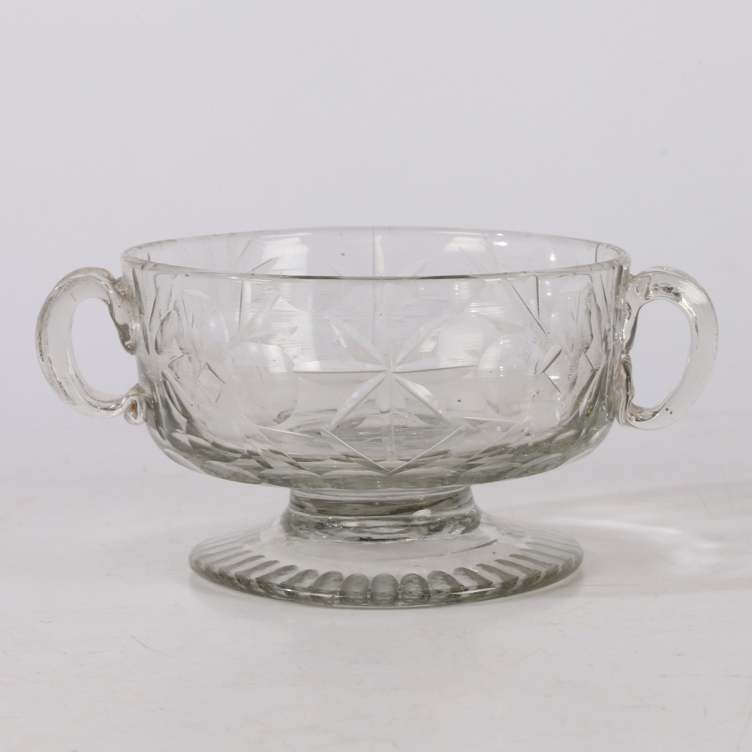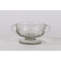 A MID 18TH CENTURY BOHEMIAN CUT GLASS DISH. Circa 1740, having twin handles above a star and circle cut glass decoration raised on a gadrooned foot, 17cm wide.