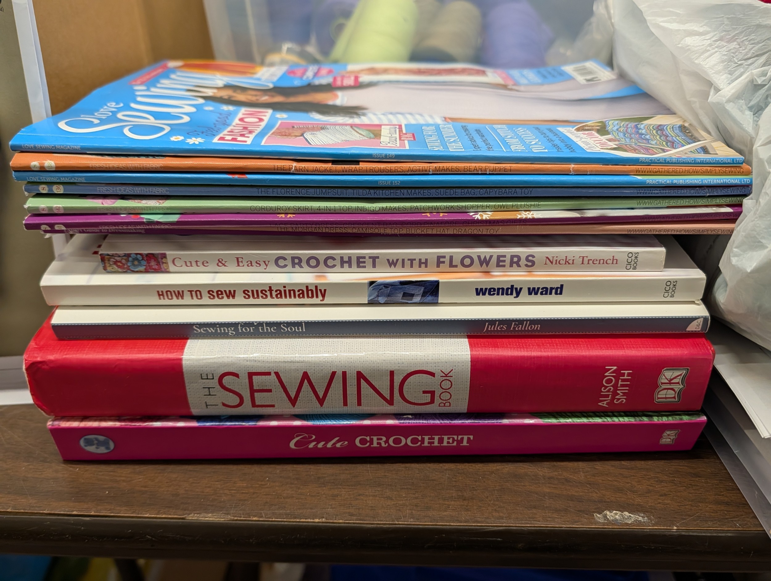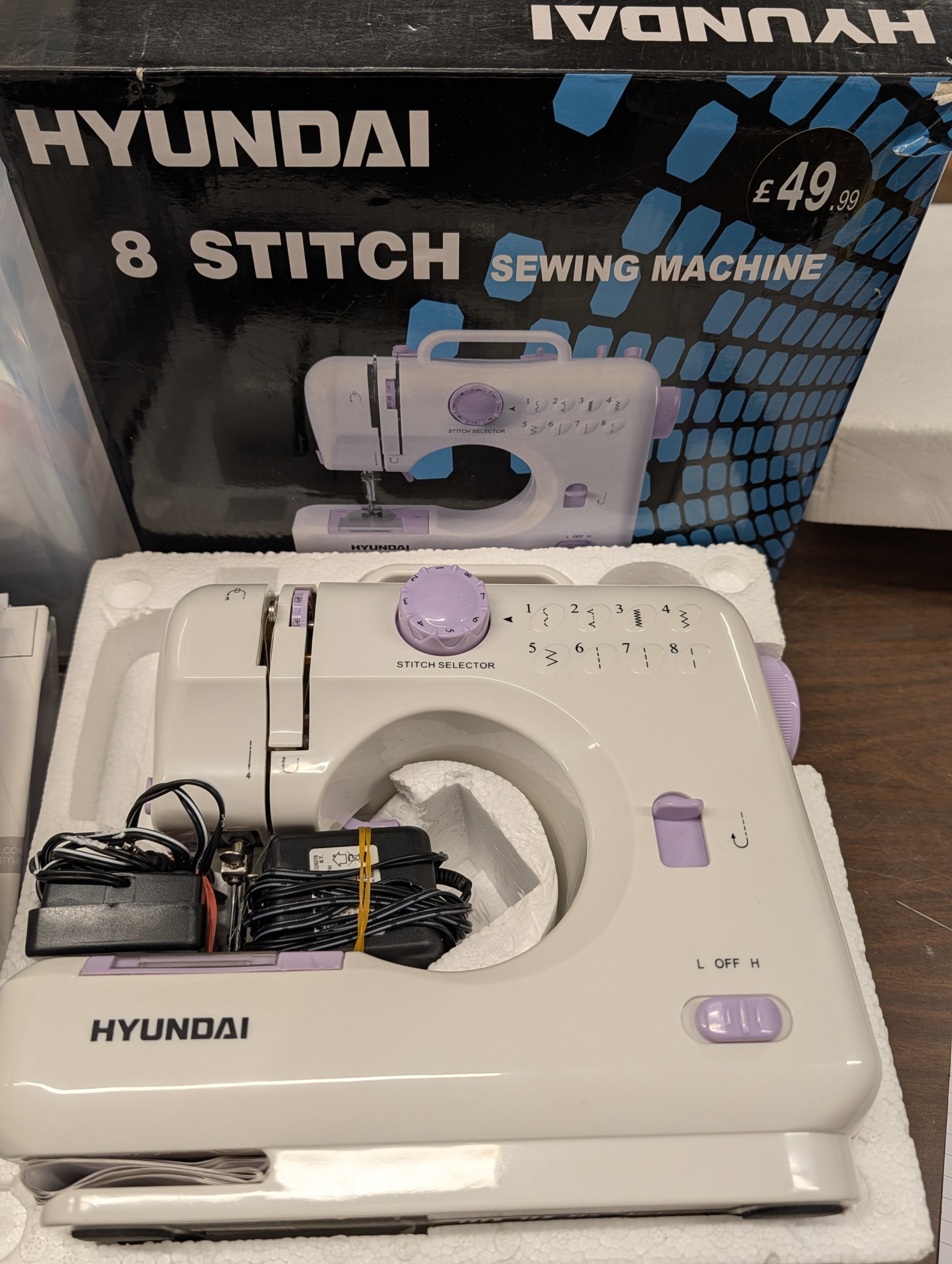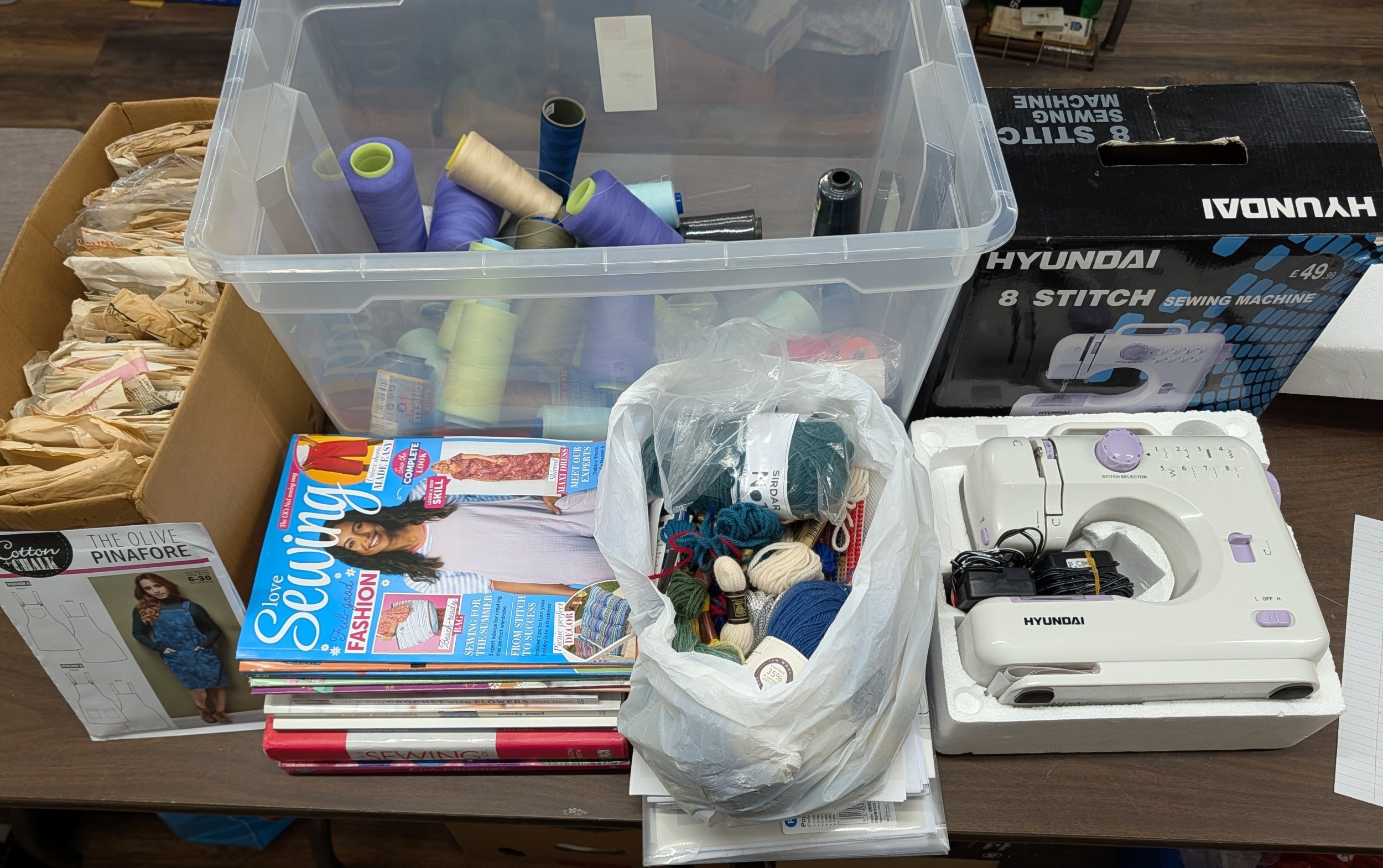 A Collection of Sewing and Textile Craft Supplies Featuring a Hyundai 8-Stitch Sewing Machine, Instructional Books, Patterns and Yarn - All Proceeds From This Lot Goes To The Together Centre Manchester