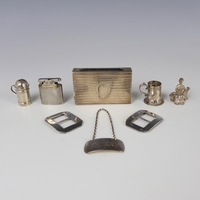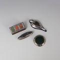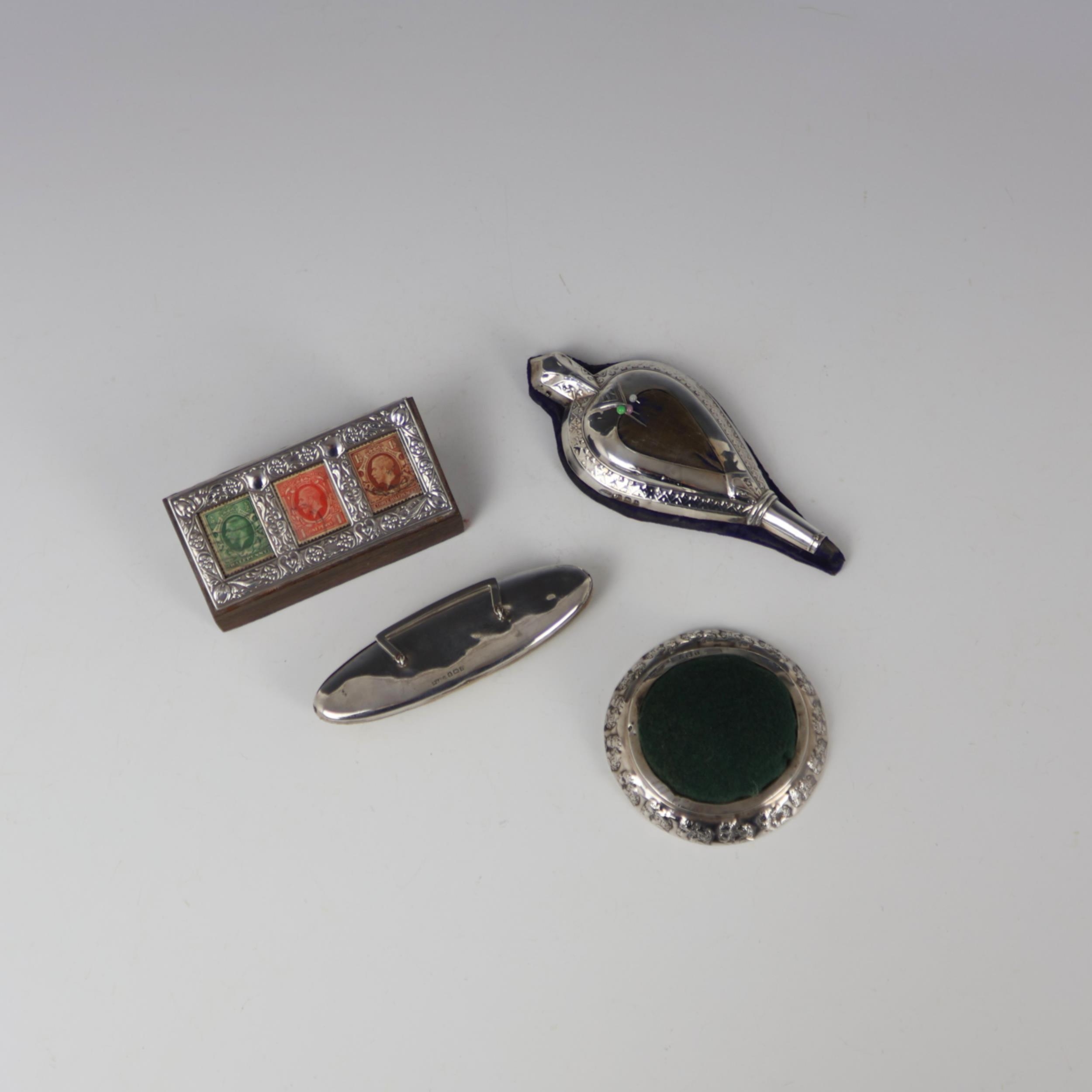 A late 20th century silver mounted triple stamp holder, Ray Hall, Birmingham 1990, the florally embossed silver mount with double shield detail, 9cm wide, with an Edwardian silver mounted novelty pin cushion, Joseph Gloster Ltd, Birmingham 1908, modelled as bellows, 14cm long, and two further silver mounted pieces (4) (weighted)