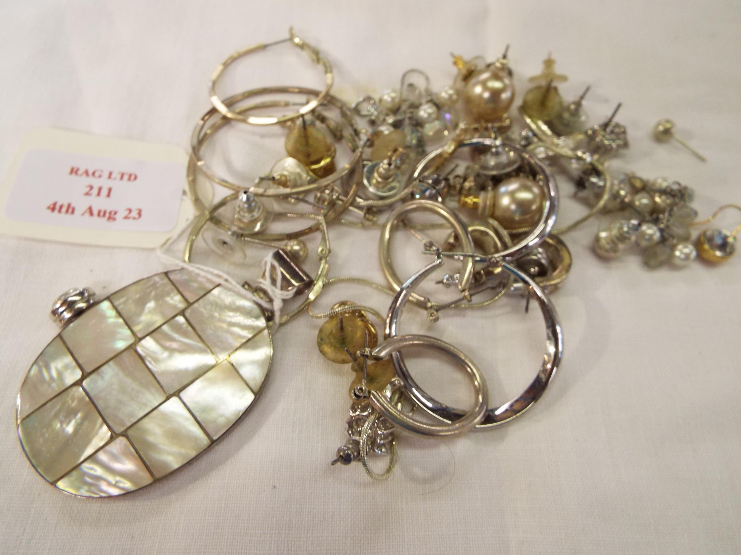 A mixed selection of silver and white metal jewellery to include mother of pearl inlaid pendant, earrings etc
