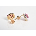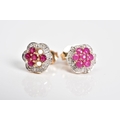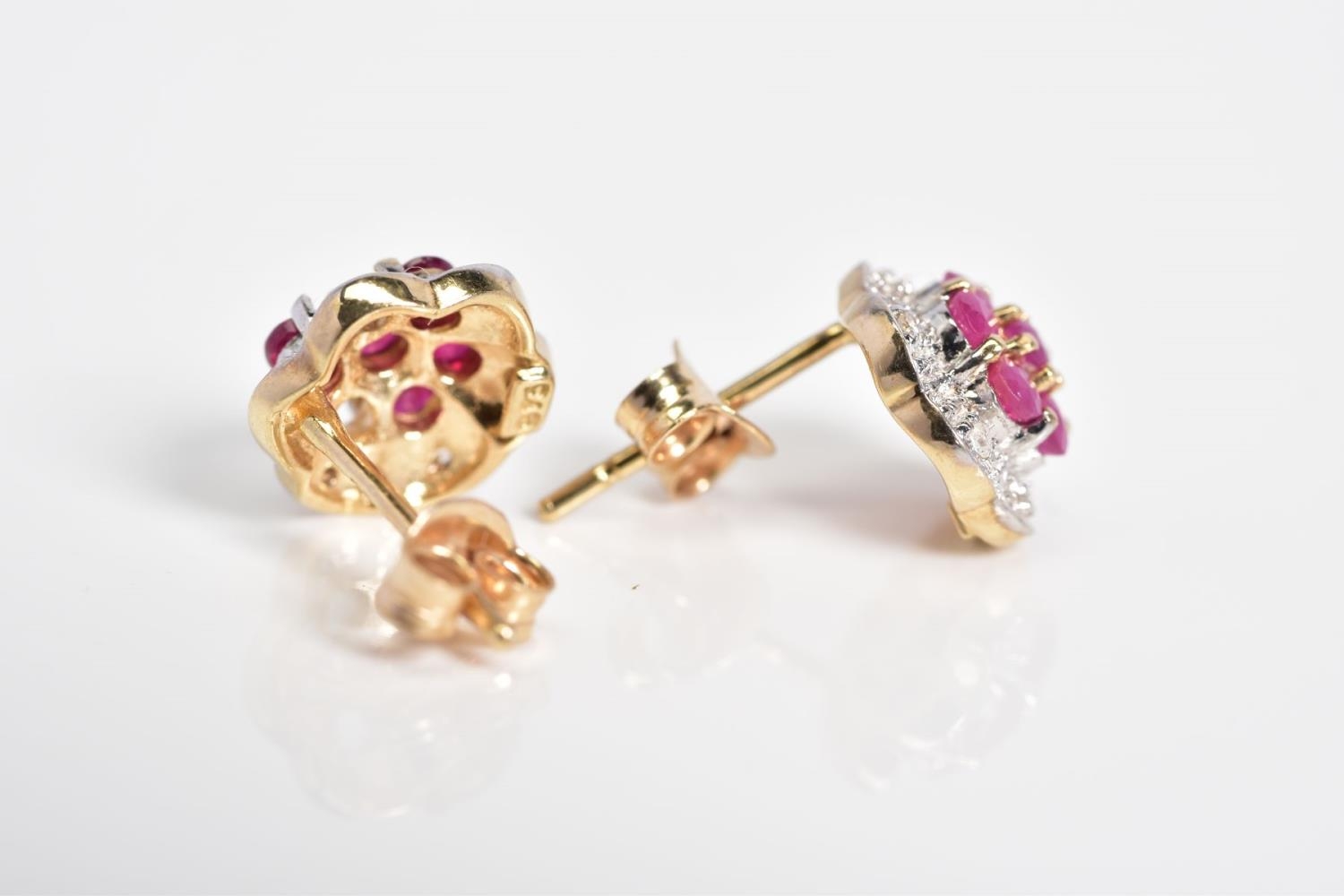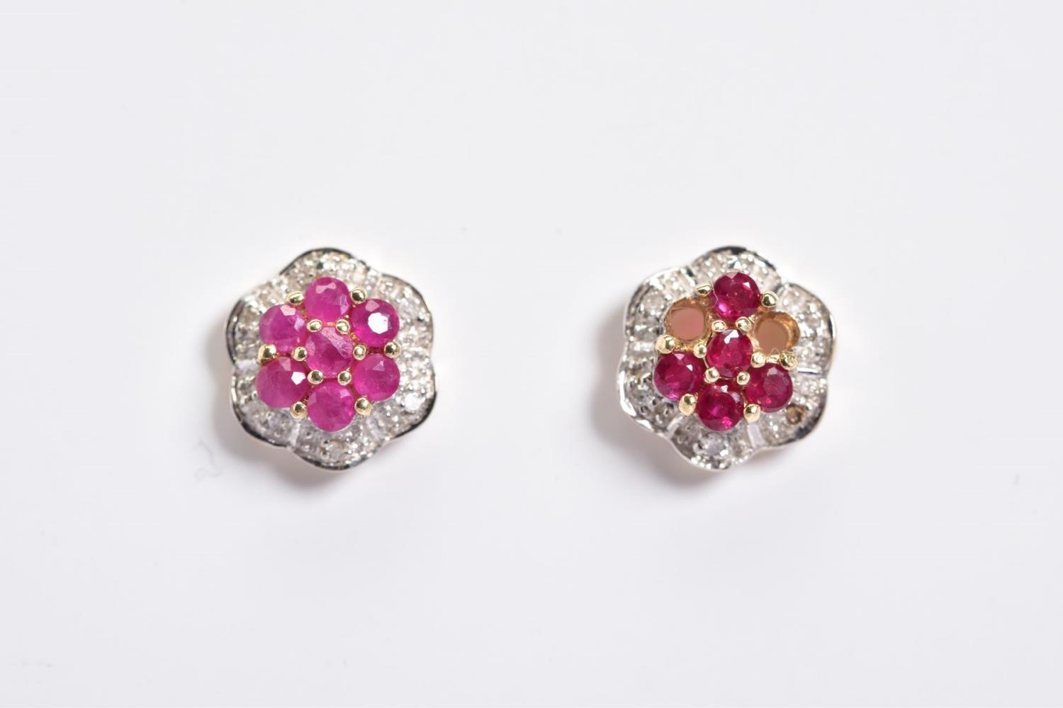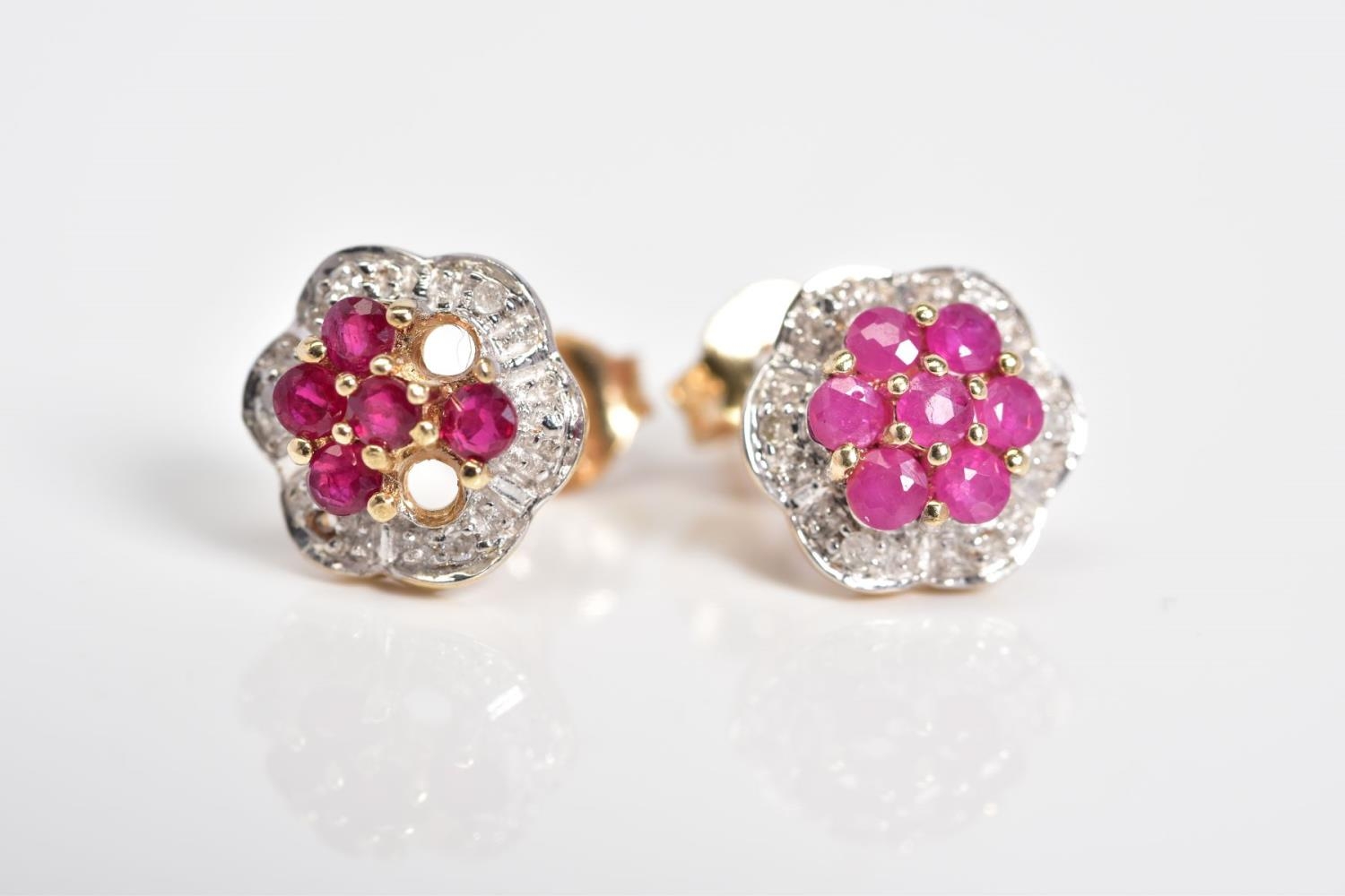 A NEAR PAIR OF MATCHING 9CT GOLD RUBY AND DIAMOND CLUSTER EARRINGS, each cluster set with circular cut rubies and a single cut diamond surround, to the post and scroll fittings, with a 9ct hallmark for Birmingham, approximate width of cluster 9mm, approximate gross weight 1.7 grams (condition: missing stones to one earring)