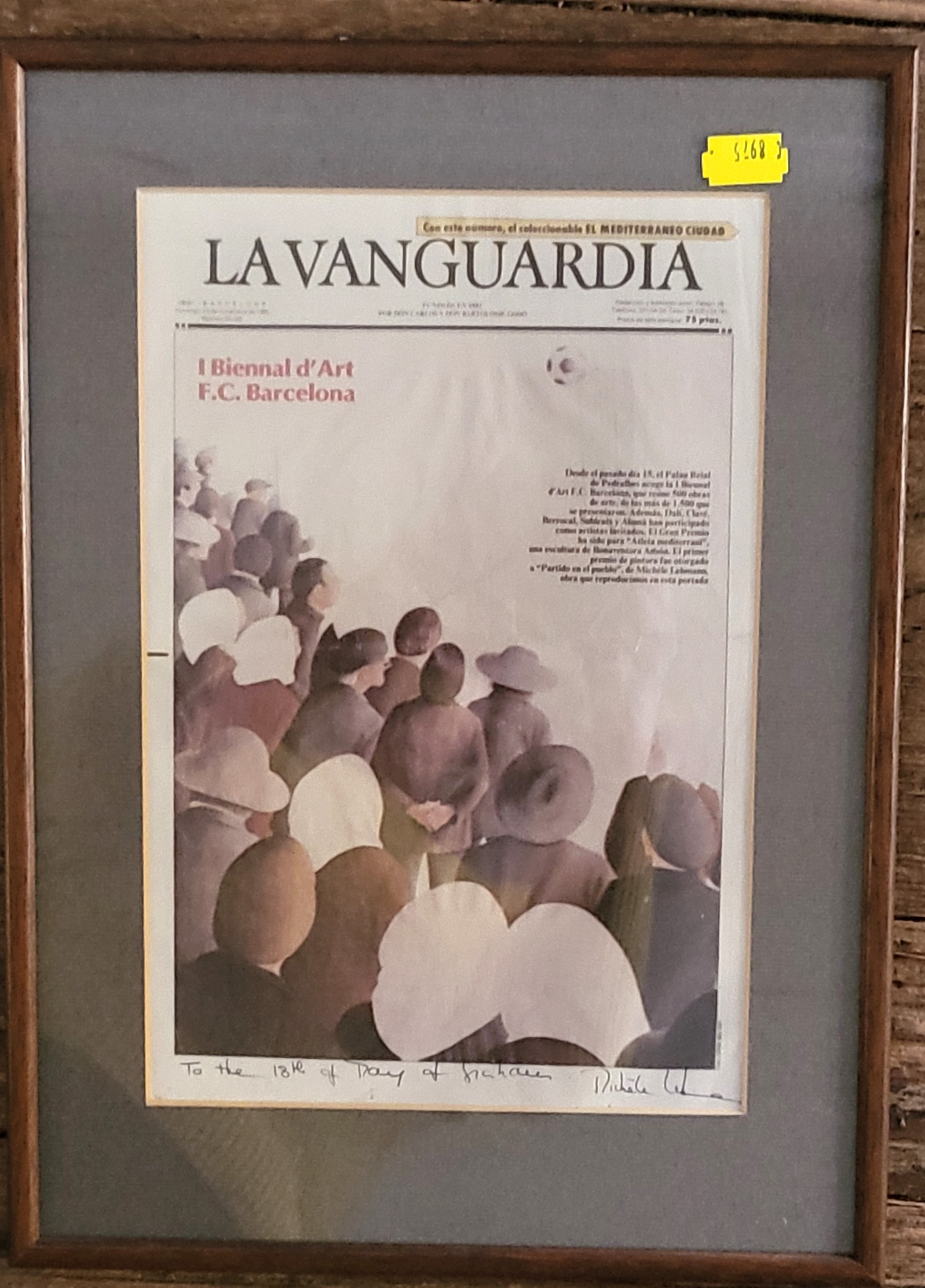 Michele Lehmann magazine cover La Vanguardia signed and with message across the bottom. 38 x 27cm including frame.