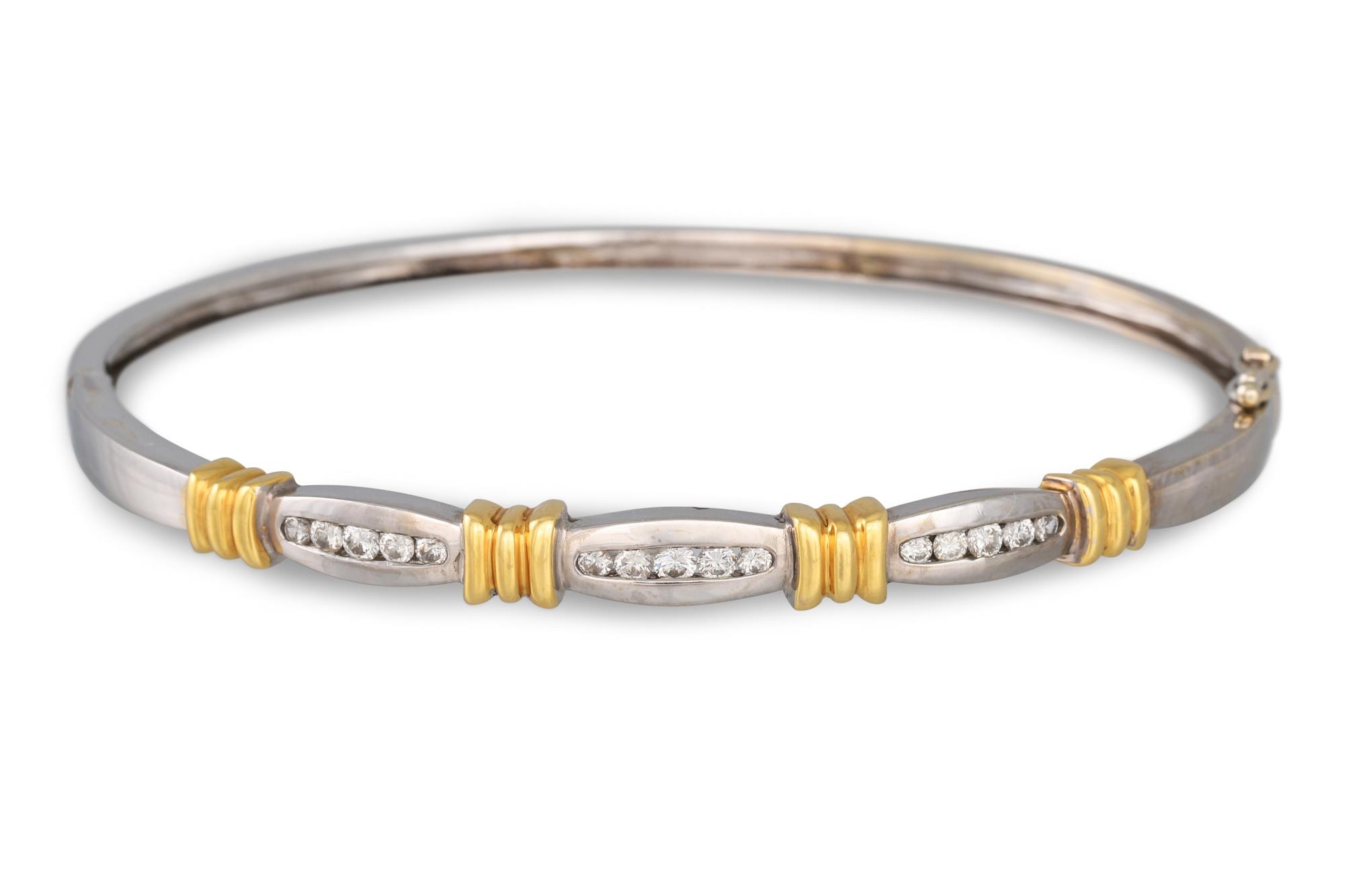 A DIAMOND SET BANGLE, in two colour 18ct gold, the diamonds channel set