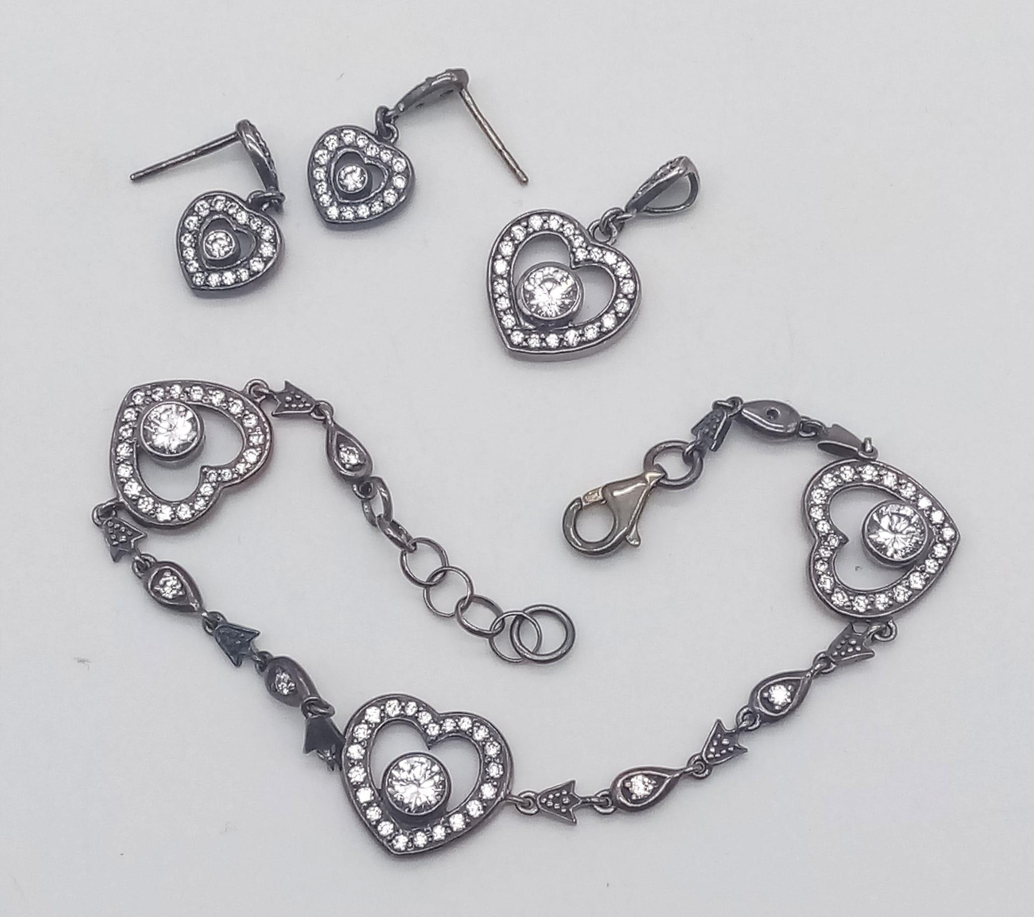 A collection of vintage 925 silver CZ cluster heart jewellery include a pair of drop earrings, a pendant and 19cm bracelet. Total weight 14G. Please see photos for details.