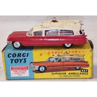 Vintage boxed Corgi model 439 Chevrolet Fire Chief, blue/yellow box. Model is very good with little sign of use in a complete box with some storage wear.