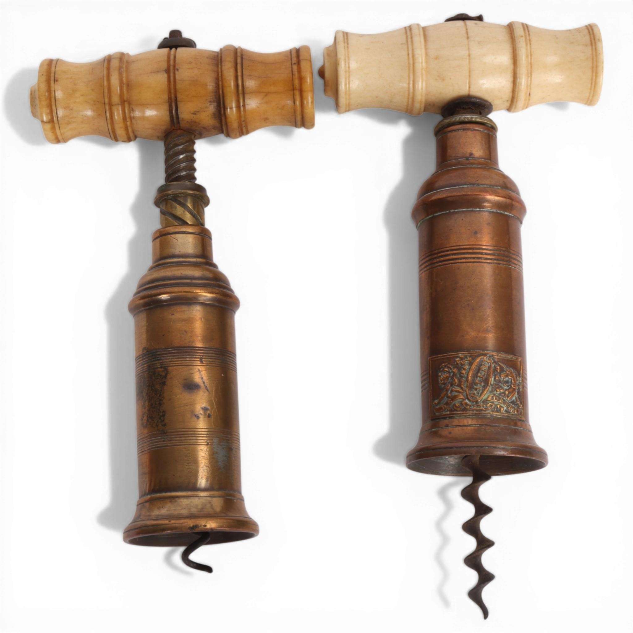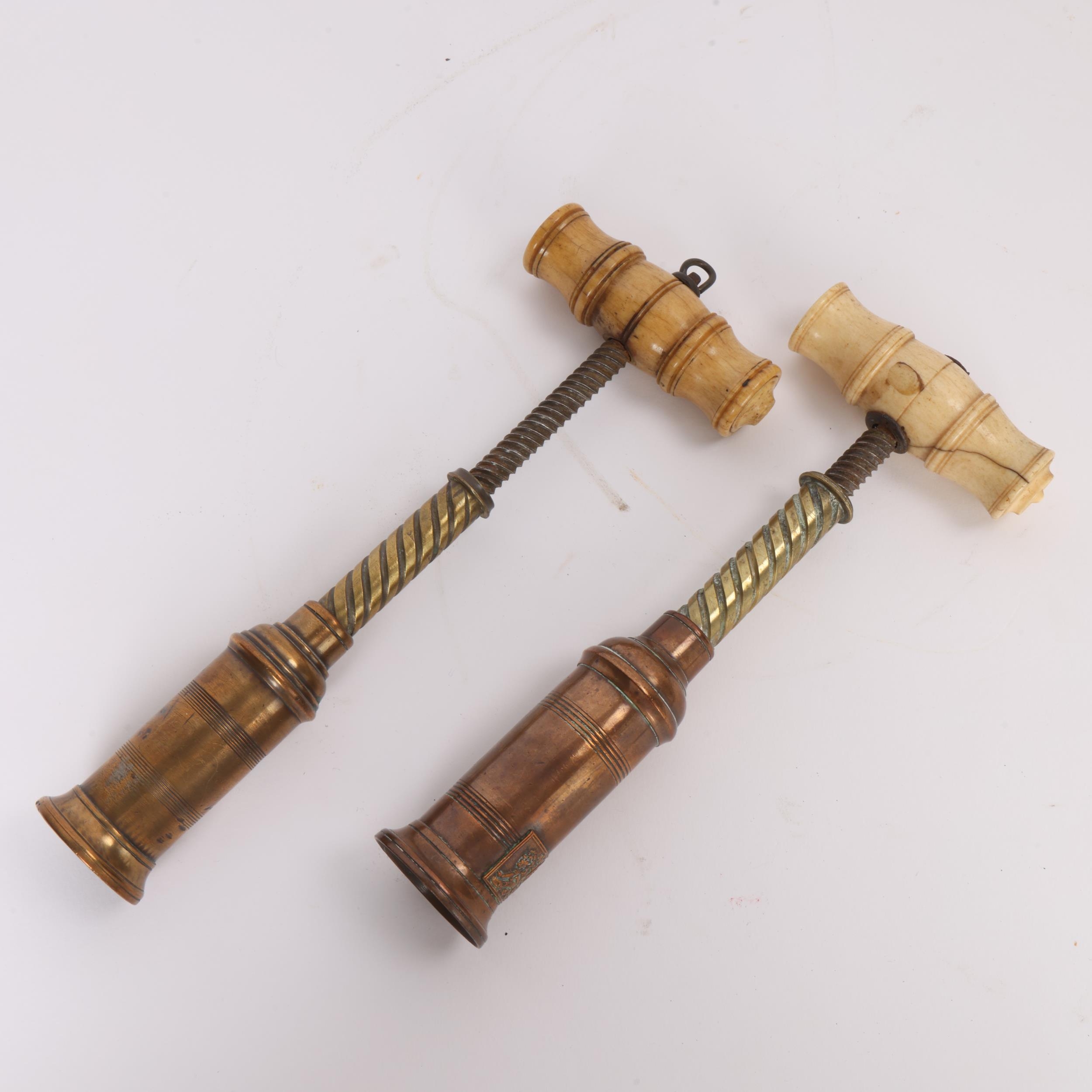 2 Thomason type corkscrews with bone handles, early / mid 19th century with bone handles and brass /copper bodies, one with patent plaque