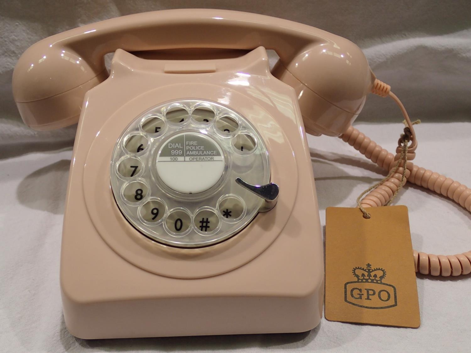 Pink, GPO746 retro rotary telephone replica of the 1970s classic, compatible with modern telephone banking and any standard analogue landline, boxed. P&P Group 1 (£14+VAT for the first lot and £1+VAT for subsequent lots)
