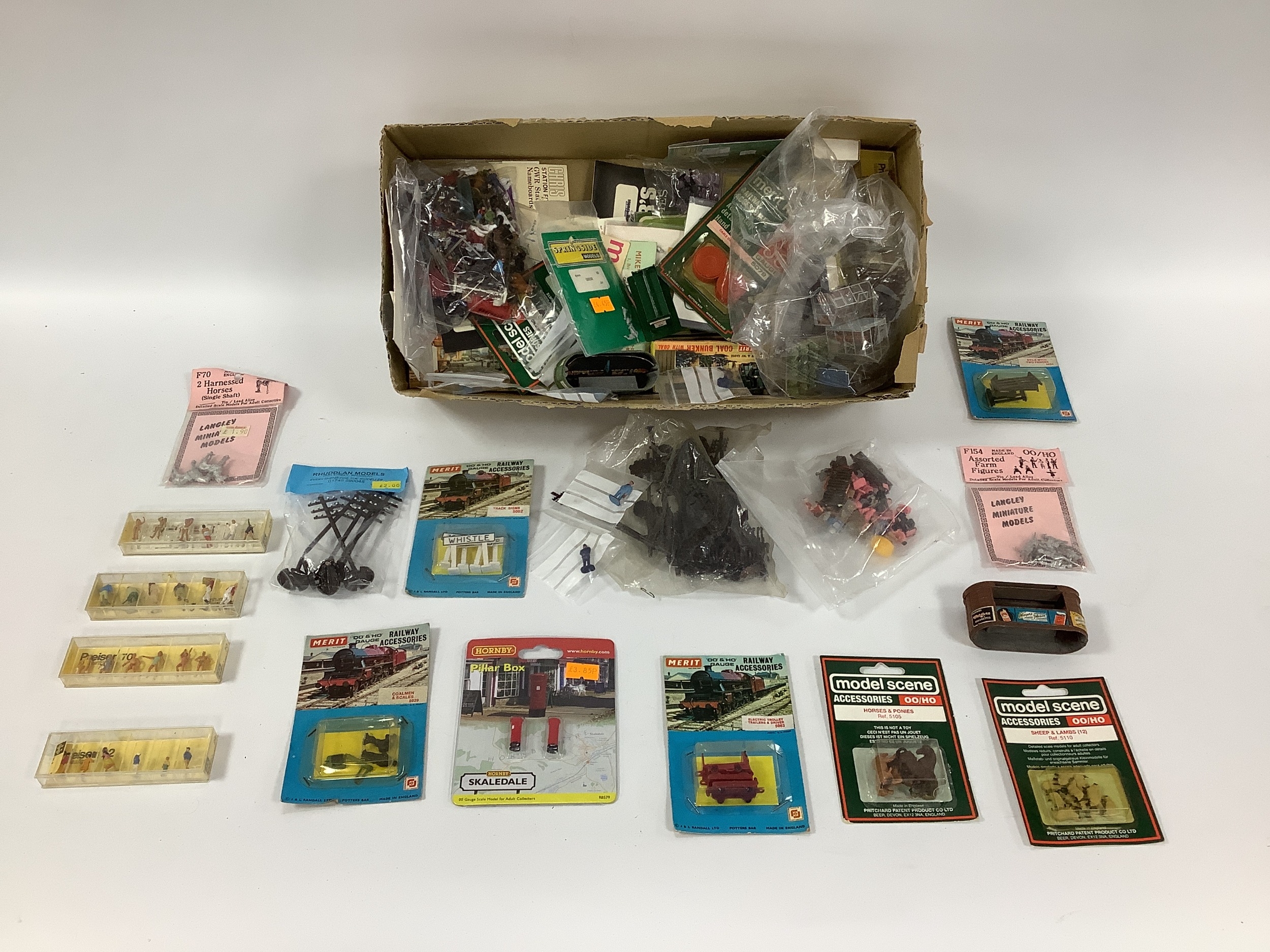 A Collection of '00'/'H0' Figures by Preiser and Others, together with other small accessories, including greenhouses, sheds, fencing, telegraph poles, farm animals, station seats and luggage, by Hornby, Merit, Model Scene, Langley, Harburn Hamlet and others.