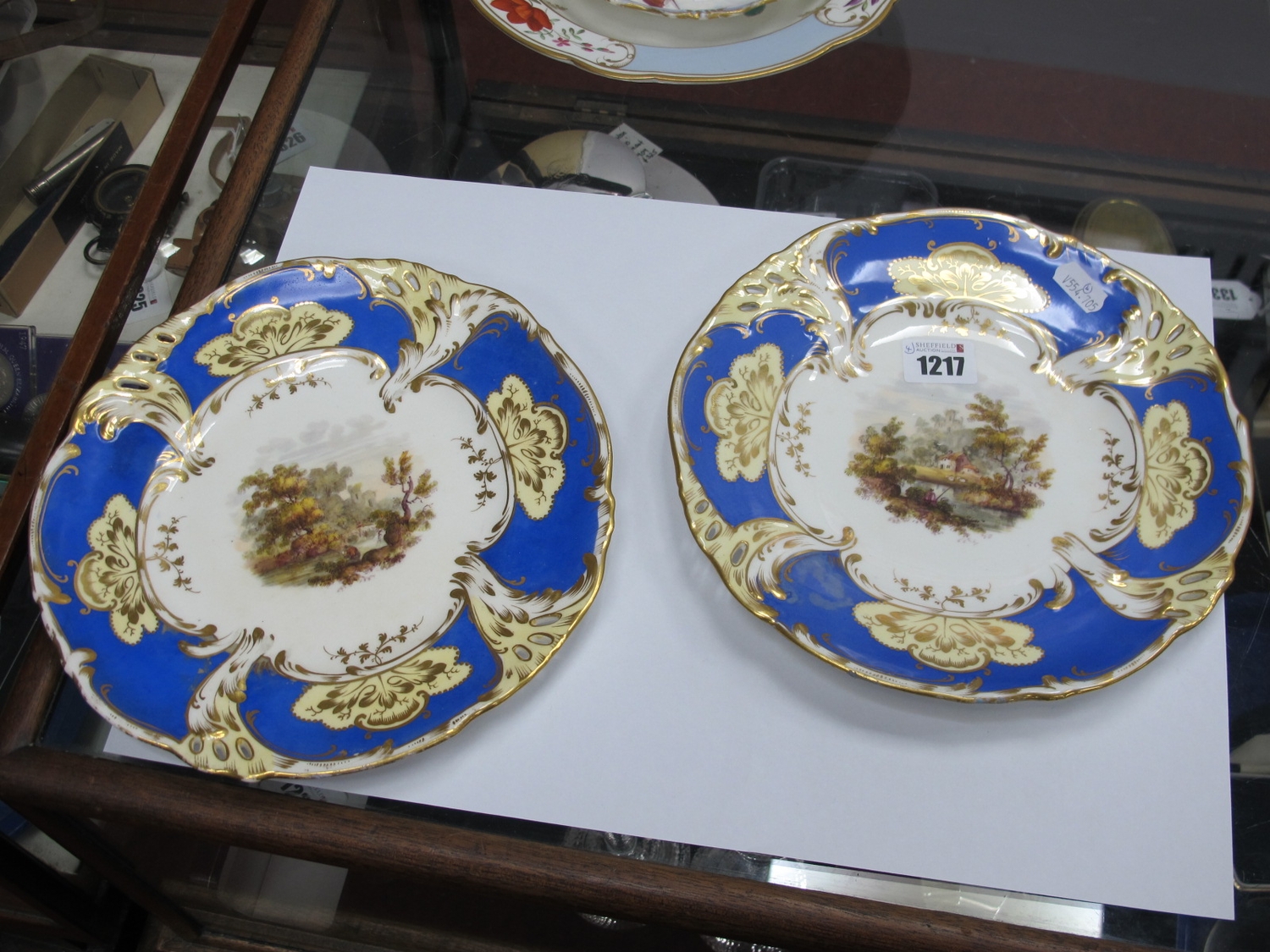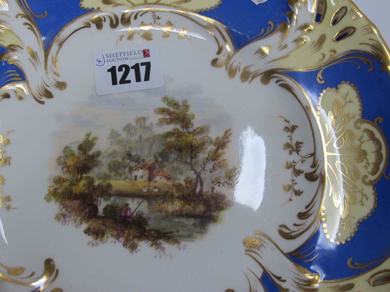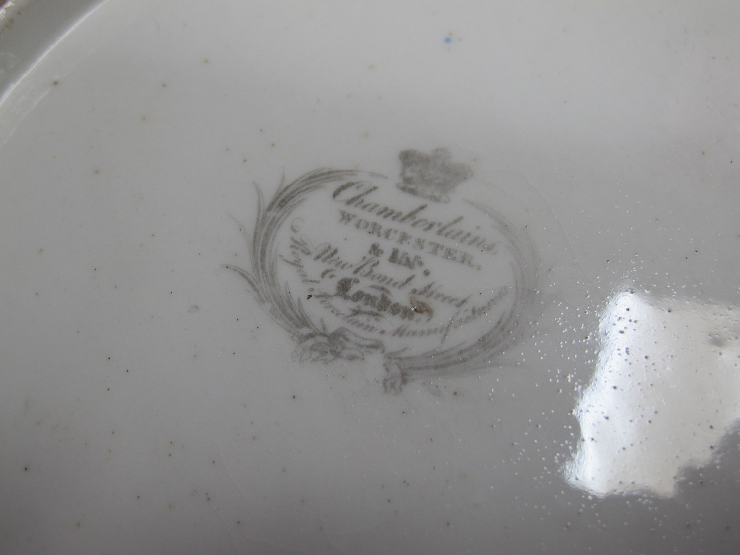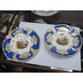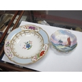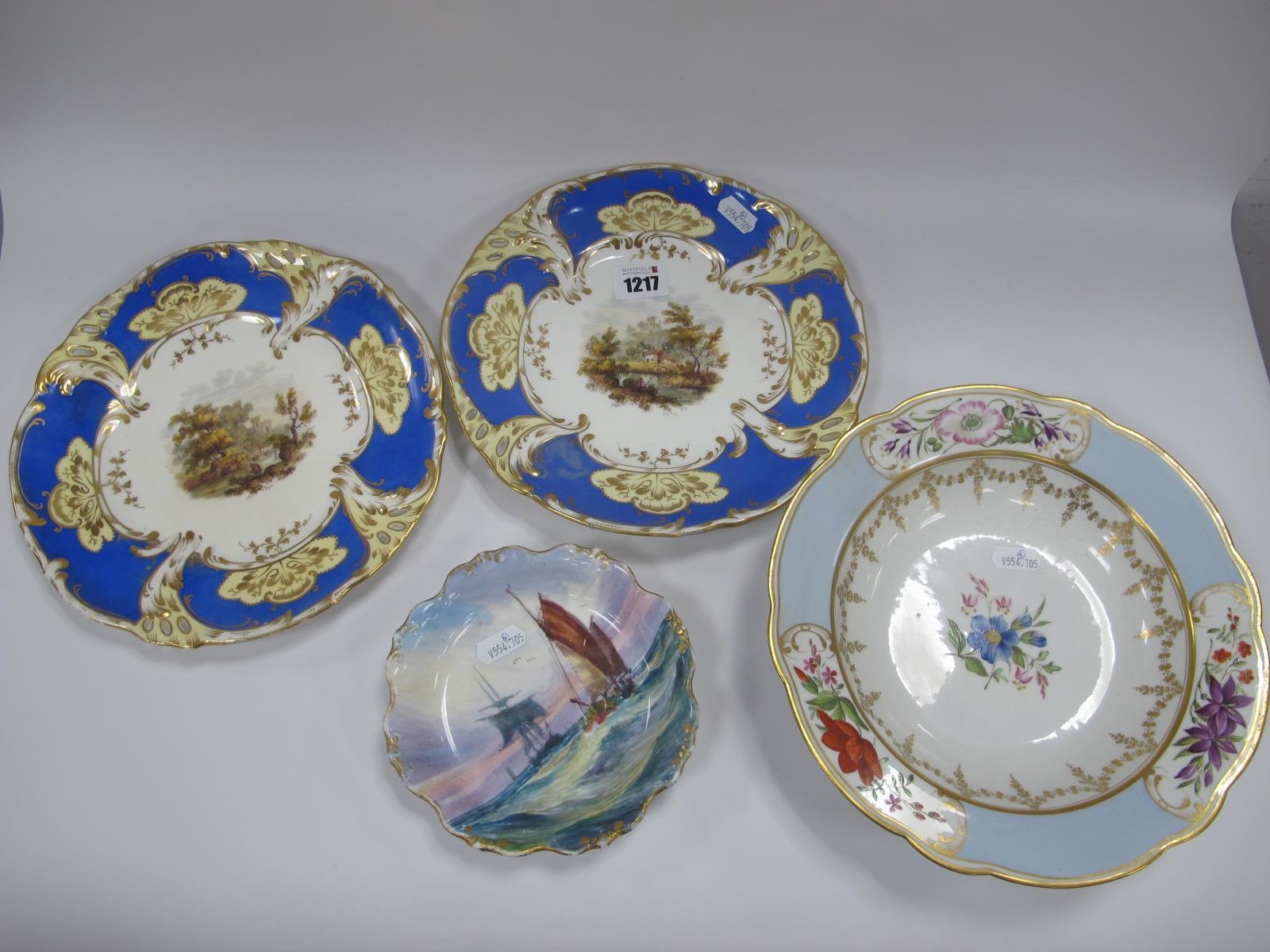 Lot 1217 - Royal Crown Derby Painted Dish - gilt loss to rim, may scratches to image, no visible chips, cracks or restoration. Pair of XIX Century Cabinet Plates - both very fine crazing, minor gilt loss, no visible chips, cracks or restoration. Chamberlains Worcester Bowl - no visible chips, cracks or restoration.