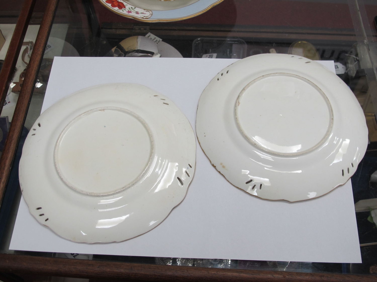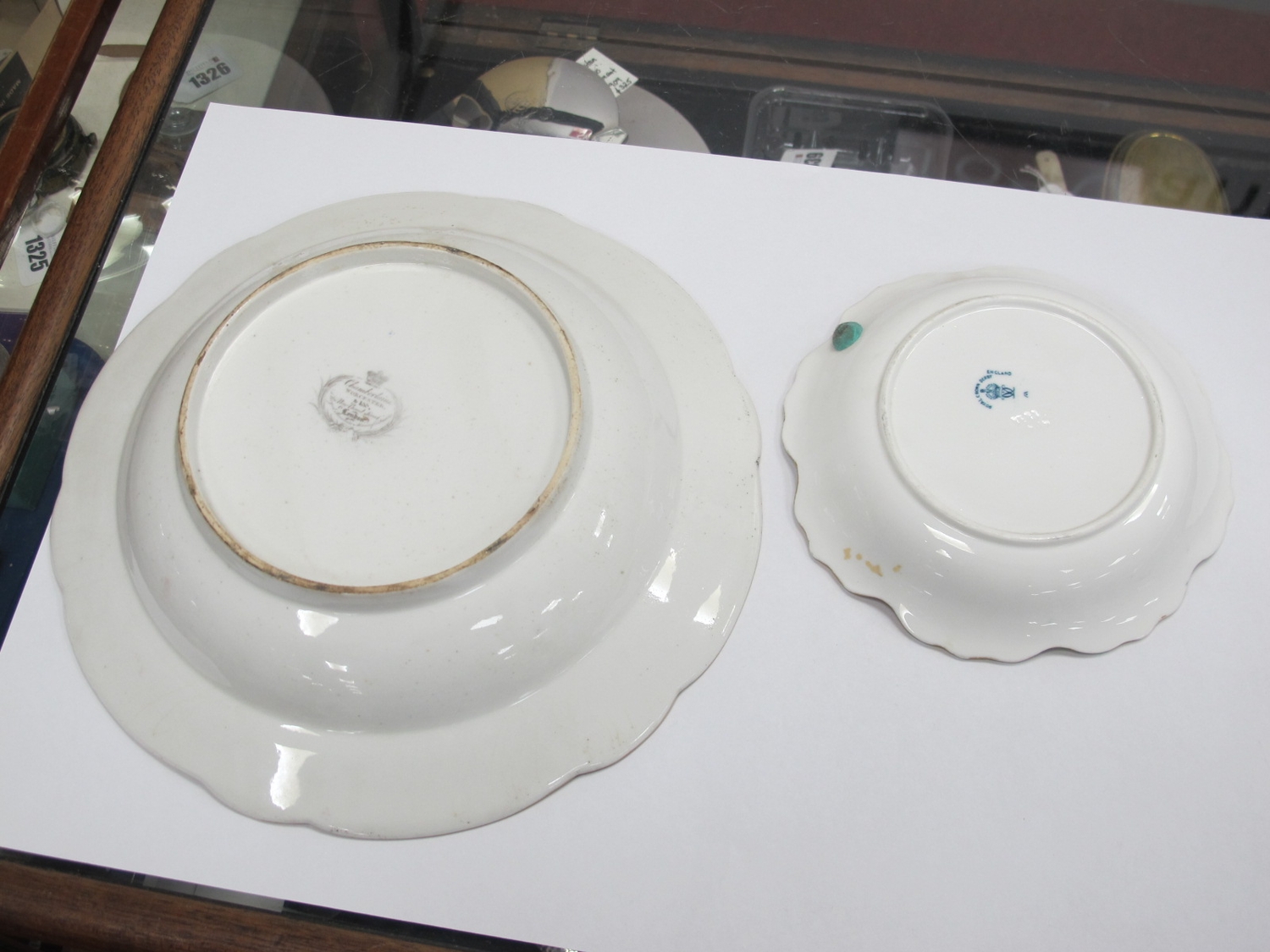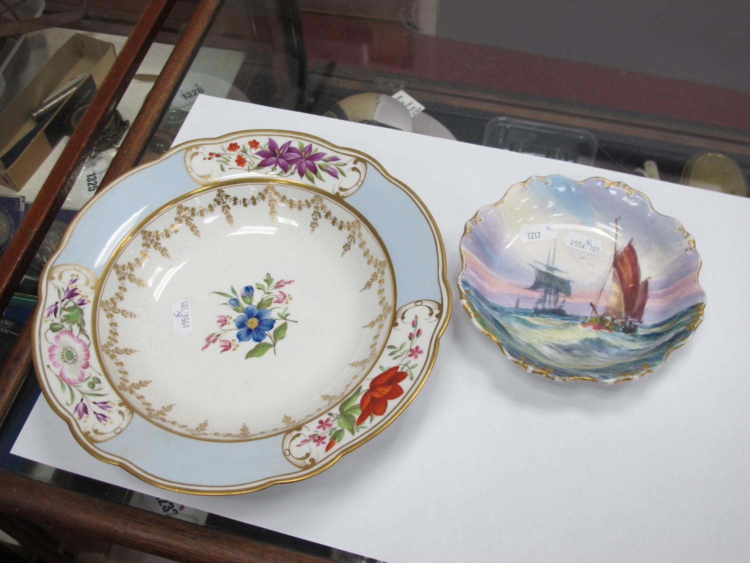 Royal Crown Derby Painted Dish by W.E.J Dean, featuring seascape, 15cm wide (scratches), pair of XIX Century hand painted cabinet plates, Chamberlains Worcester bowl (4).
