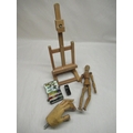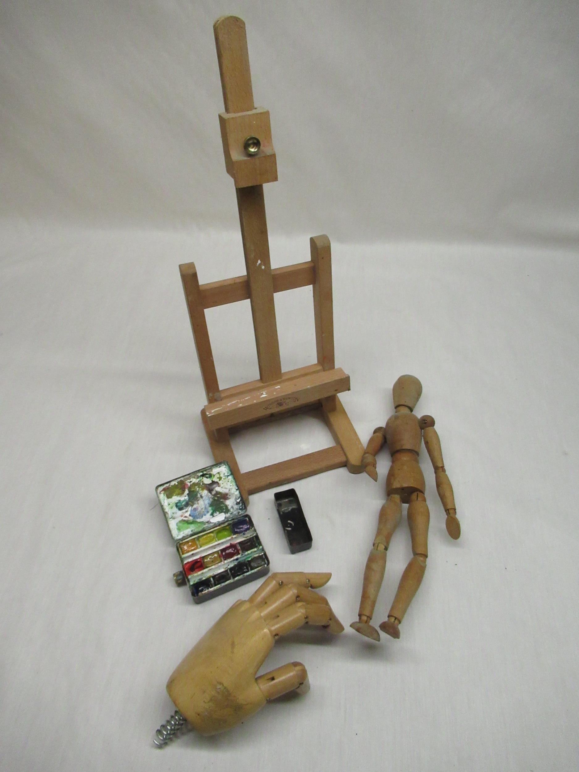 Winsor & Newton miniature beech easel, Winsor & Newton japanned steel watercolour box, artists jointed beech figure, etc