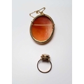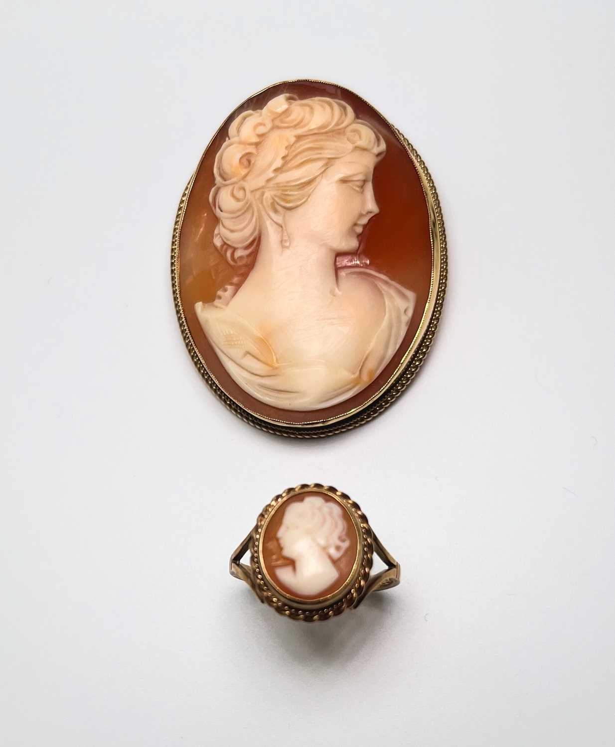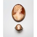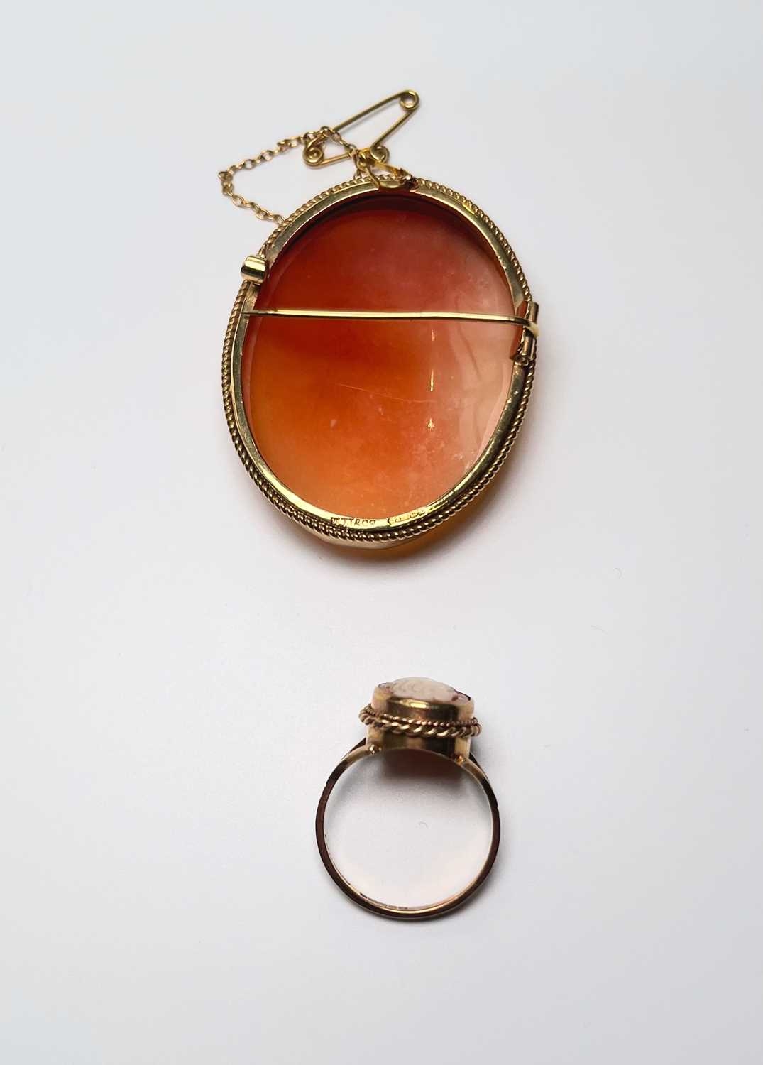 A 9ct gold shell cameo brooch and a ring, both with hallmarks for Birmingham 1987, length 4.2cm, ring size M1/2, total weight 14.8g