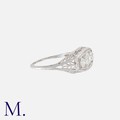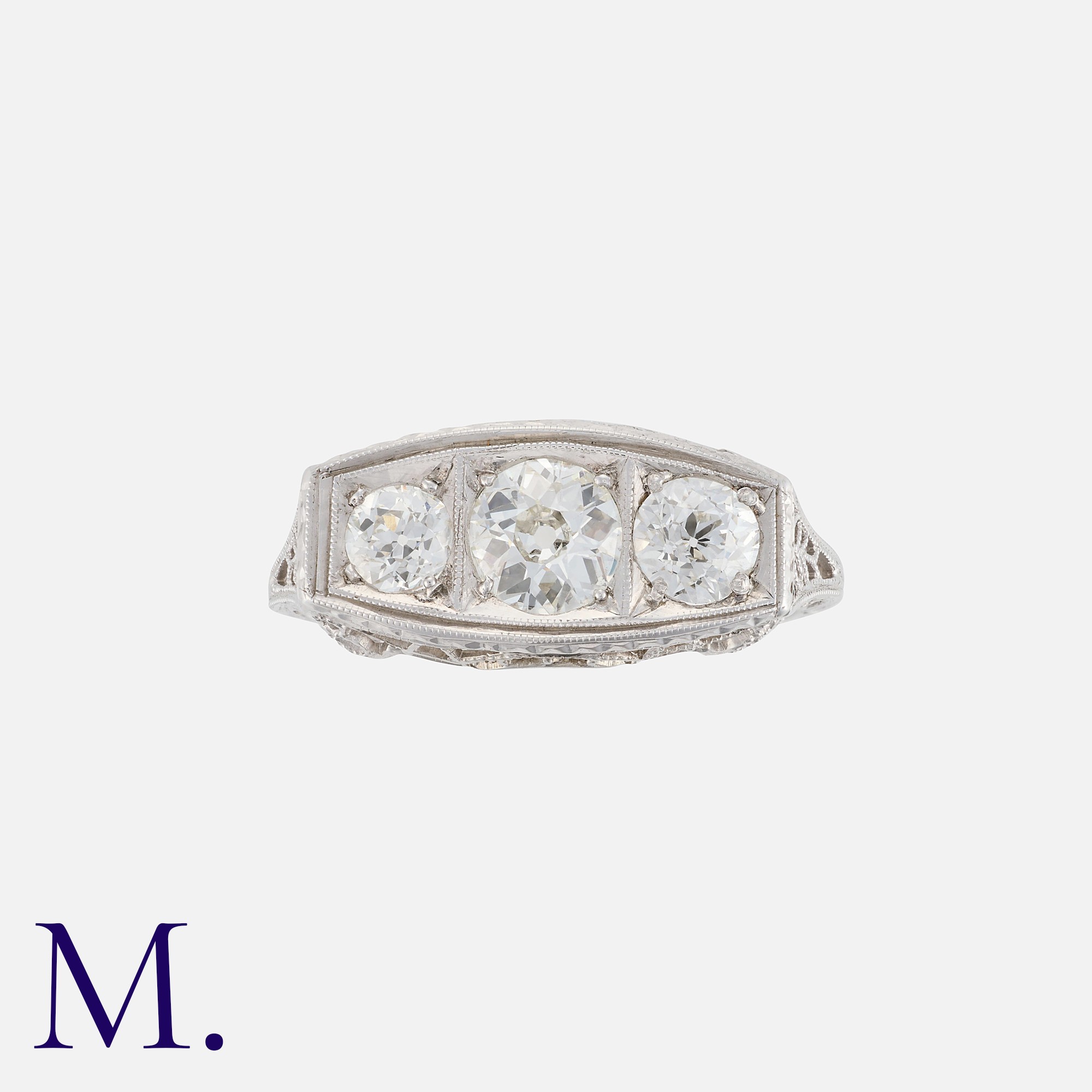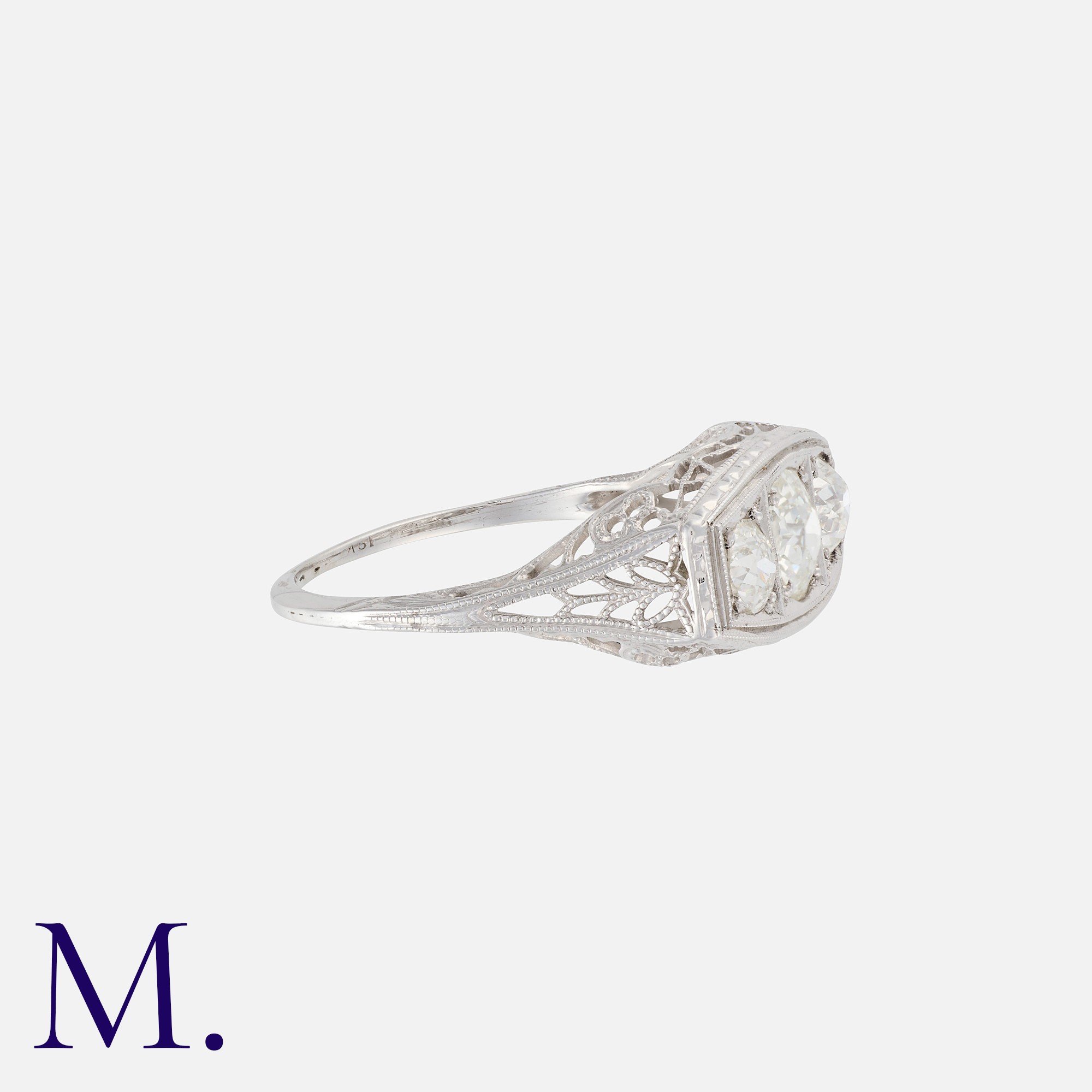 An Art Deco Diamond 3-Stone Ring in 18K white gold, set with 3 transitional cut diamonds weighing approx. 1.1ct in total (the centre stone weighing approximately 0.5ct). Partial stamps of 18 for 18ct gold.
