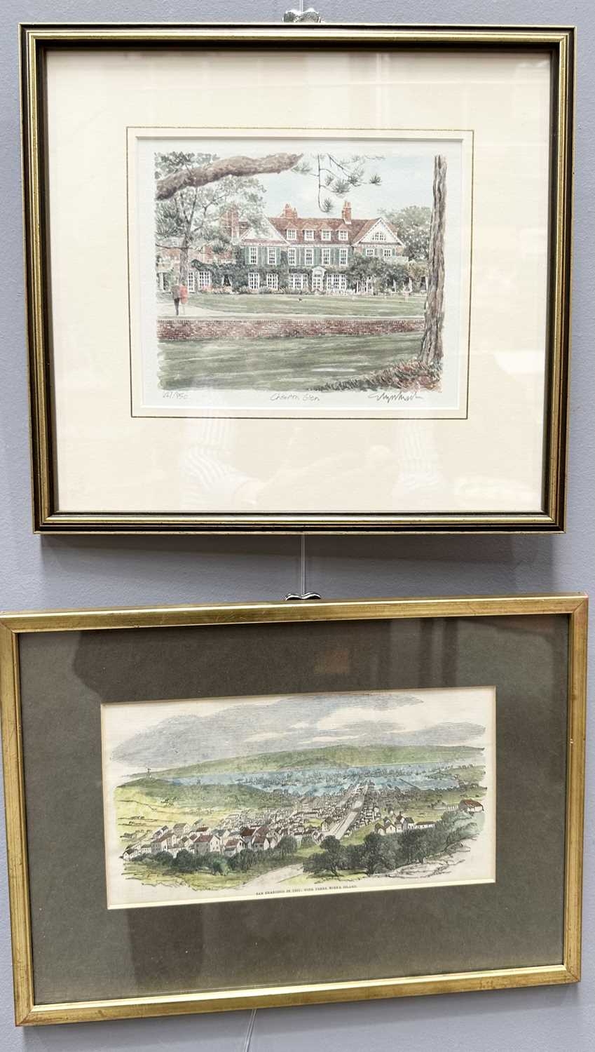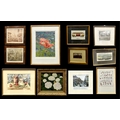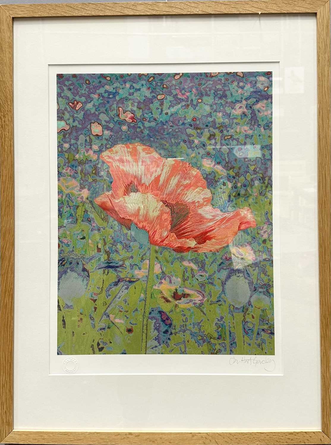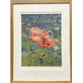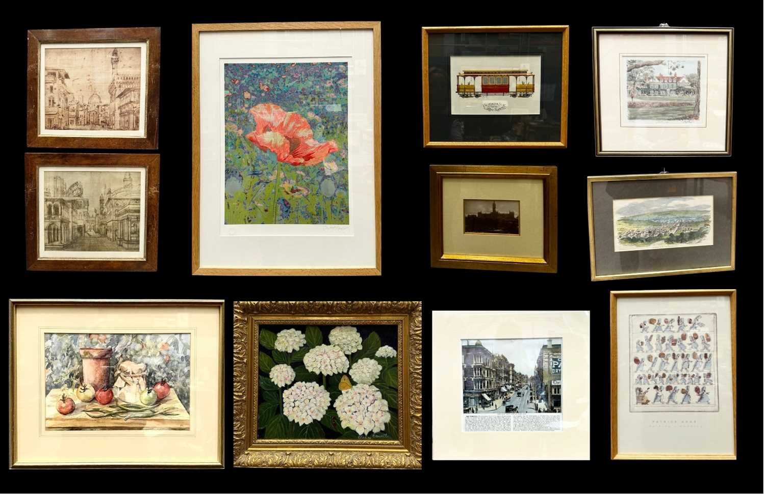 Jon Hart Gardey, (American, 1931-2009) a digital print of a poppy, mounted and framed in a light oak frame, 50cm x 38cm, together with a hand coloured etching of San Francisco in 1851 with Yerba Buena Island, an hand coloured photo-lithograph of Great Avenue San Francisco 1910, mounted, 24cm x 26cm, oil on board of azalea flowers with butterfly, signed l.r Joan Sewell, gilt framed, 24cm x 29.5cm and a number of furnishing pictures (11)