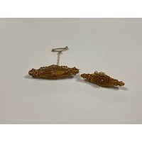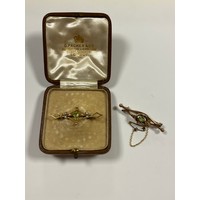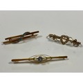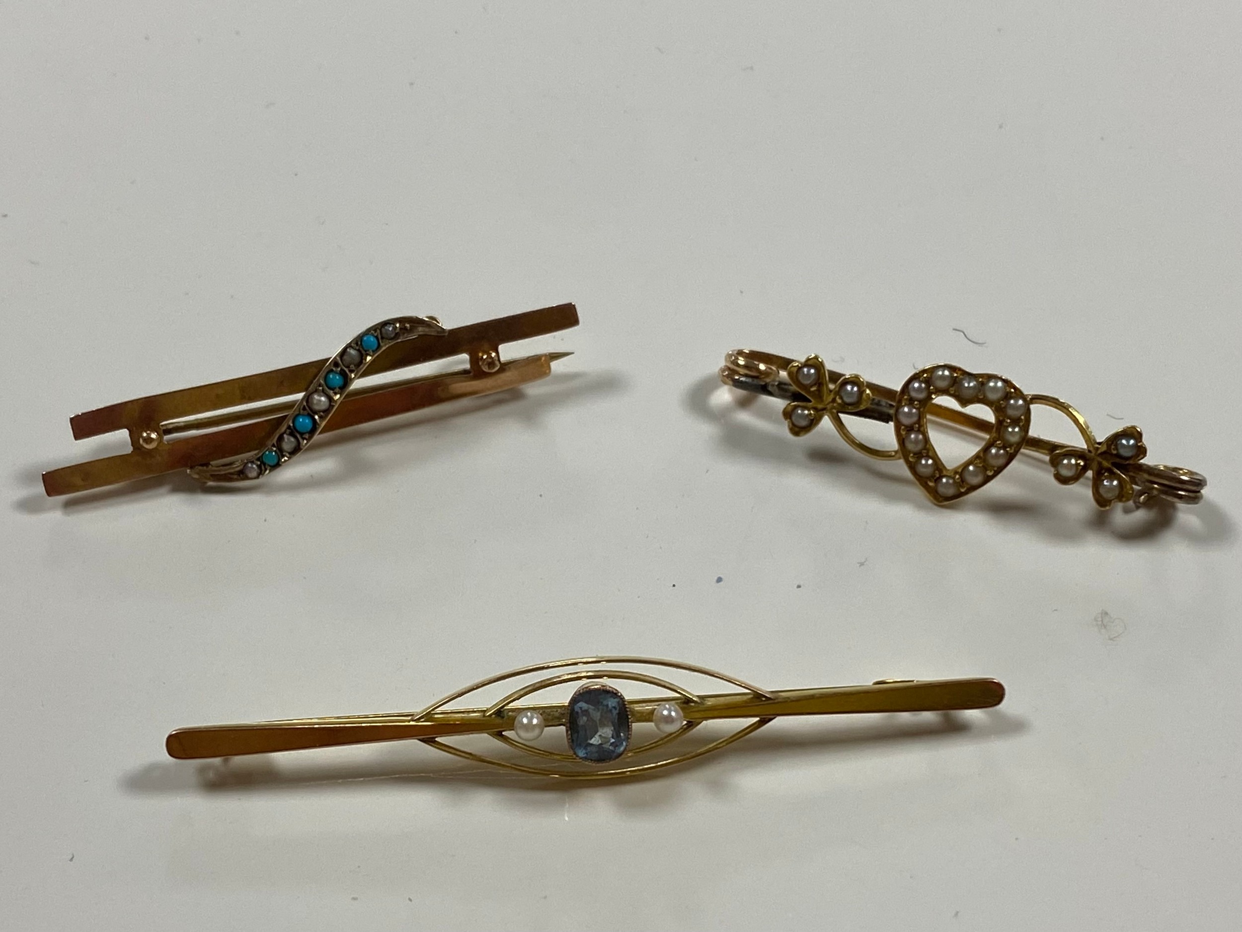 A 9ct gold bar brooch, set with a blue topaz and seed pearls, together with a turquiose and seed pearl bar brooch and another set with split pearls -