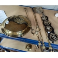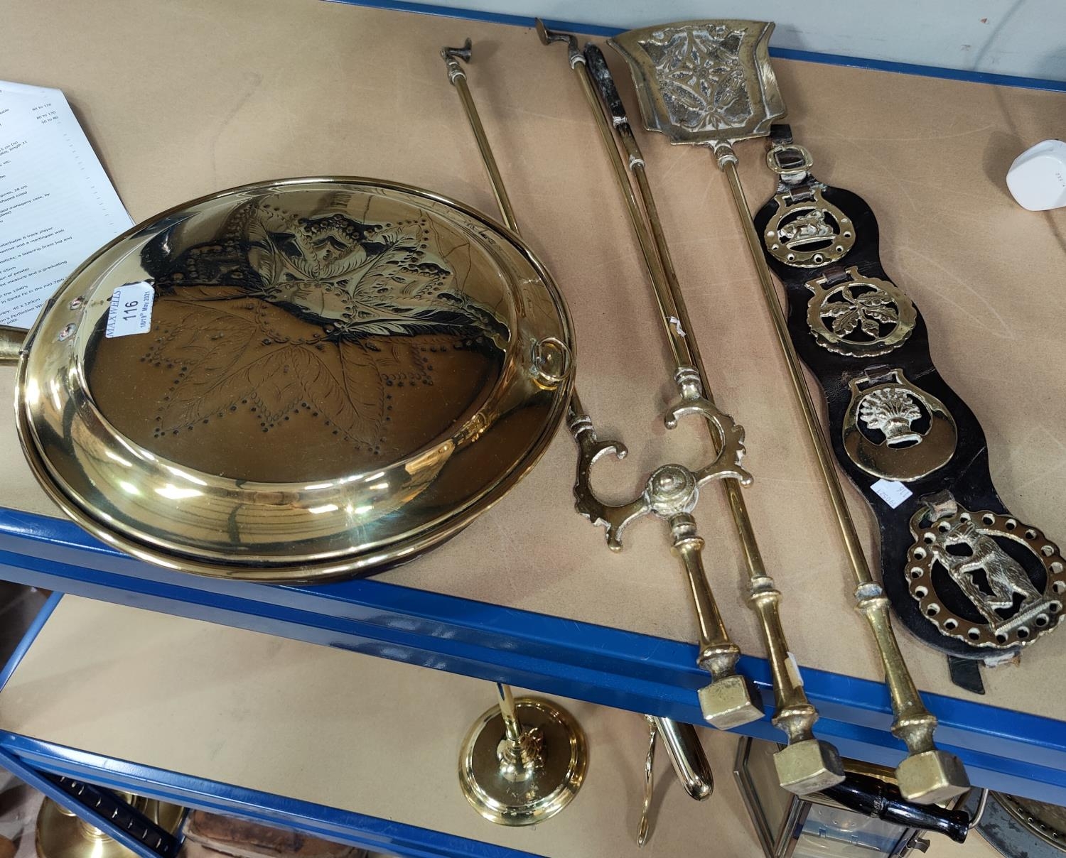 A set of 3 Victorian style brass fire irons, a 19th century brass bed warmer and a martingale with horse brasses