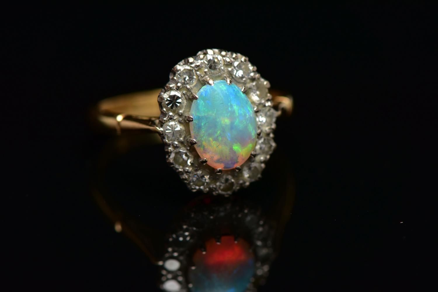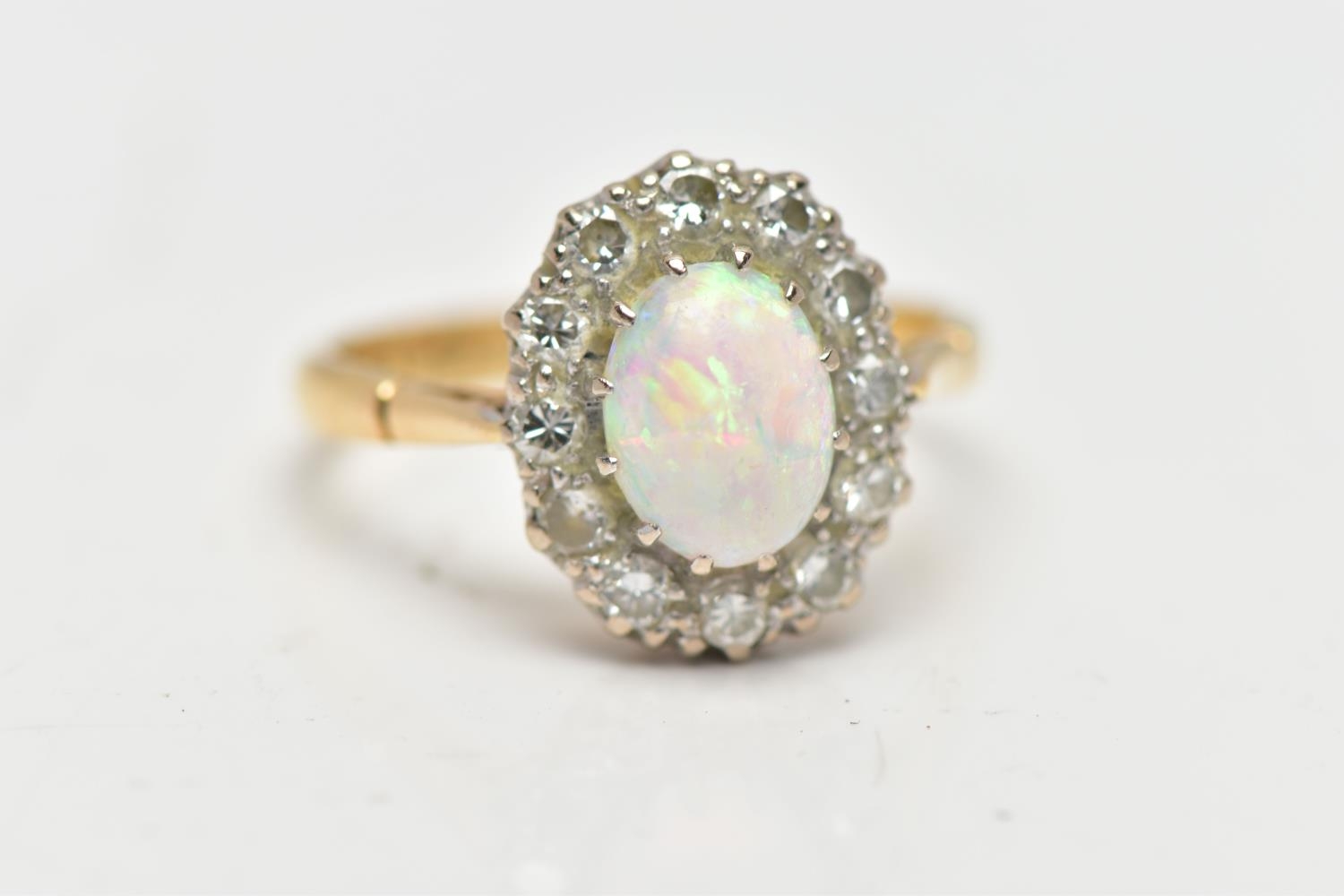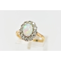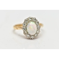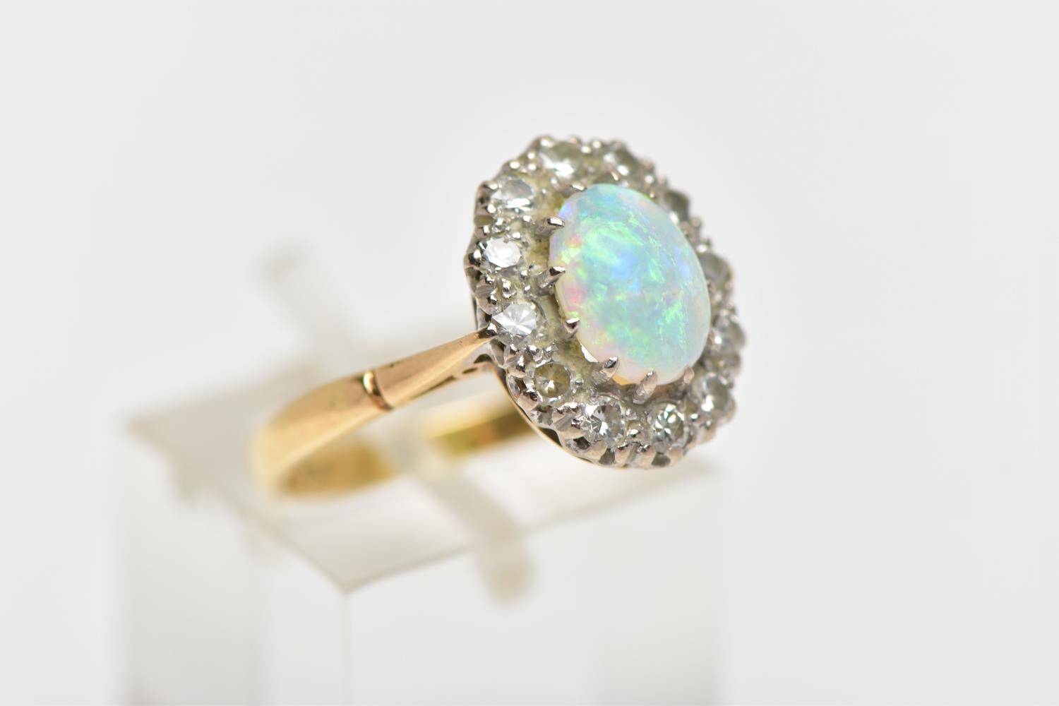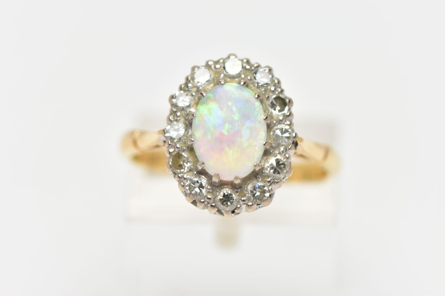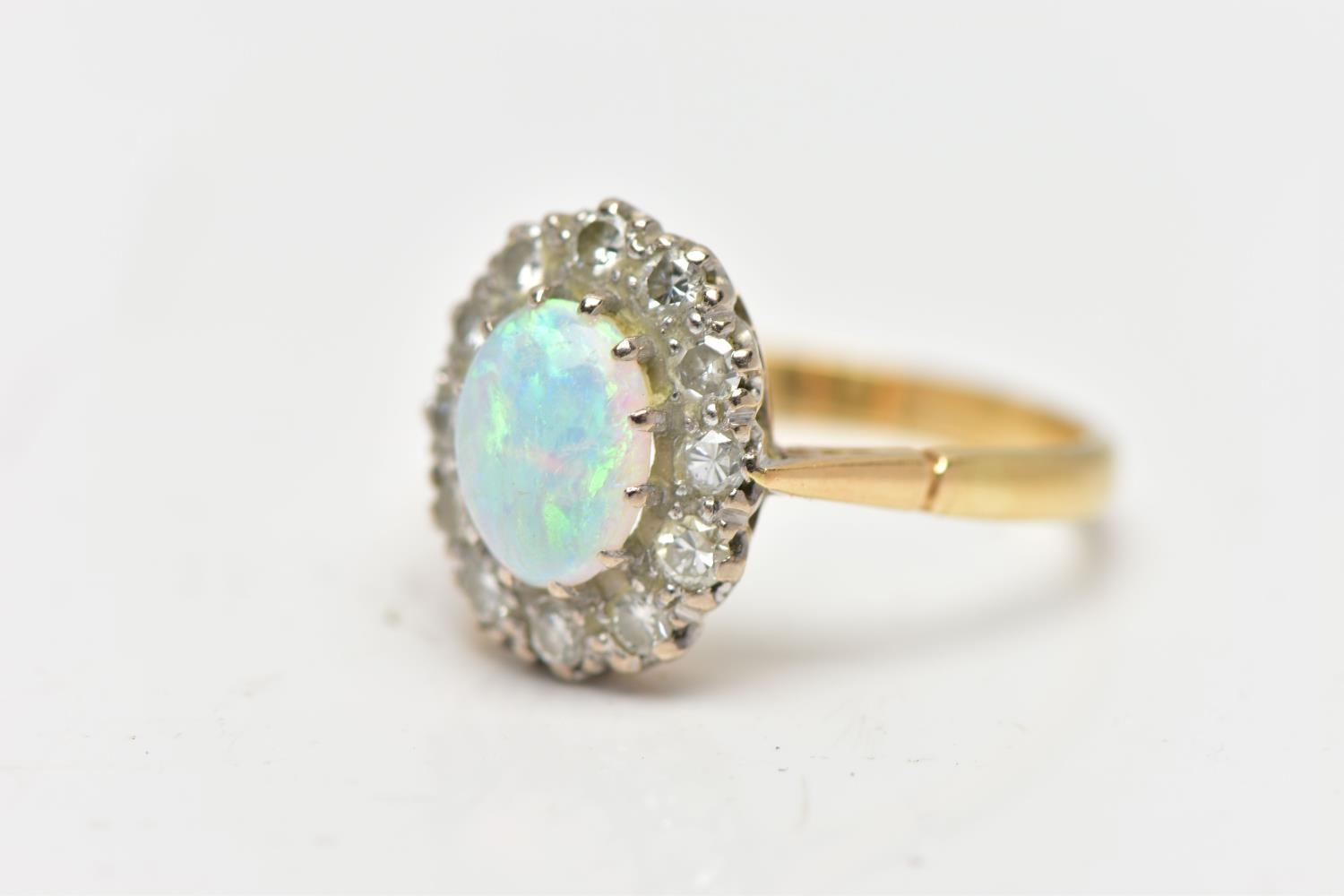 AN OPAL AND DIAMOND CLUSTER RING, set with an oval opal cabochon, measuring approximately 8.2mm x 6.2mm, depth approximately 2.9mm, surrounded by twelve round brilliant cut diamonds, to the tapering shoulders and plain polished band, estimated total diamond weight 0.55ct, assessed colour G-H, assessed clarity VS-SI, stamped 18ct PLAT, approximate gross weight 3.8 grams (condition report: overall condition very good, opal appears vibrant with strong play of colour, orange and red flashes present, together with violet, blue and green, light abrasion to opal surface, diamonds bright, lively and well matched, one single cut diamond present to surround)