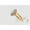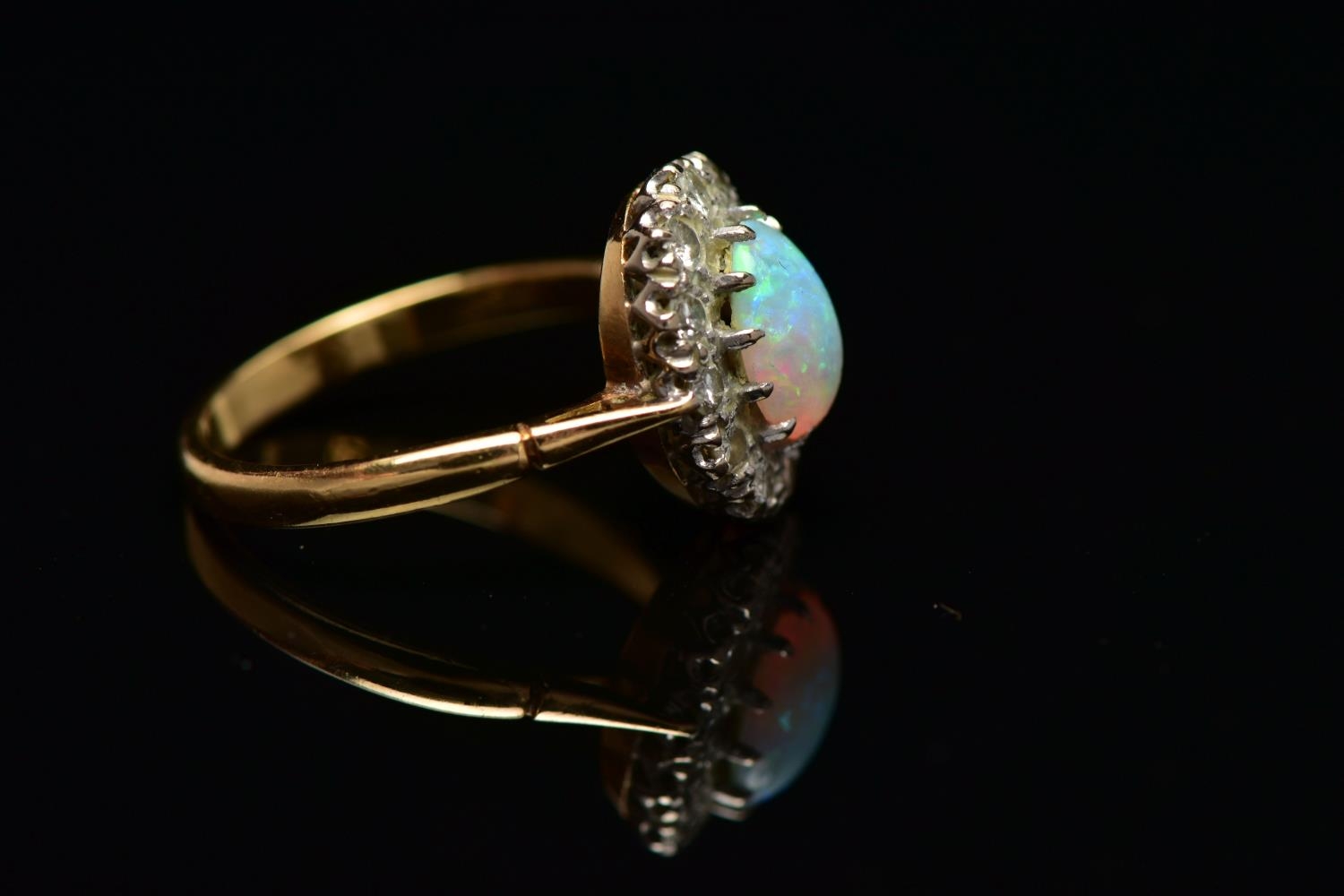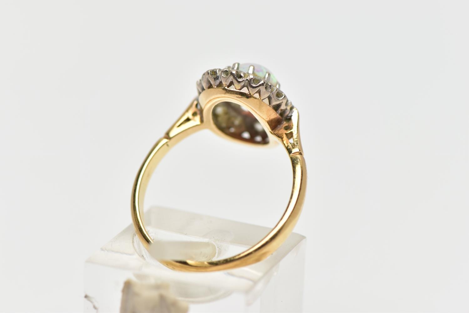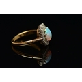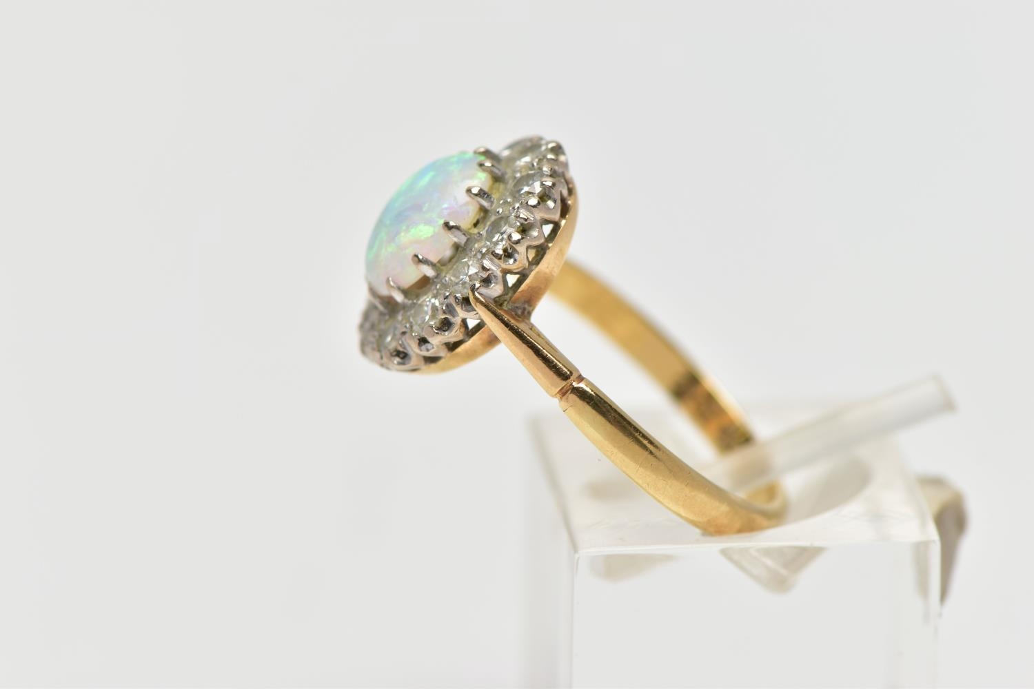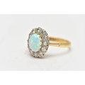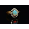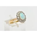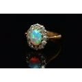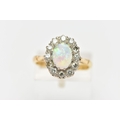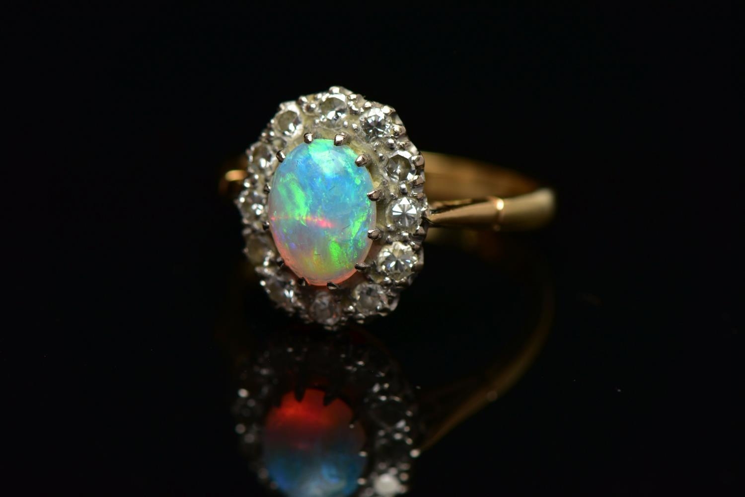 AN OPAL AND DIAMOND CLUSTER RING, set with an oval opal cabochon, measuring approximately 8.2mm x 6.2mm, depth approximately 2.9mm, surrounded by twelve round brilliant cut diamonds, to the tapering shoulders and plain polished band, estimated total diamond weight 0.55ct, assessed colour G-H, assessed clarity VS-SI, stamped 18ct PLAT, approximate gross weight 3.8 grams (condition report: overall condition very good, opal appears vibrant with strong play of colour, orange and red flashes present, together with violet, blue and green, light abrasion to opal surface, diamonds bright, lively and well matched, one single cut diamond present to surround)