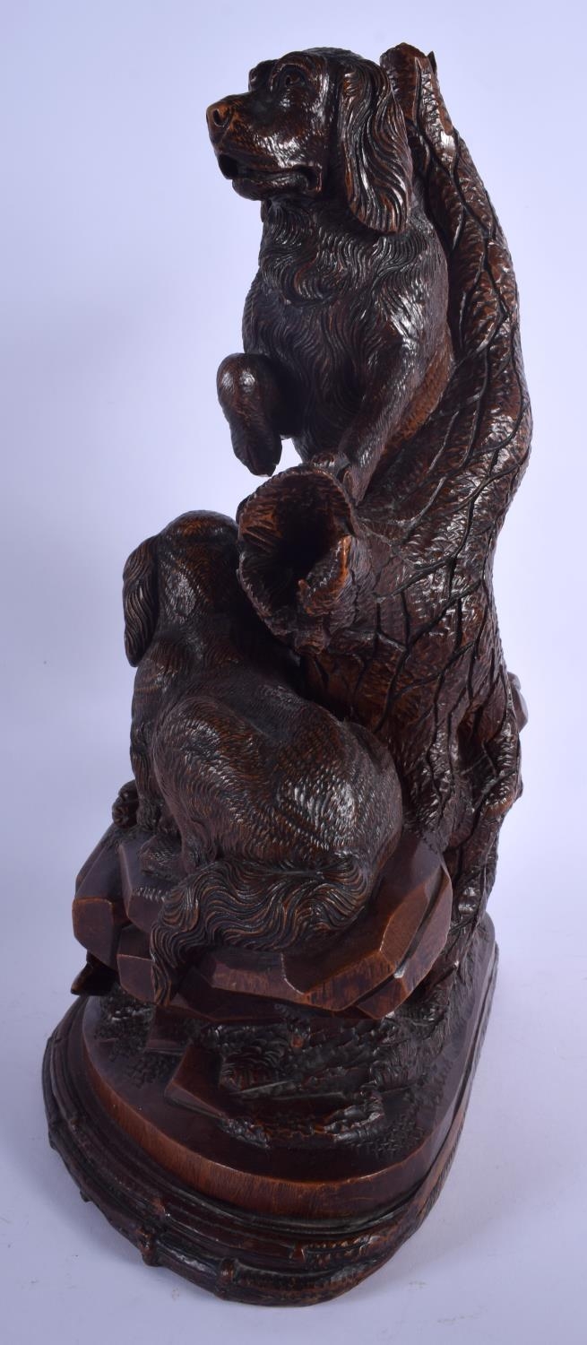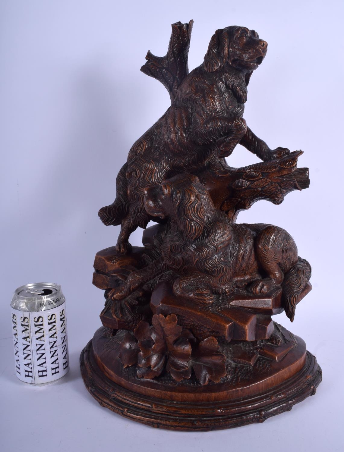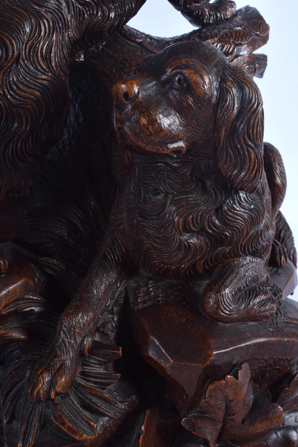 A LARGE 19TH CENTURY BAVARIAN BLACK FOREST CARVED WOOD FIGURAL GROUP modelled as two hounds upon a rocky outcrop. 45 cm x 23 cm.