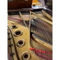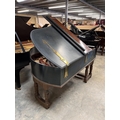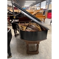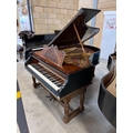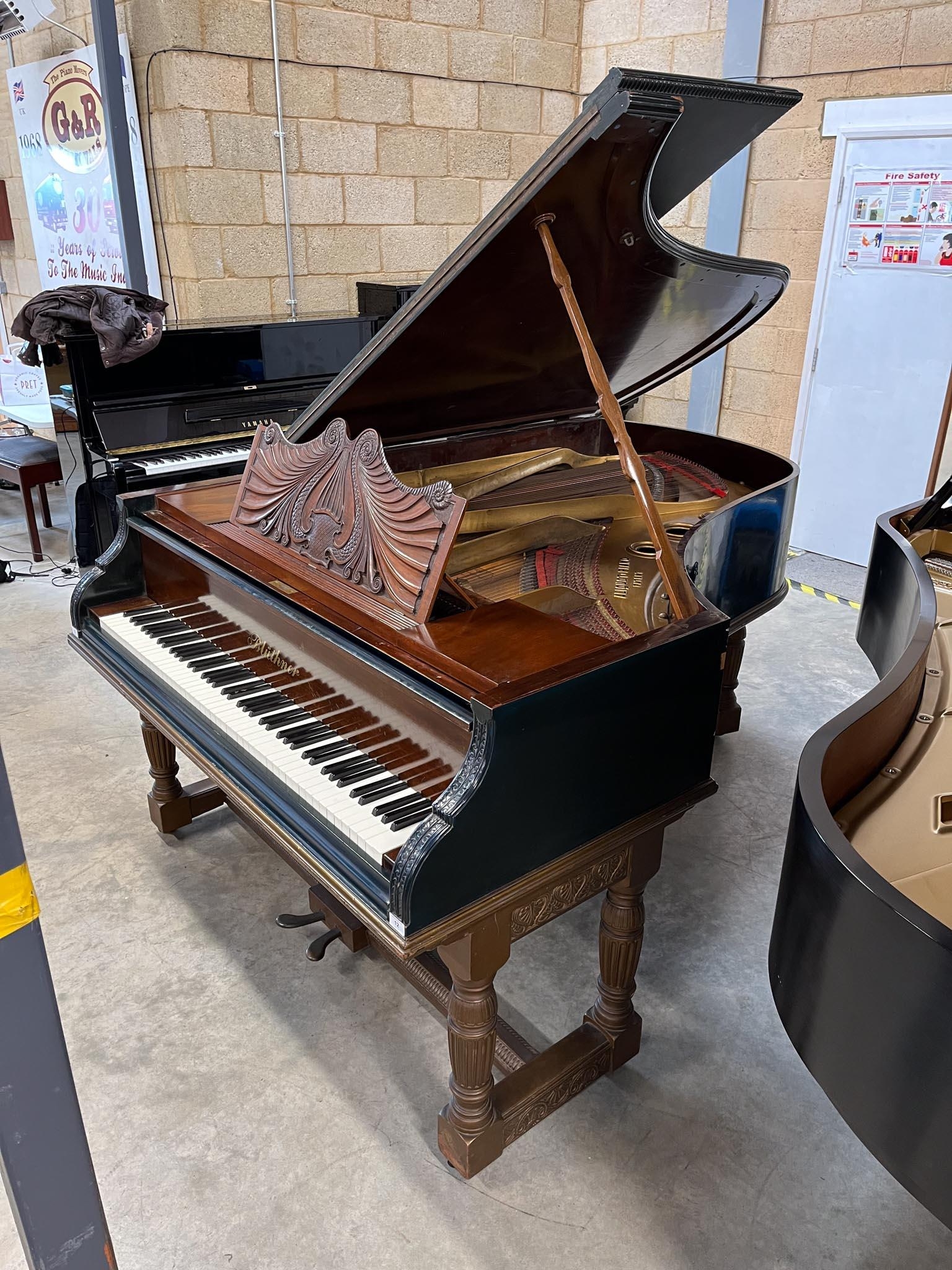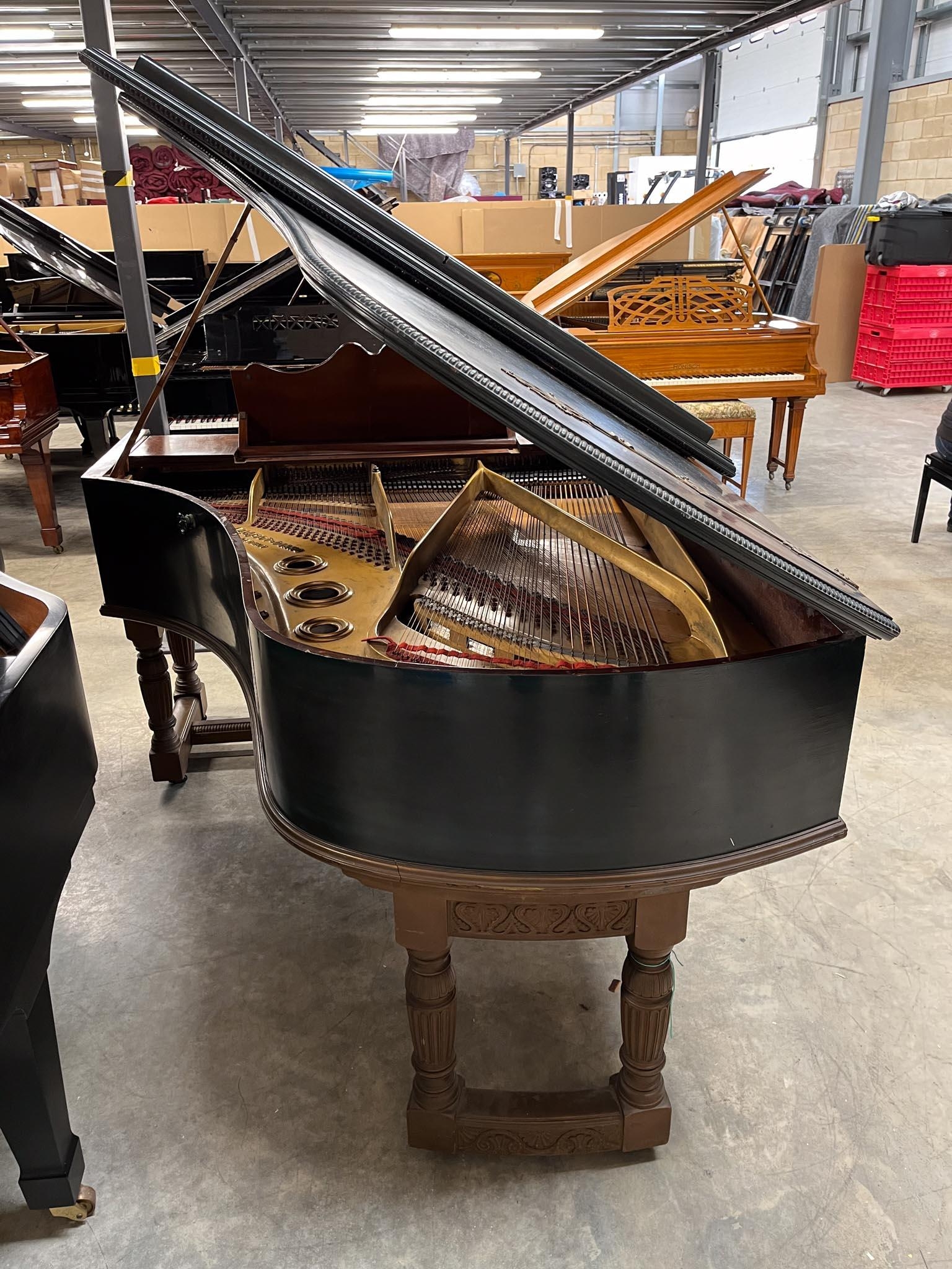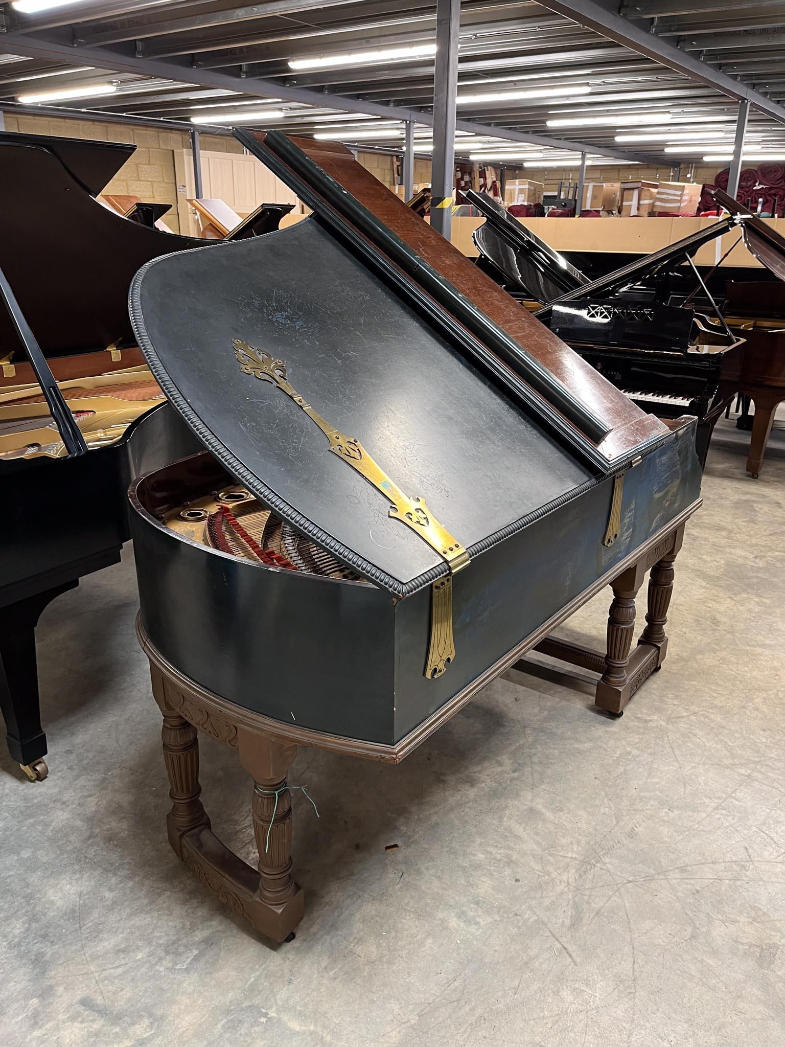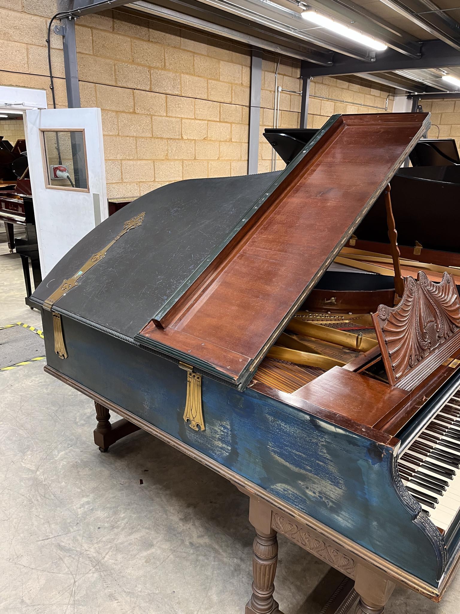 A grand piano in a carved mahogany and blue painted case, raised on 3 sets of dual turned legs united by stretchers. AMENDMENT Is 6ft 7in.