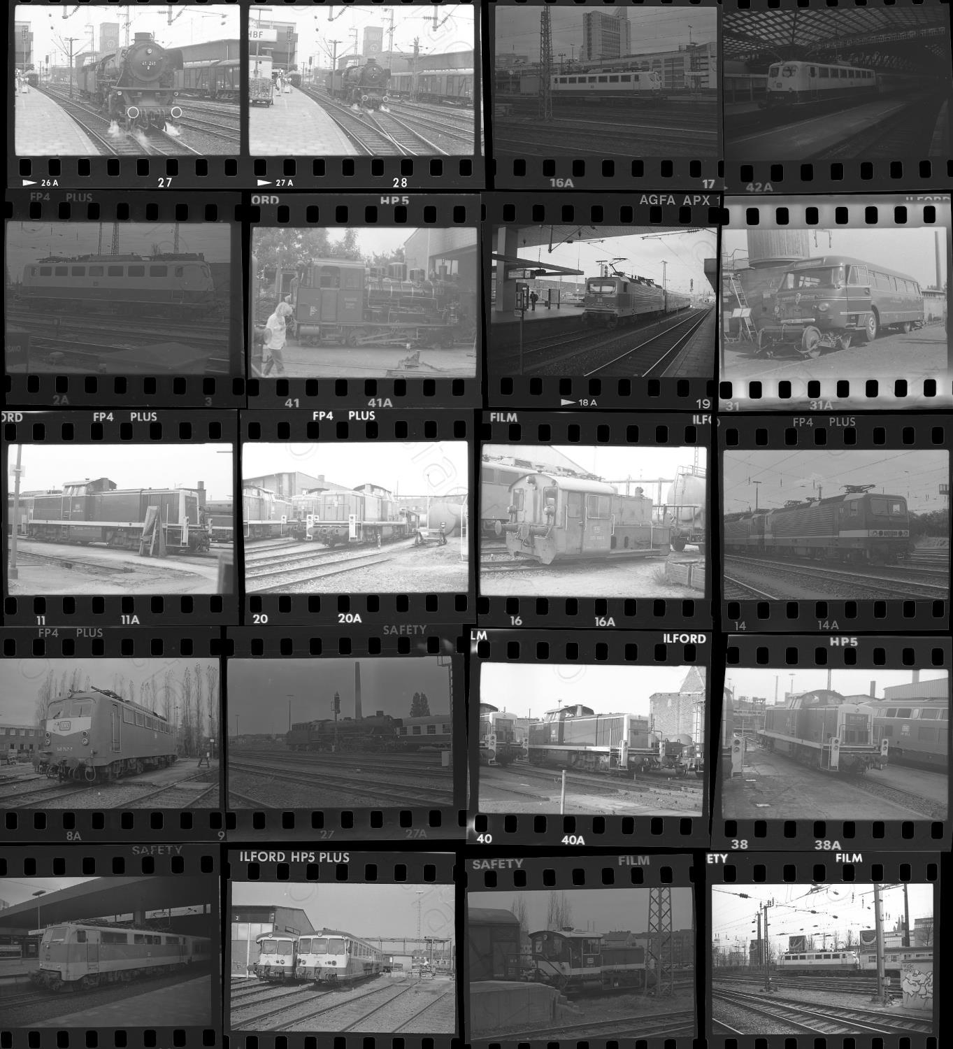 Railway. German DB Modern Traction with a few preserved steam. Approx. 100, individual 35mm black and white negatives. Taken between 1991-94 and featuring classes 110, 332, 515, 140, 141, 143, 290 and others. Locations include: Leipzig West, Paderborn, Rheydt, Kleve, Bonn, Krefeld, Dortmund, Aachen West, Koln, Dussledorf, Hildersdorf, Berlin Zoo Garten and Bochum. Note the locations have not been checked for accuracy. All captioned, sold with copyright, sample illustrated.