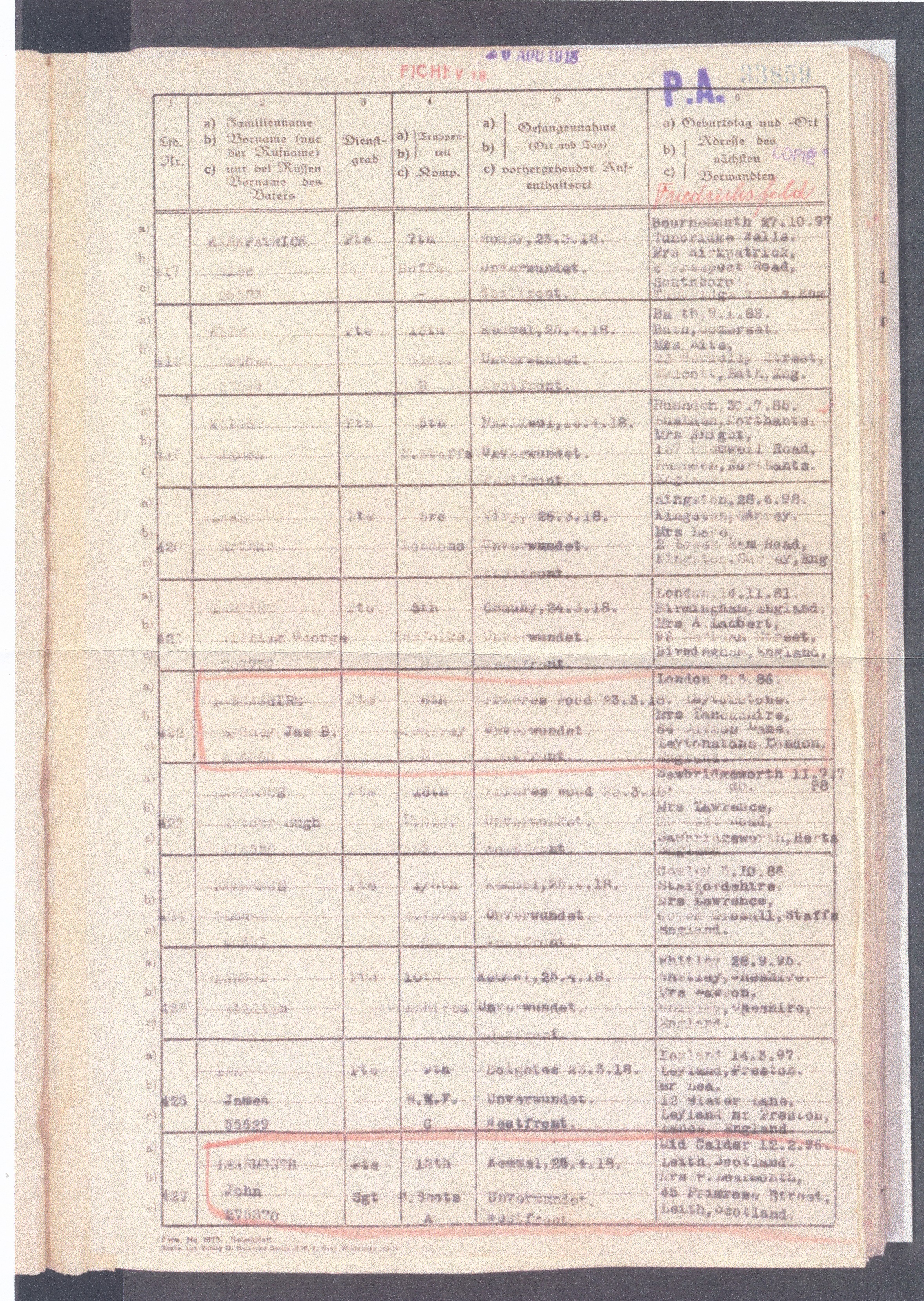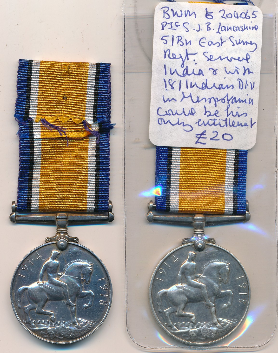 1. British War Medal to 204065 Pte S.J.B. Lancashire E. Surr R. He was taken Prisoner of War with 8th Bn at Frieres Wood 23/3/18. With copied POW roll.