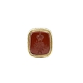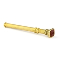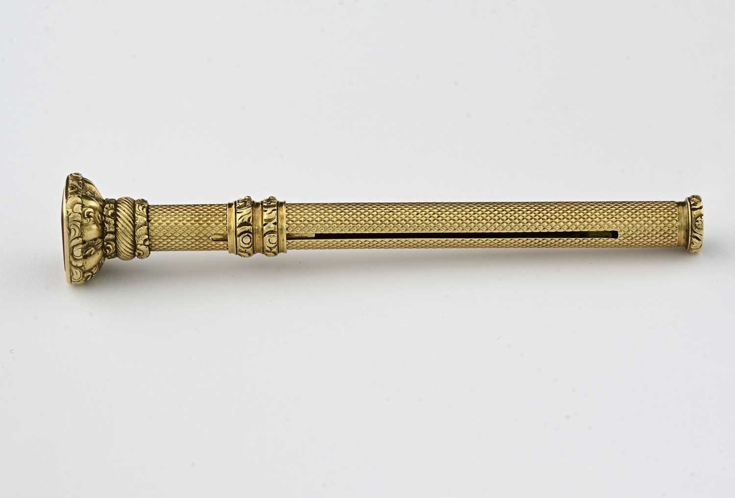 A 19th century gold retractable pencil, with carved carnelian intaglio terminal, length 9.3cm, 14.5g.