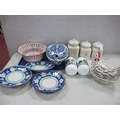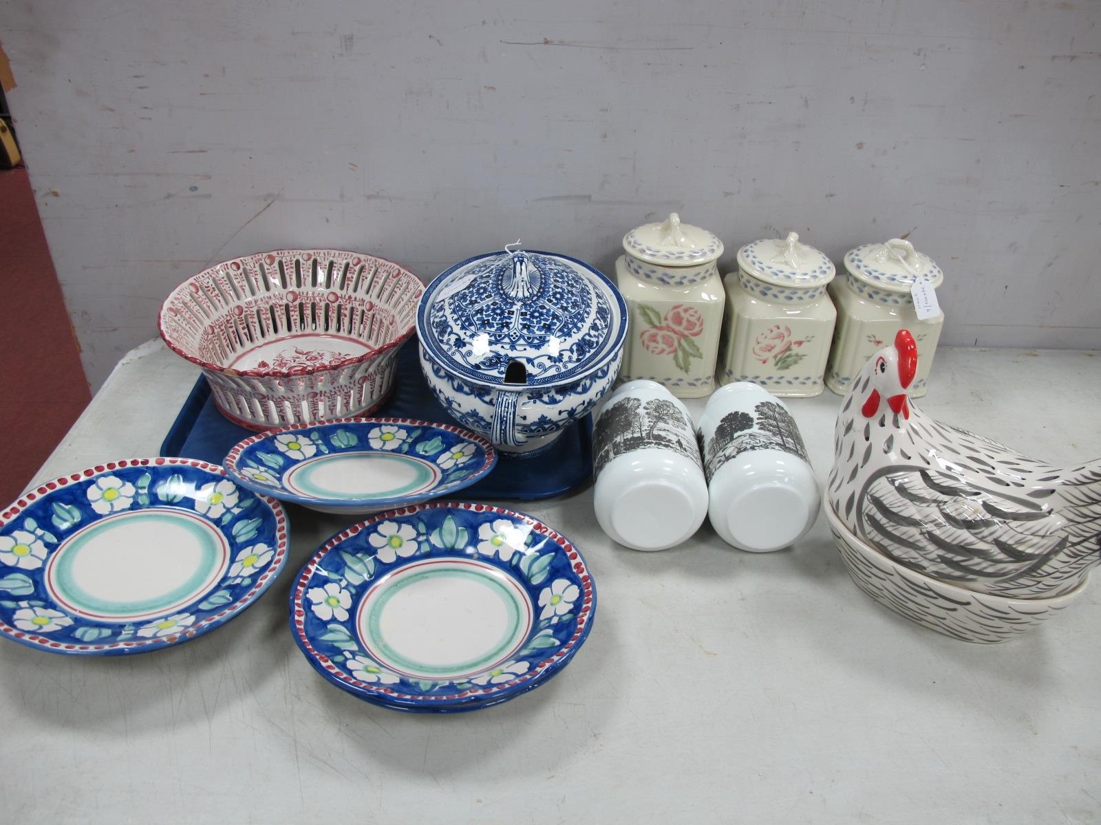 Royal Winton Spongeware Storage Jars, hand painted pottery hen on nest, Italian plates, blue and white oval tureen, etc:- Two Trays