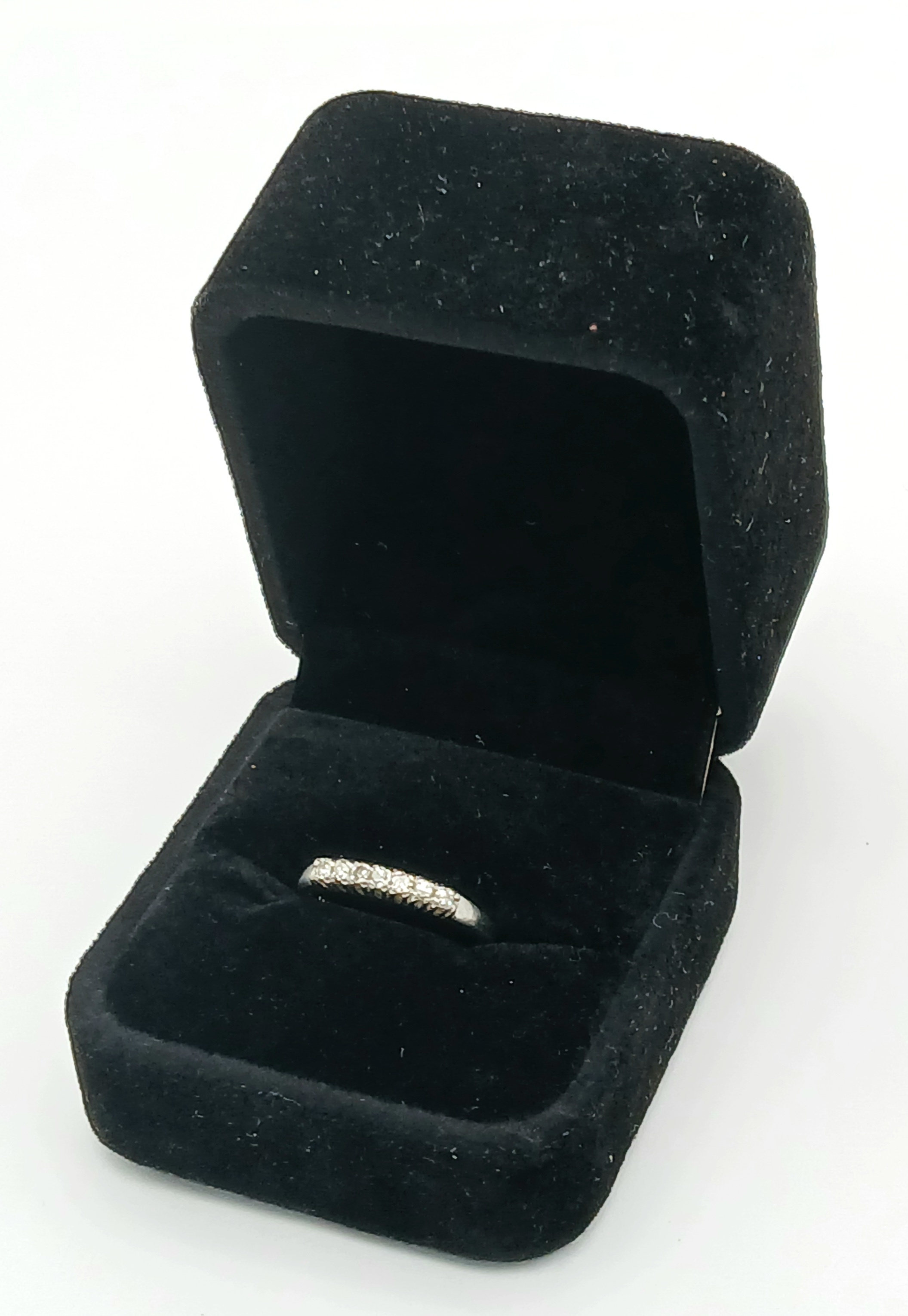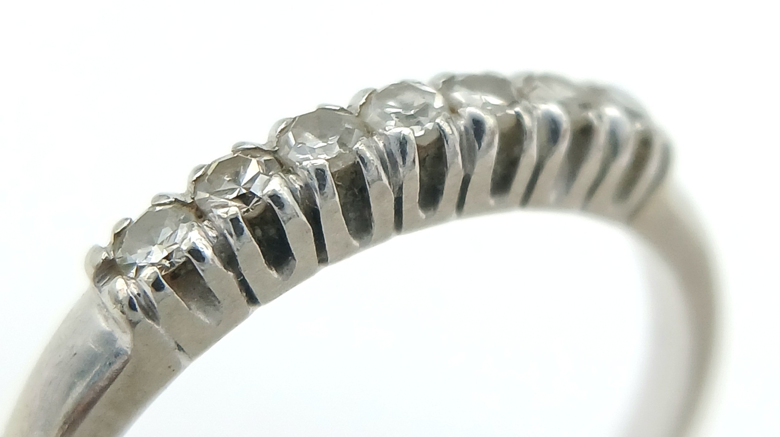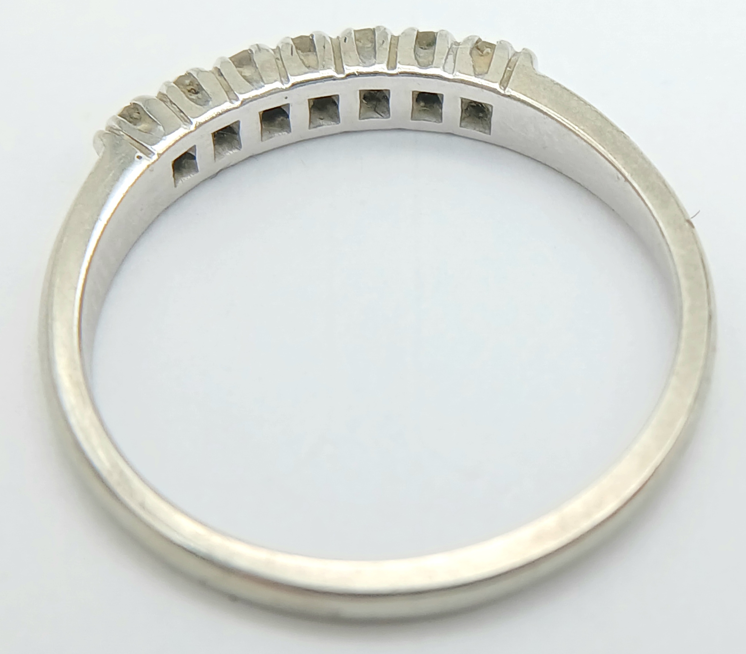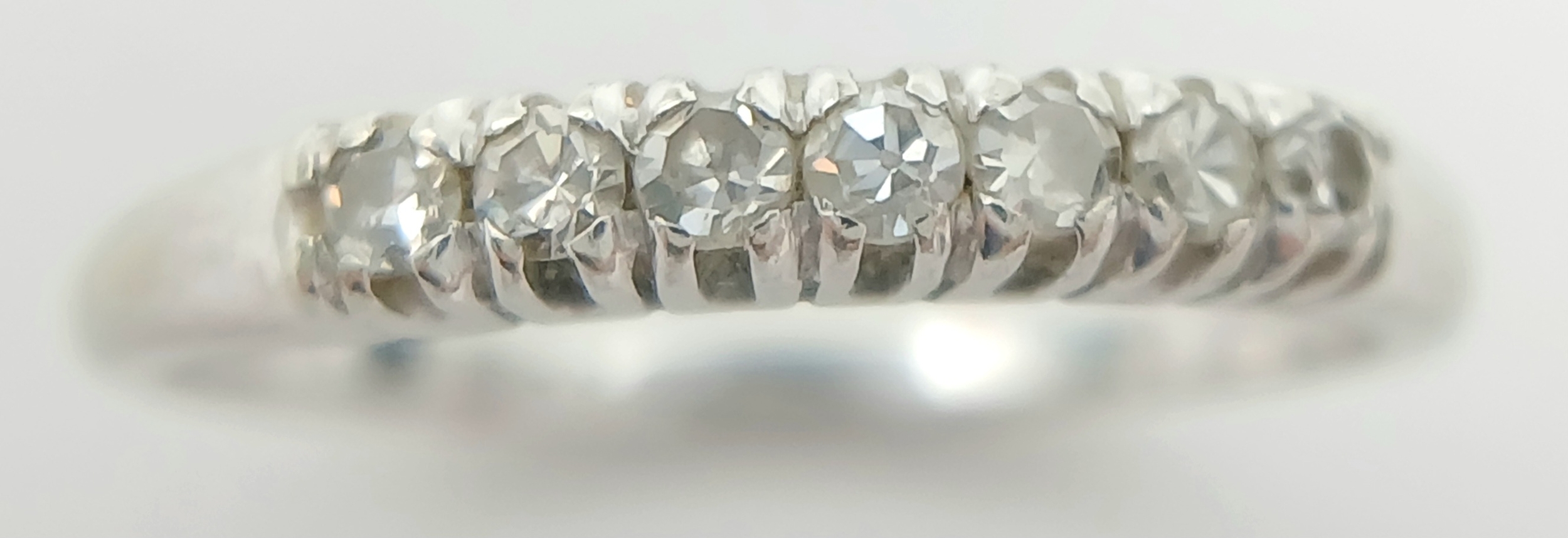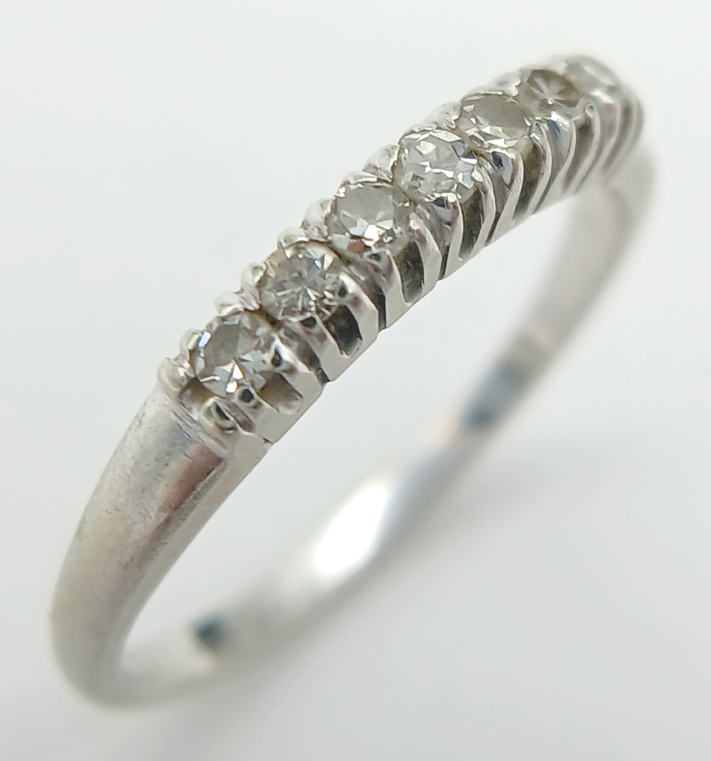 14 Carat White Gold Seven Diamond Ring Size M. The Ring is set with Seven 1.5mm Round Cut Diamonds. Gross Weight 1.94 Grams. Comes in presentation box.