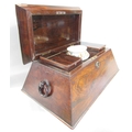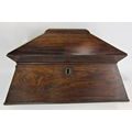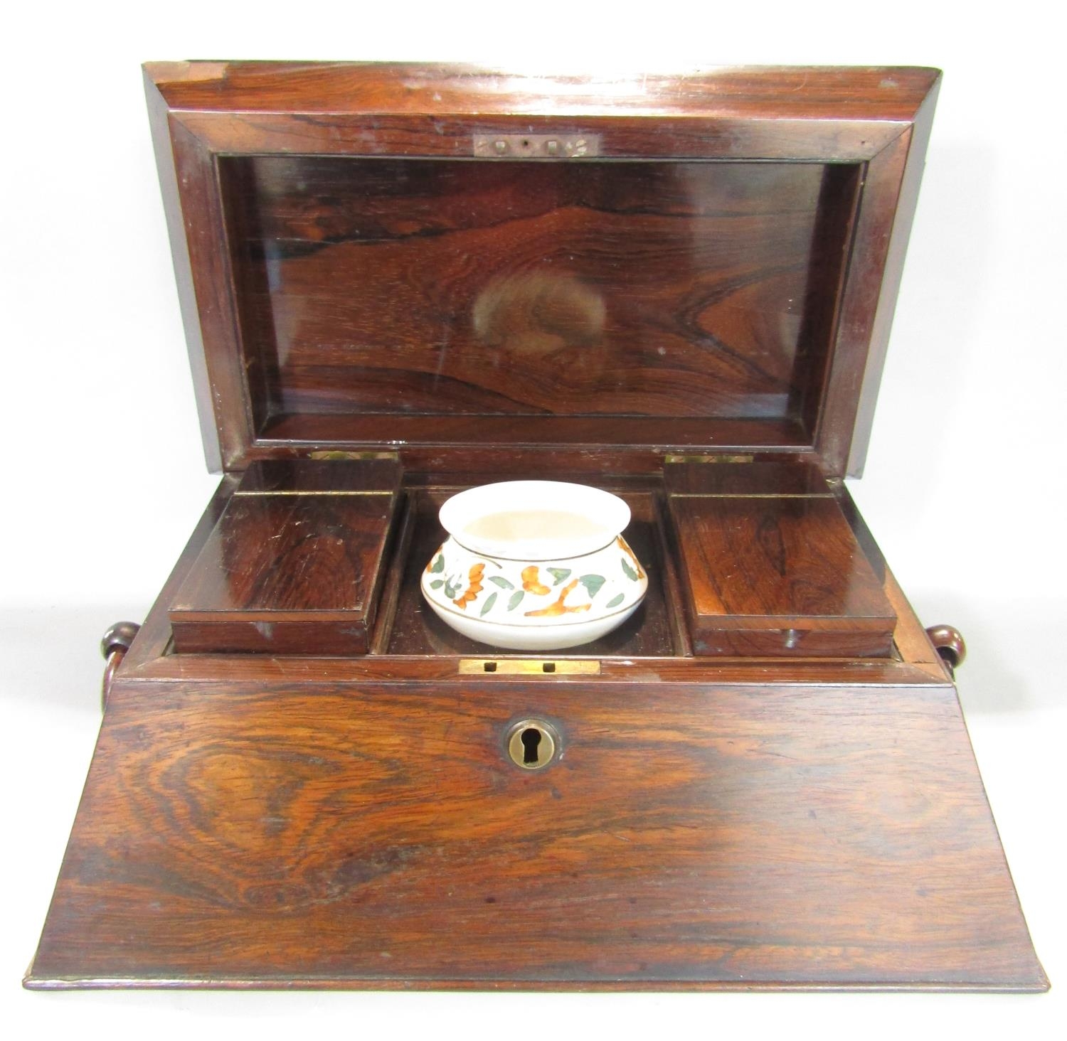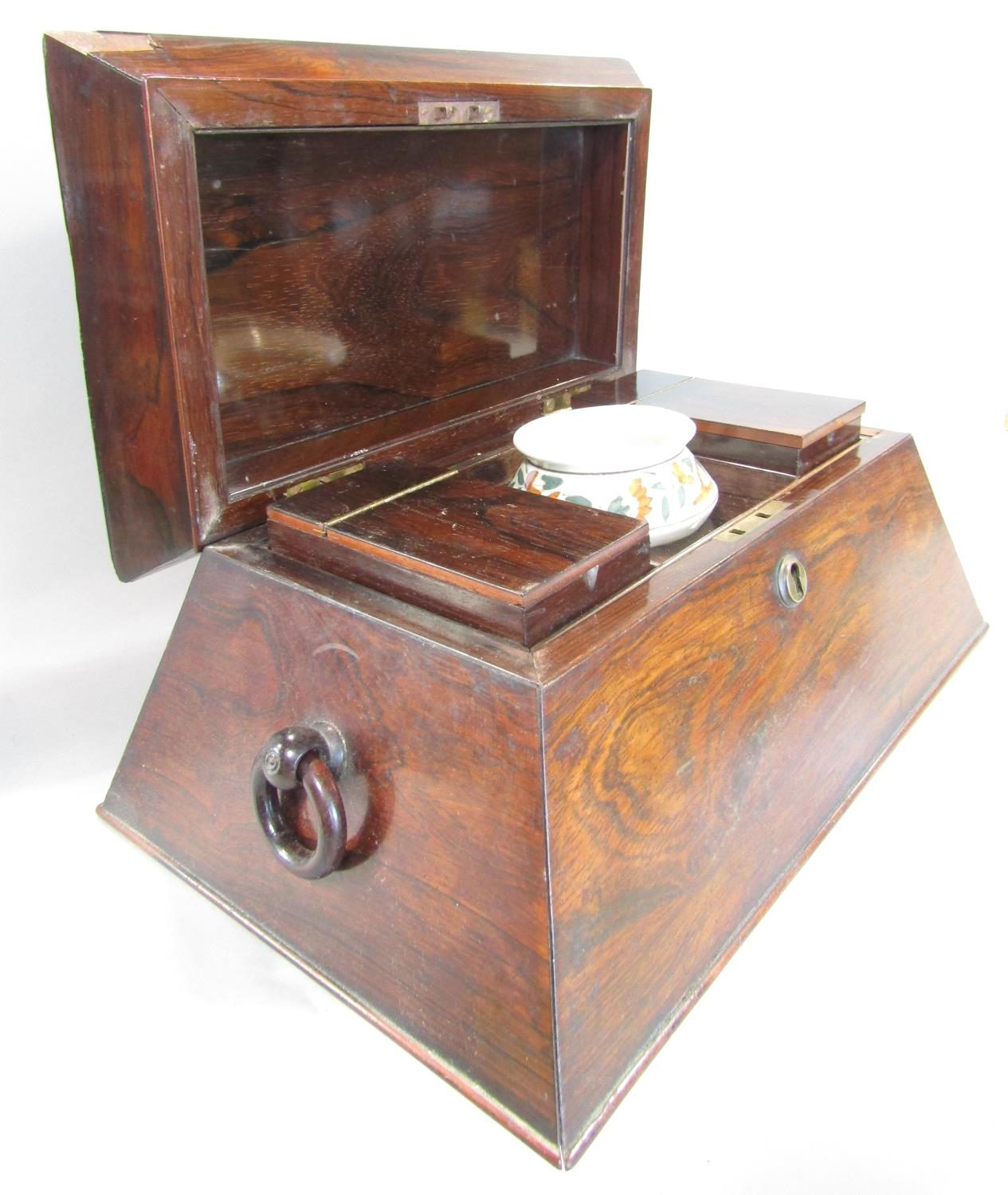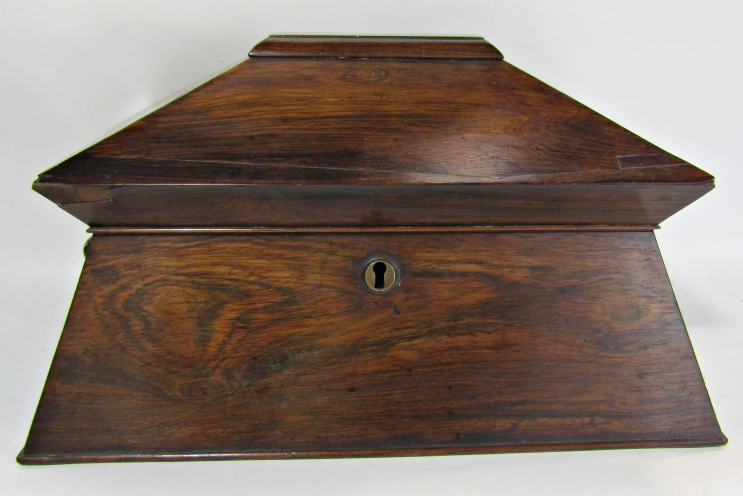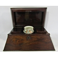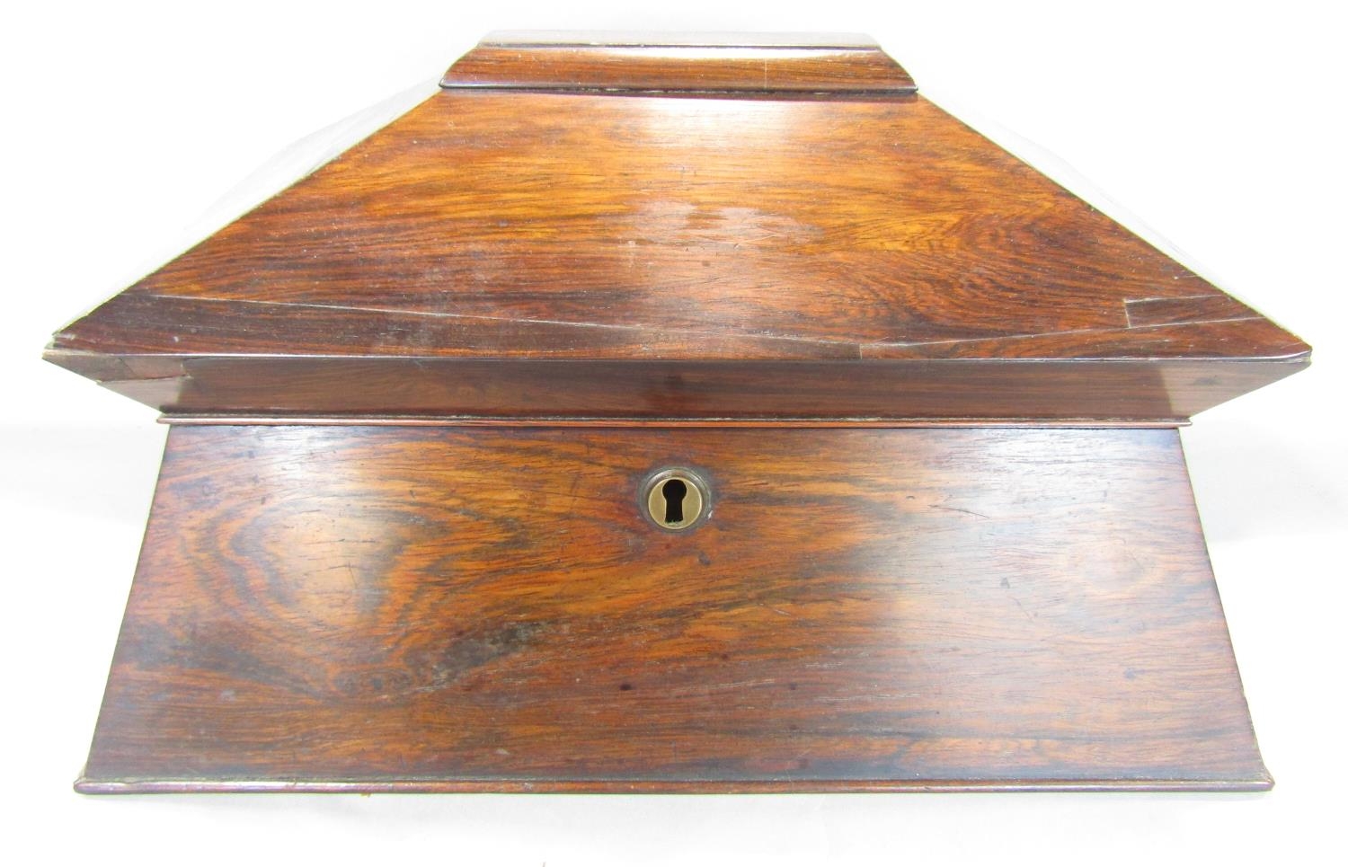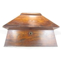A large Regency rosewood sarcophagus tea caddy, with a well fitted interior mixing bowl (not original) with wooden ring handles, 42cm wide x 26cm deep x 25cm high.
