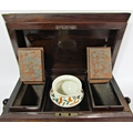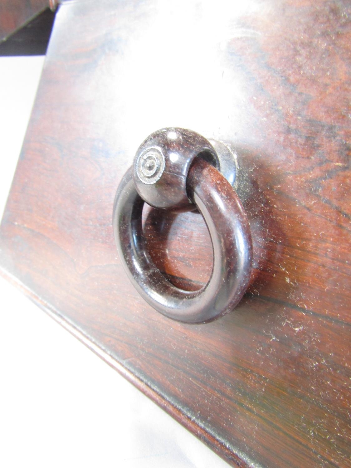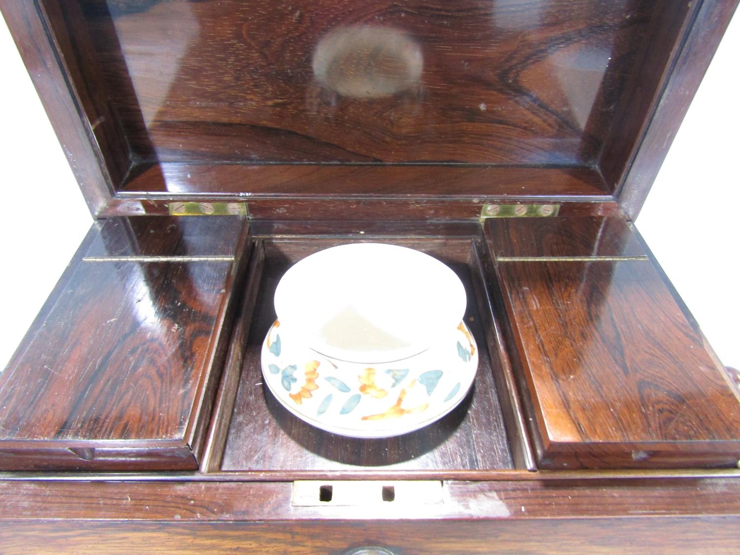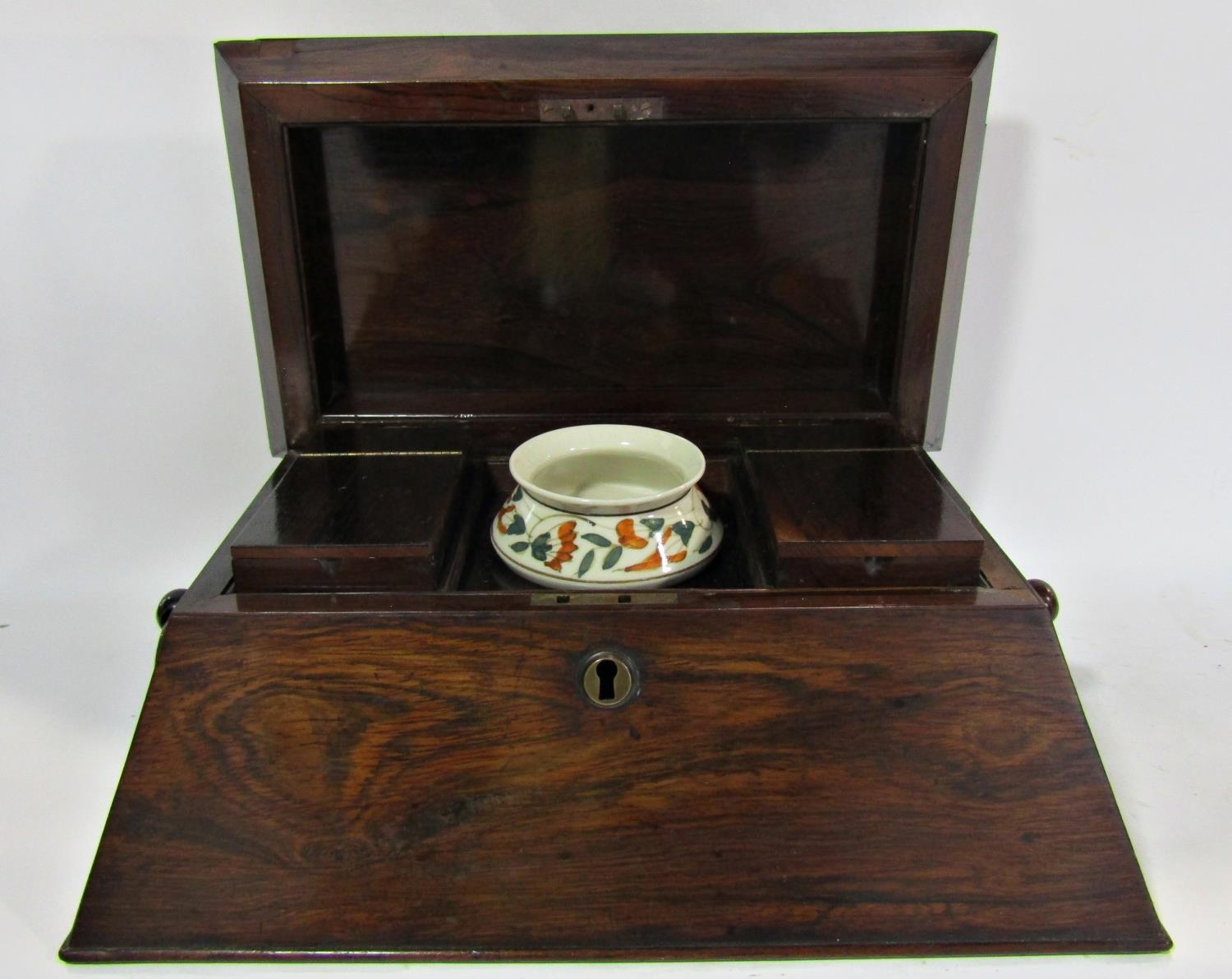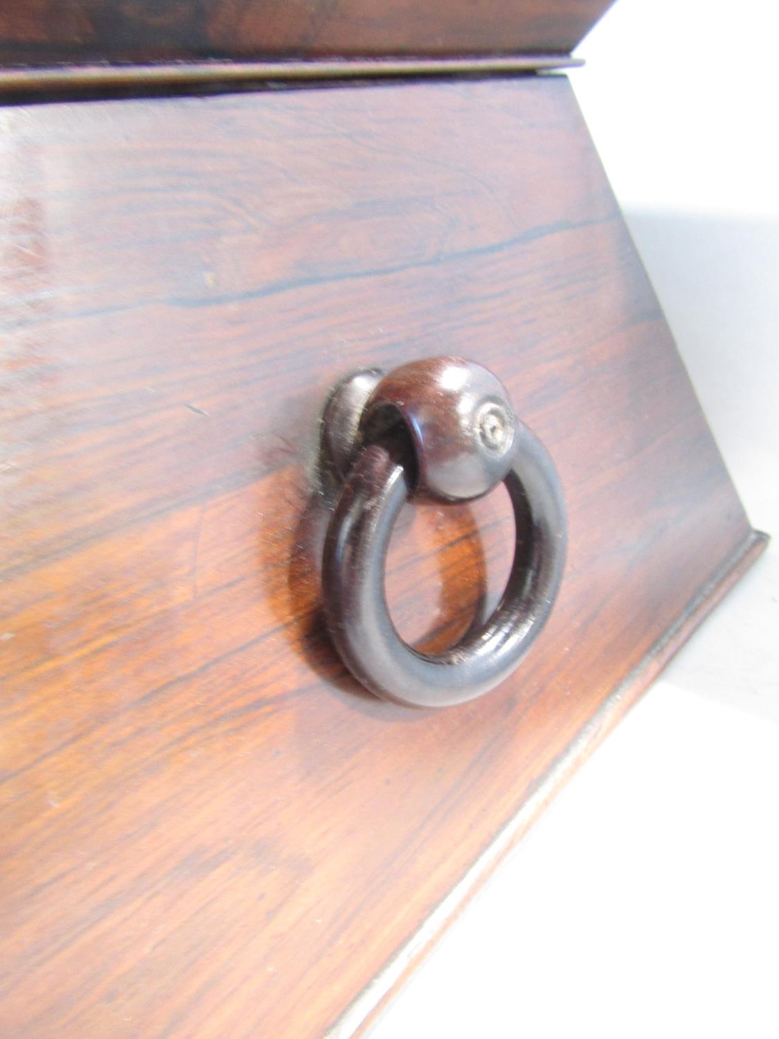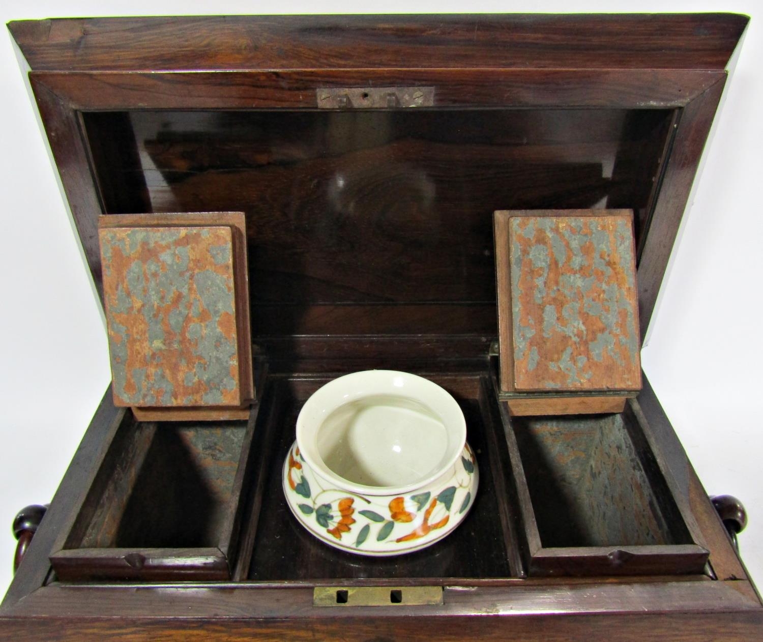 A large Regency rosewood sarcophagus tea caddy, with a well fitted interior mixing bowl (not original) with wooden ring handles, 42cm wide x 26cm deep x 25cm high.