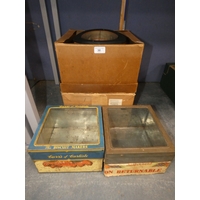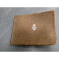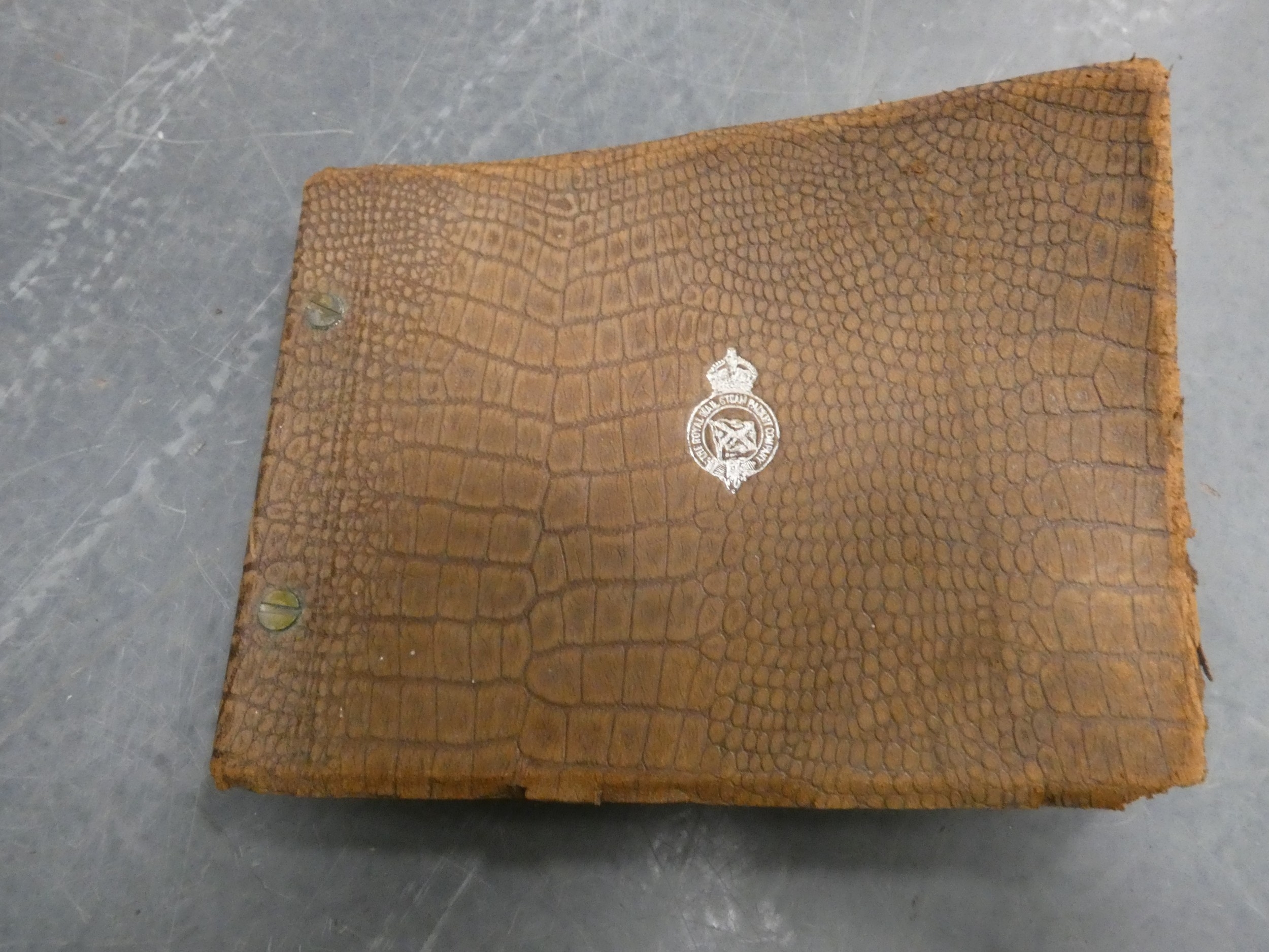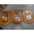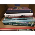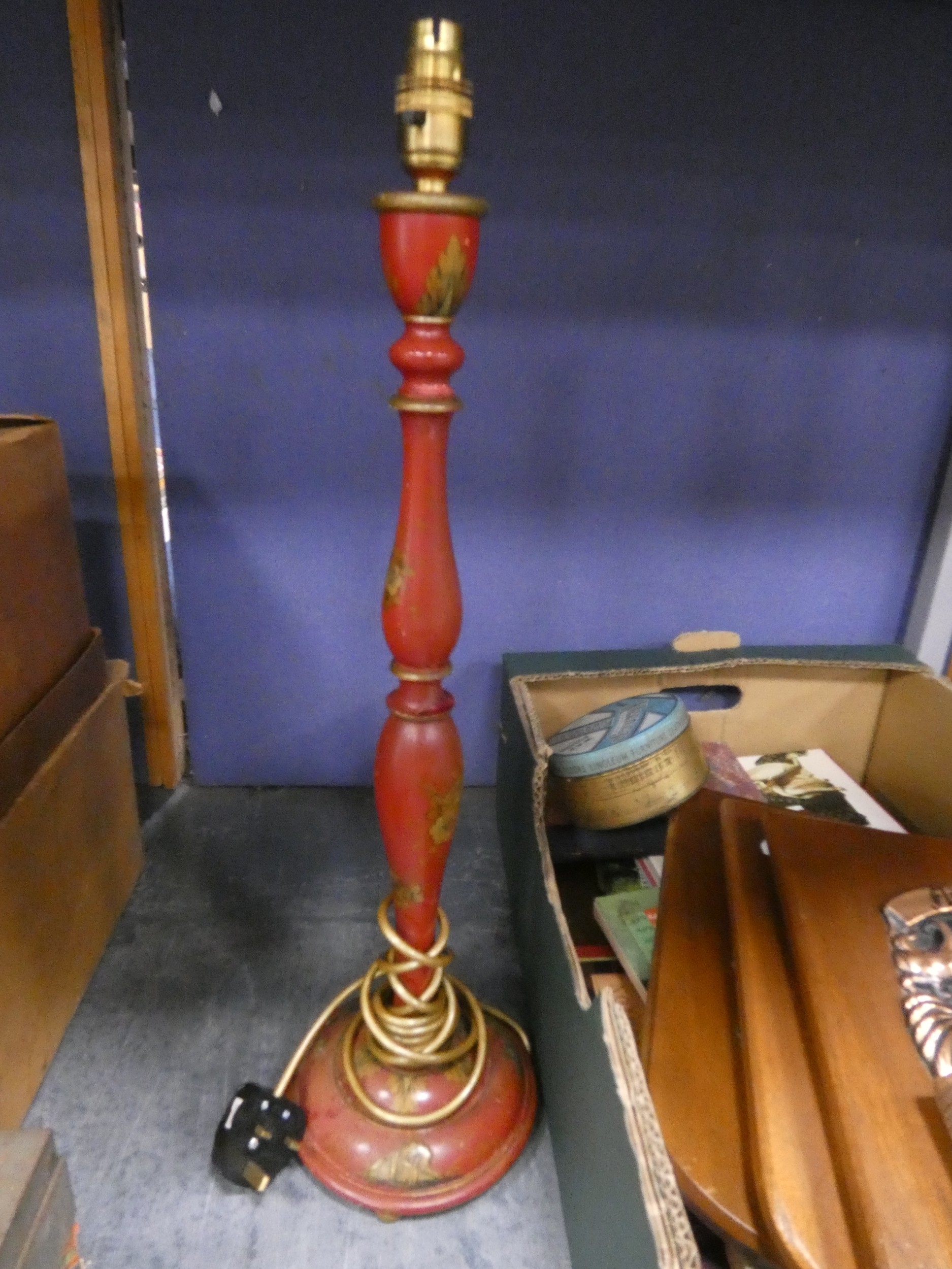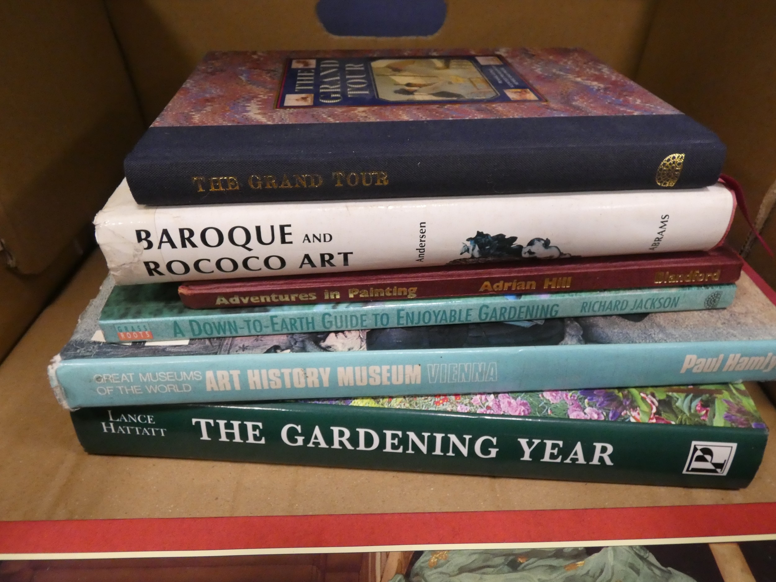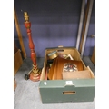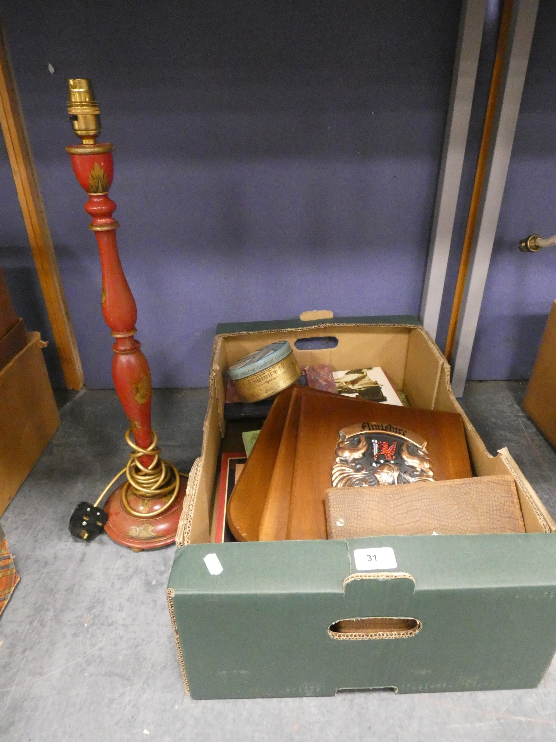 Carton containing a chinoiserie table lamp, books, armorial plaques, postcard album etc.