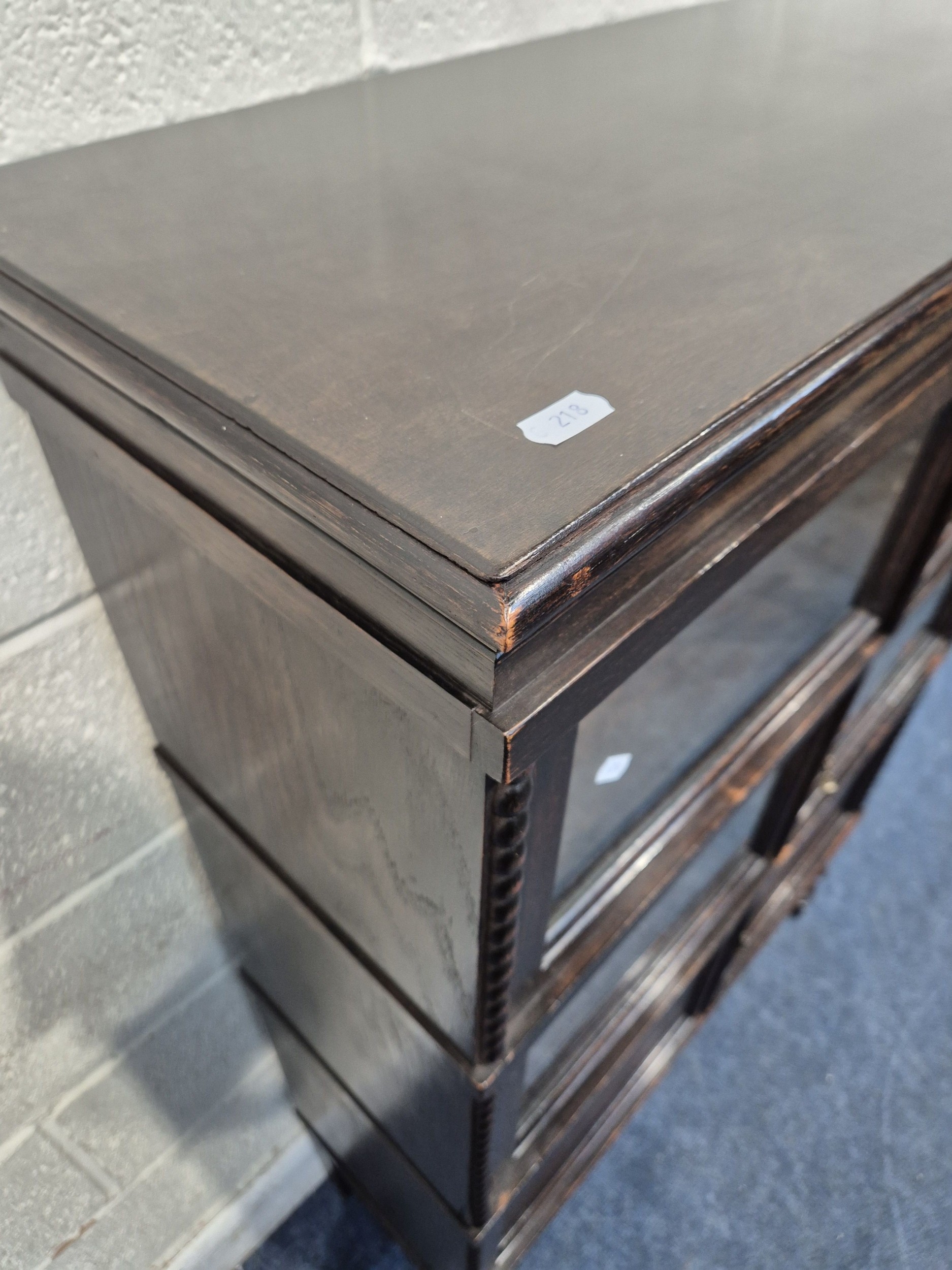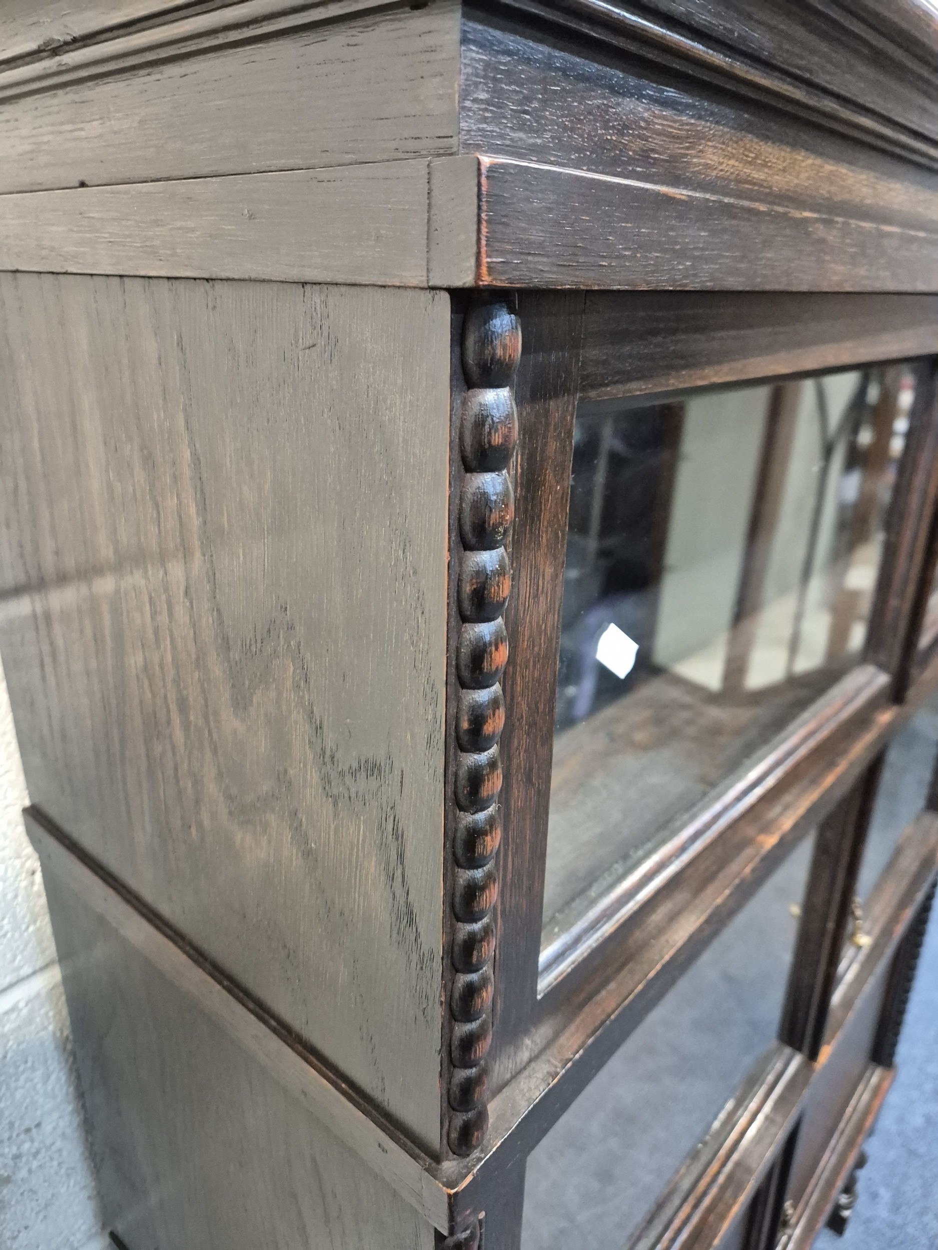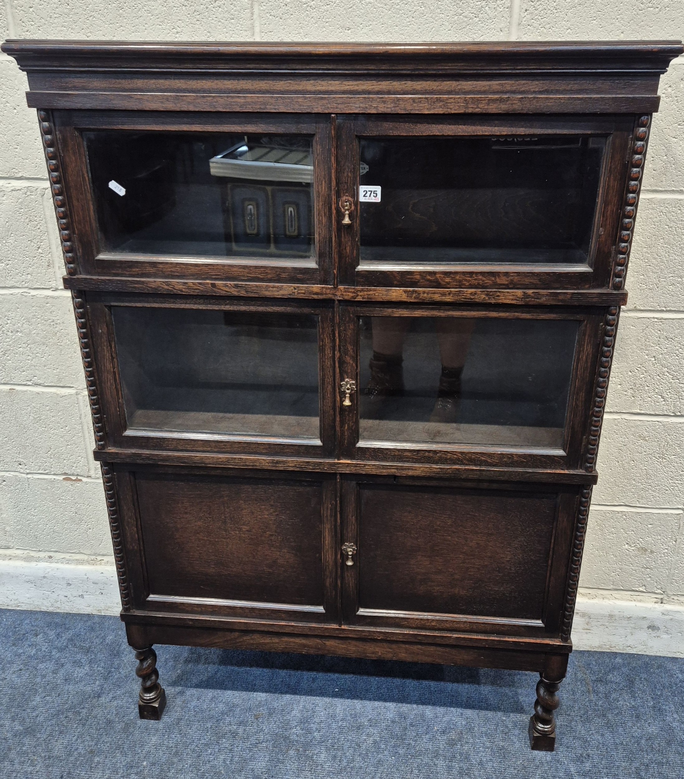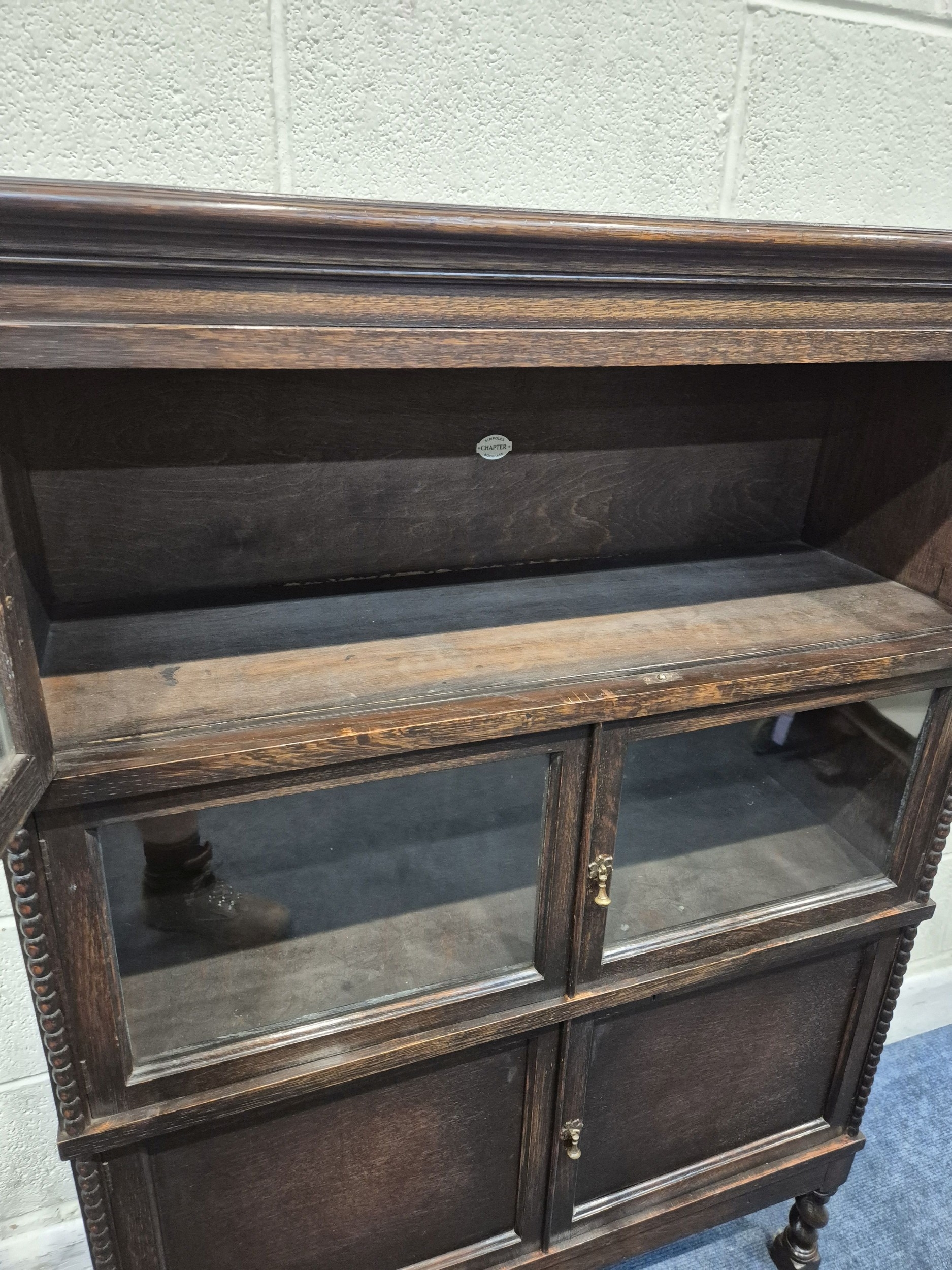 A SIMPOLES CHAPTER OAK SECTIONAL BOOKCASE, with two pairs of glass doors and two cupboard doors, raised on barley twist legs with block feet, width 90cm x depth 30cm x height 132cm, condition report: marks, scuffs, other wear and usage