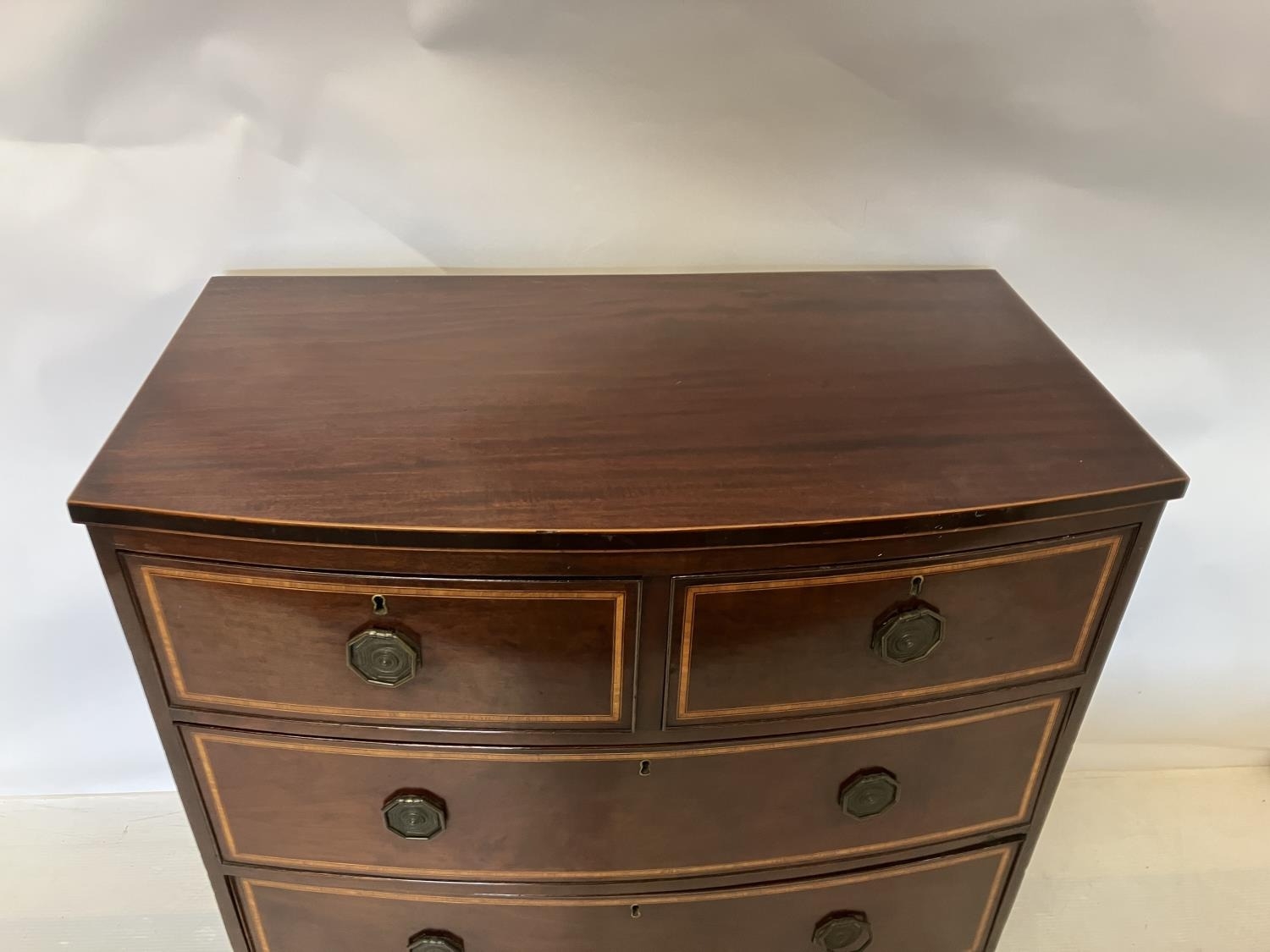 Good antique bow shaped chest of 2 short and 2 long drawers raised on splay feet. (O'Connell, Cork)