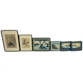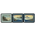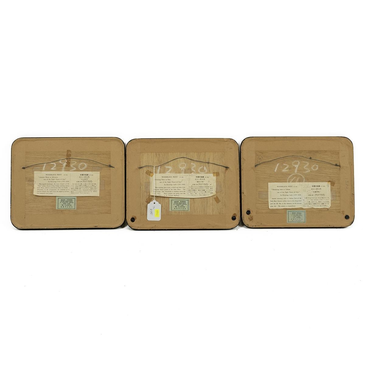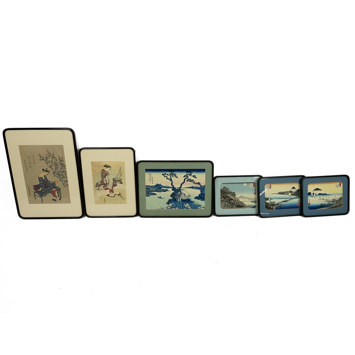 Group of vintage Japanese framed woodblock prints to include: Hiroshige Ando (1797-1858), 3x views of Omi, each frame W 31cm, H 25cm; Suzuki Harunobu, Courtesan Hinazura flying on a crane, frame W 32cm, H 43cm; Hokusai, Lake Suwa in Shinshn, from '36 views of Fugi', frame W 46cm, H 35cm; and Toyonobu, girl relaxing on a bamboo bench, c1900, frame W 39cm, H 54cm. (6)